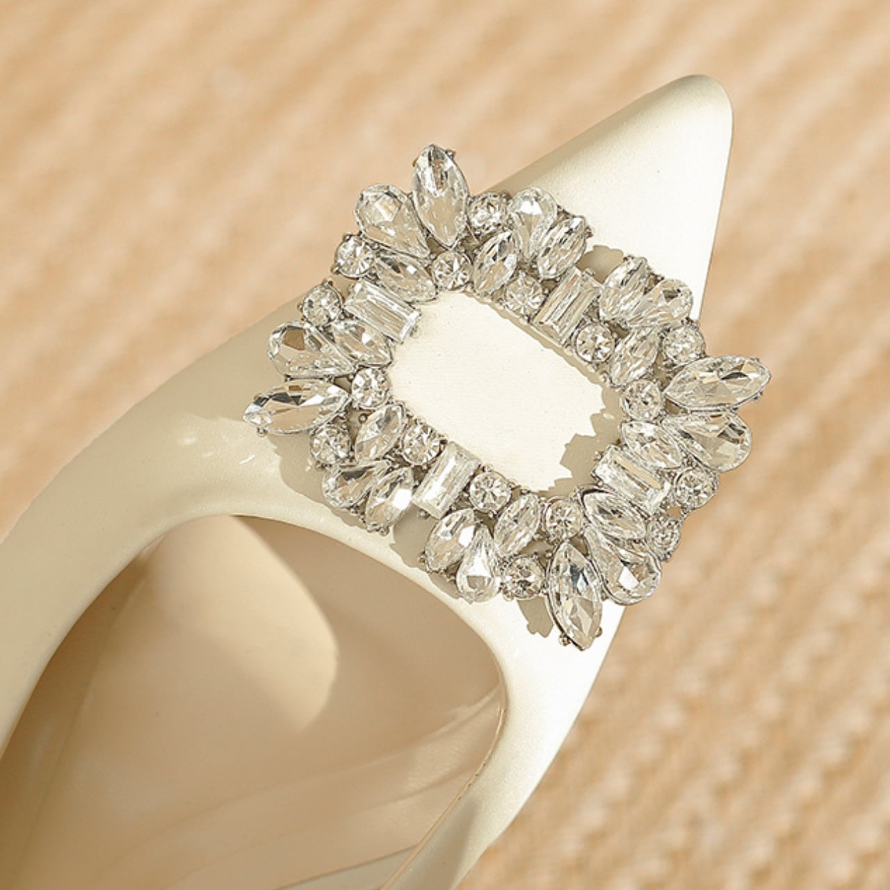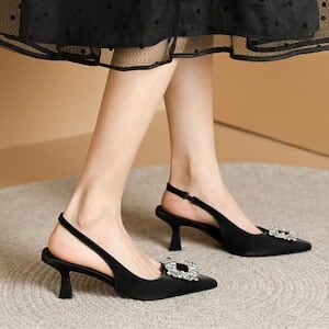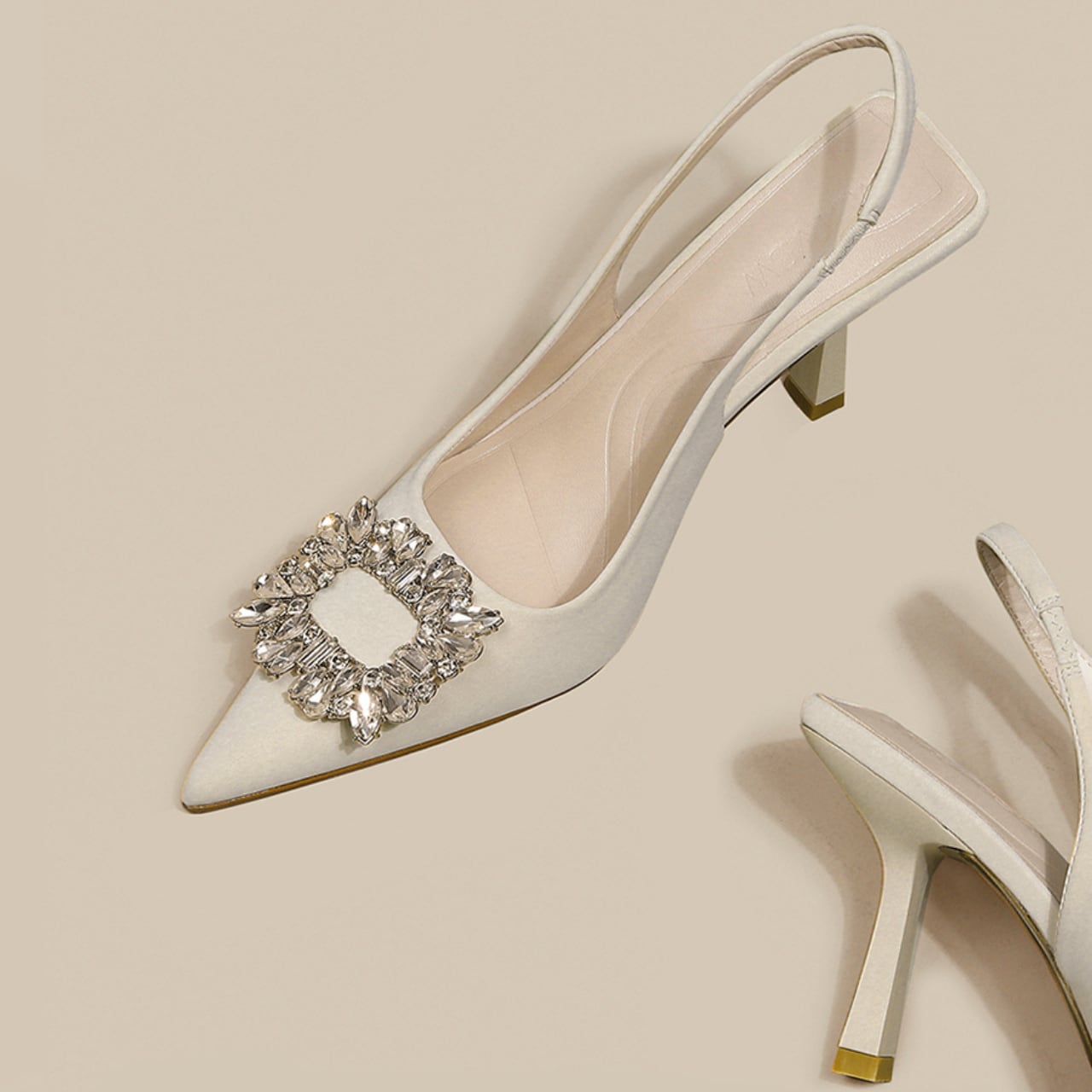 エレガントなビジューが輝く、洗練されたスリングバックミュール。