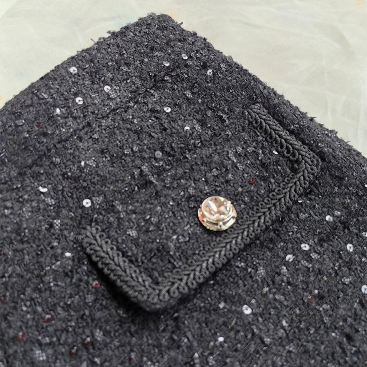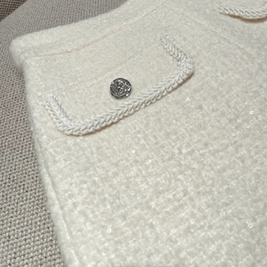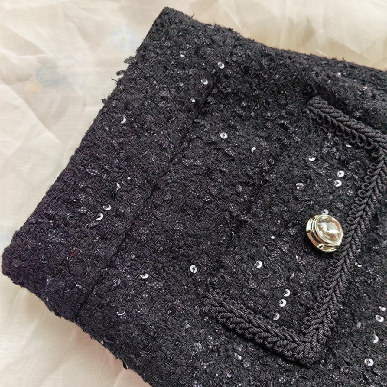 柔らかなツイード生地ときらめく装飾が、大人の冬スタイルに上品な可愛らしさをプラス。