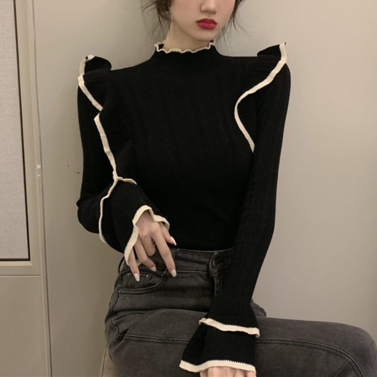 上品な印象を与えるフリルデザインが魅力のハイネックリブニット。