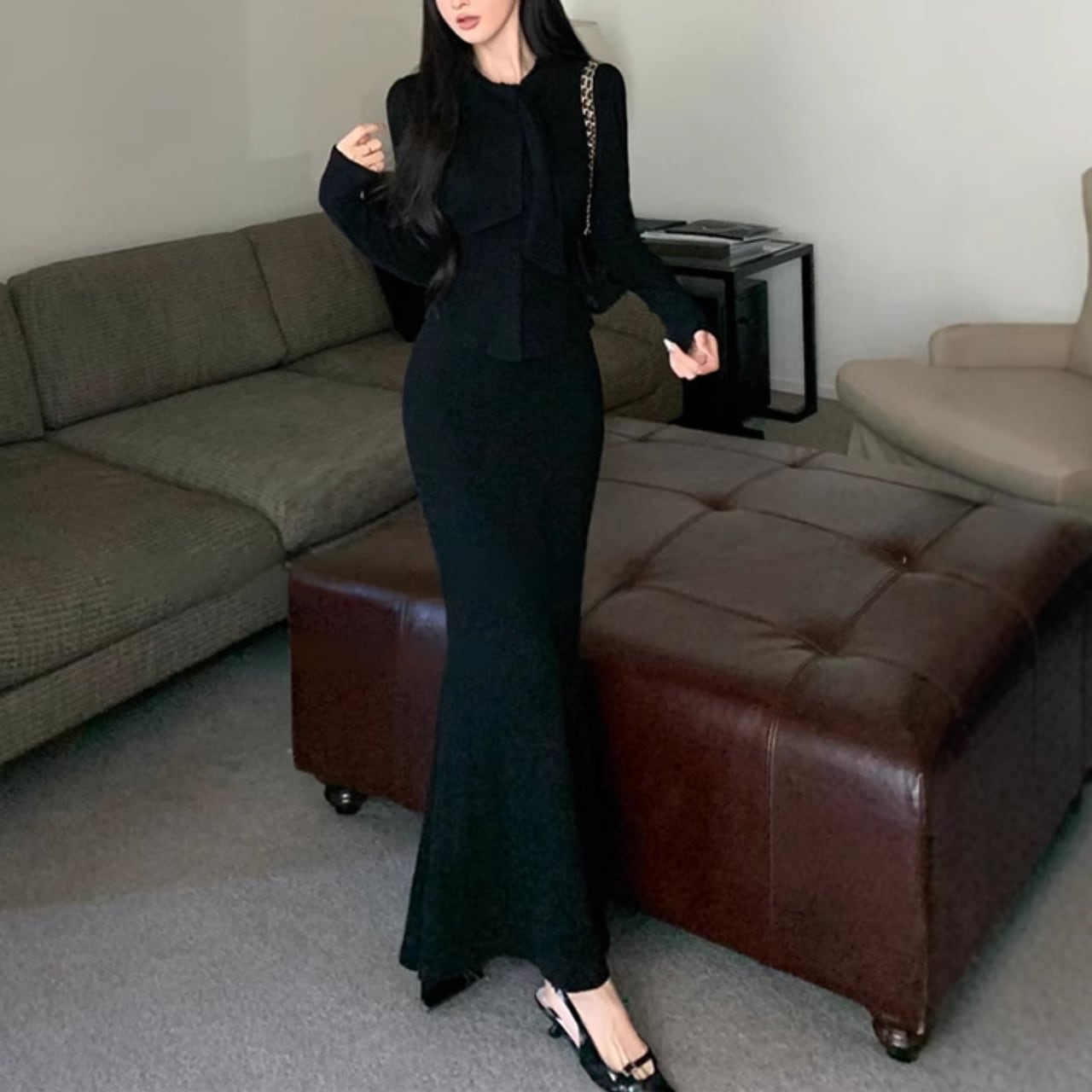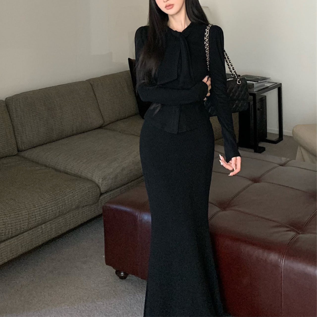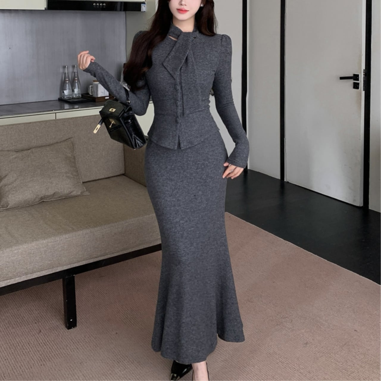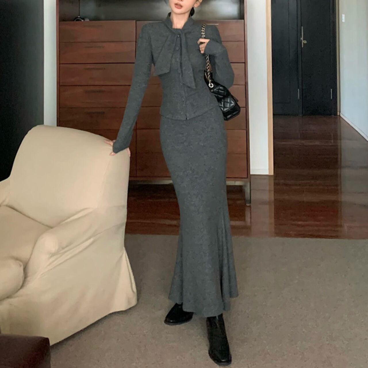 トップスとスカートの統一感あるシルエットが、女性らしい上品さを引き立てます。