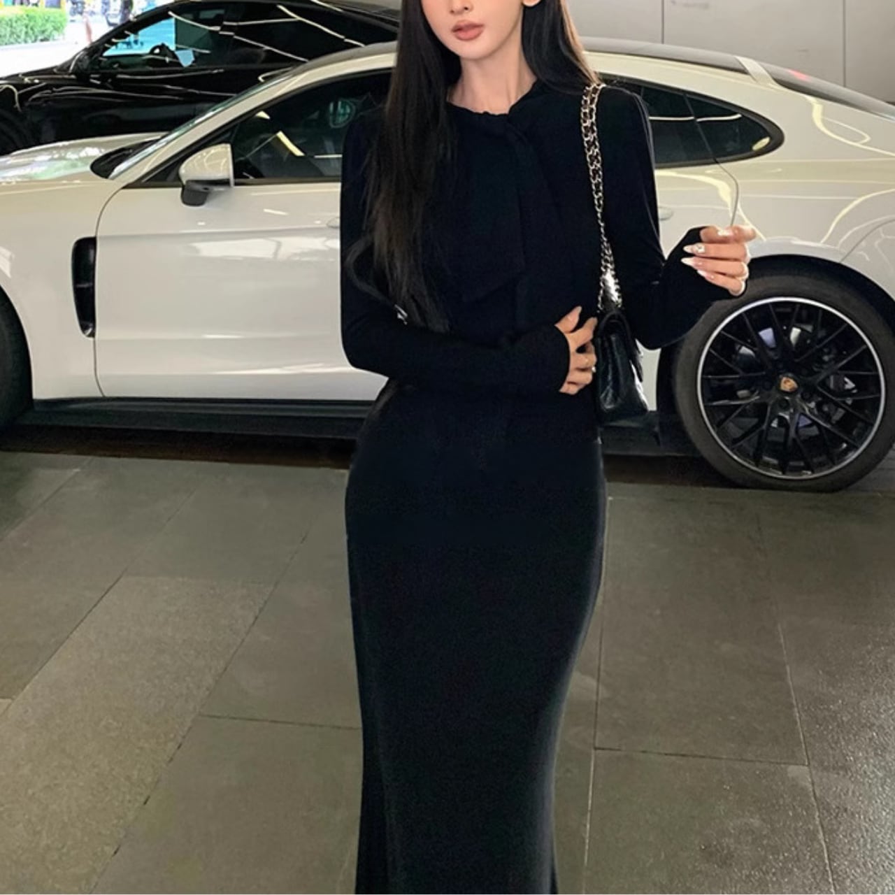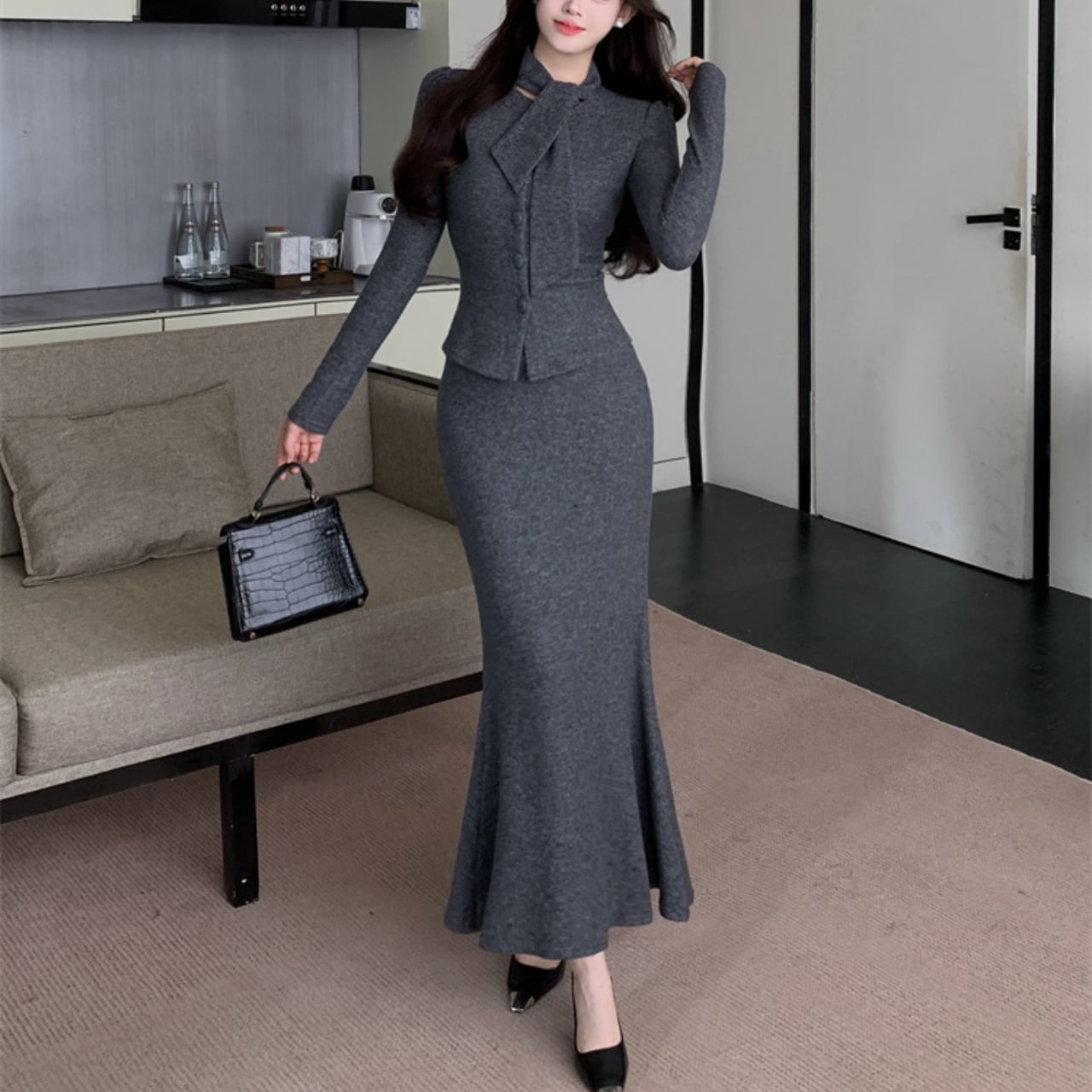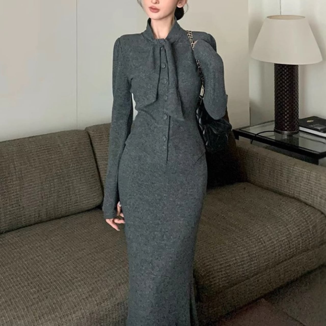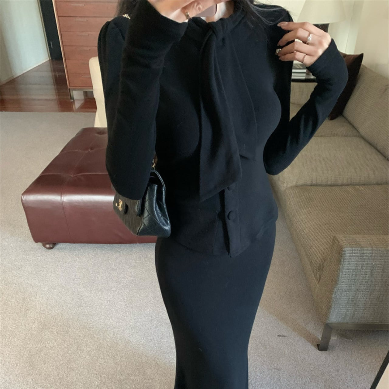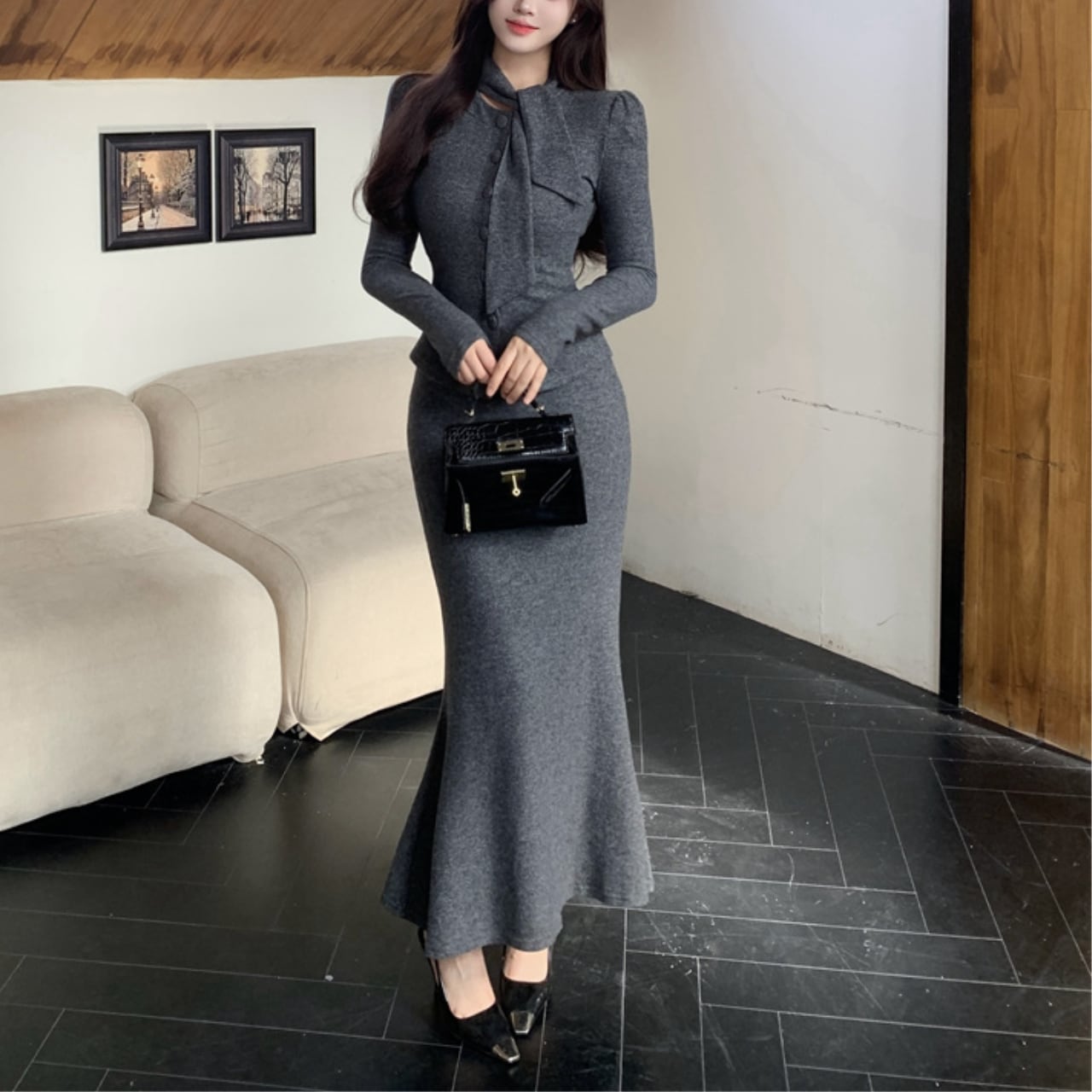 すっきりとしたタイカラーが印象的なニットセットアップ。