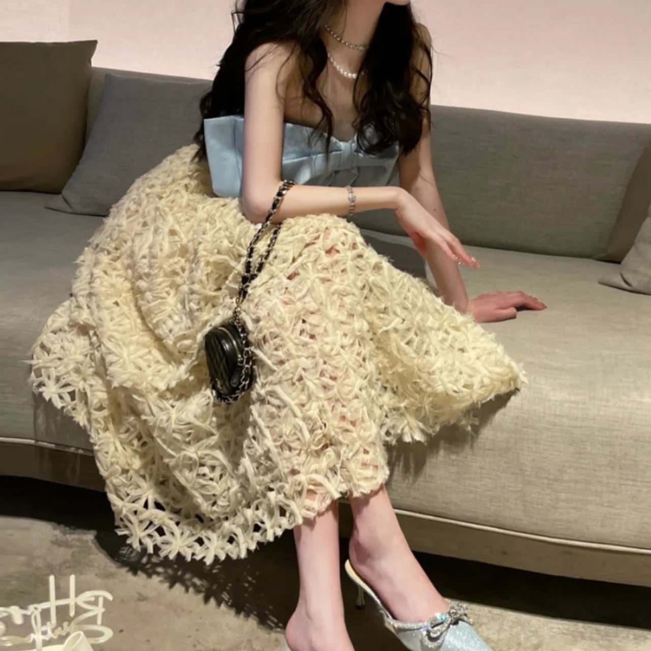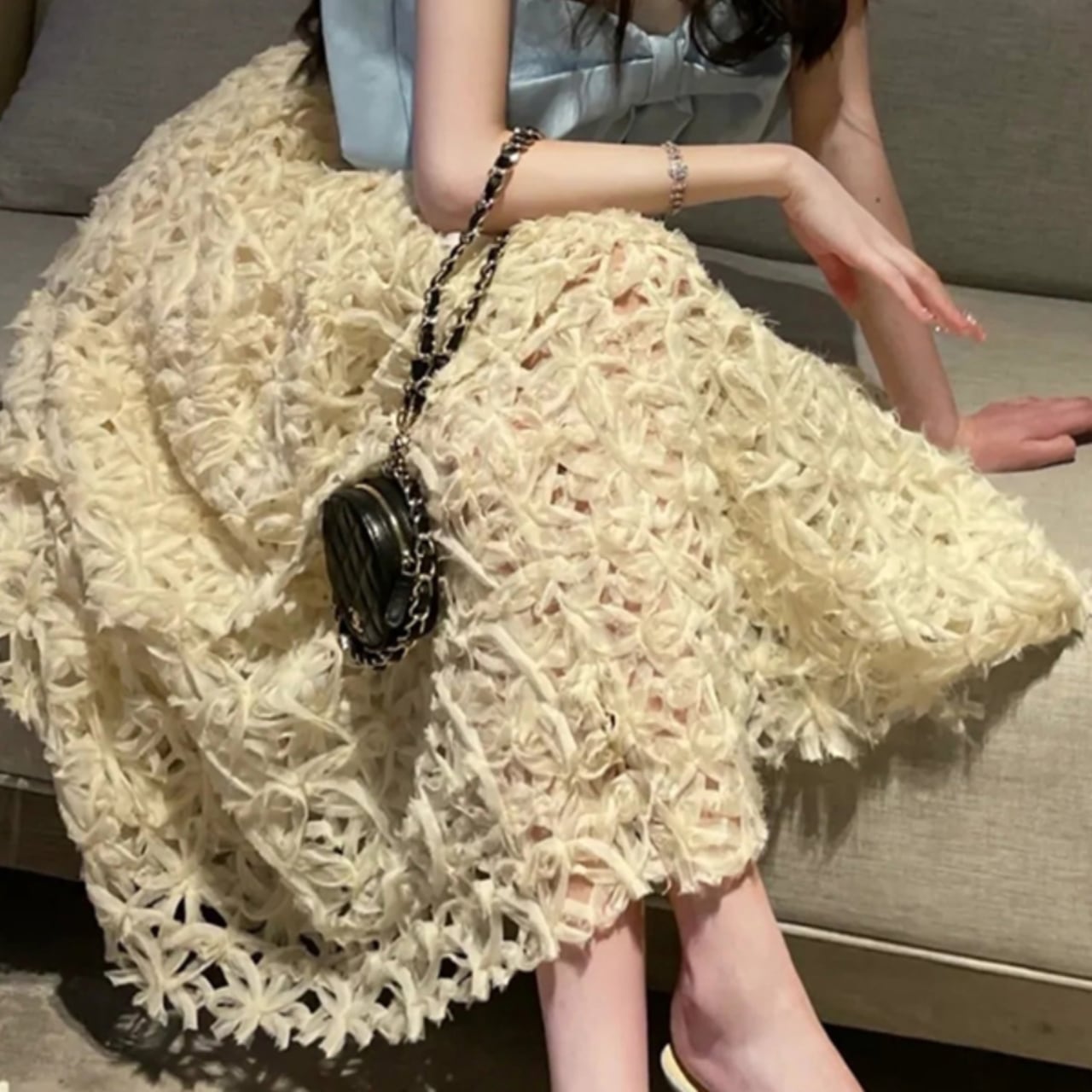 エアリーな質感と奥行きある刺繍が、動くたびにふわりと揺れ、視線を集めます。