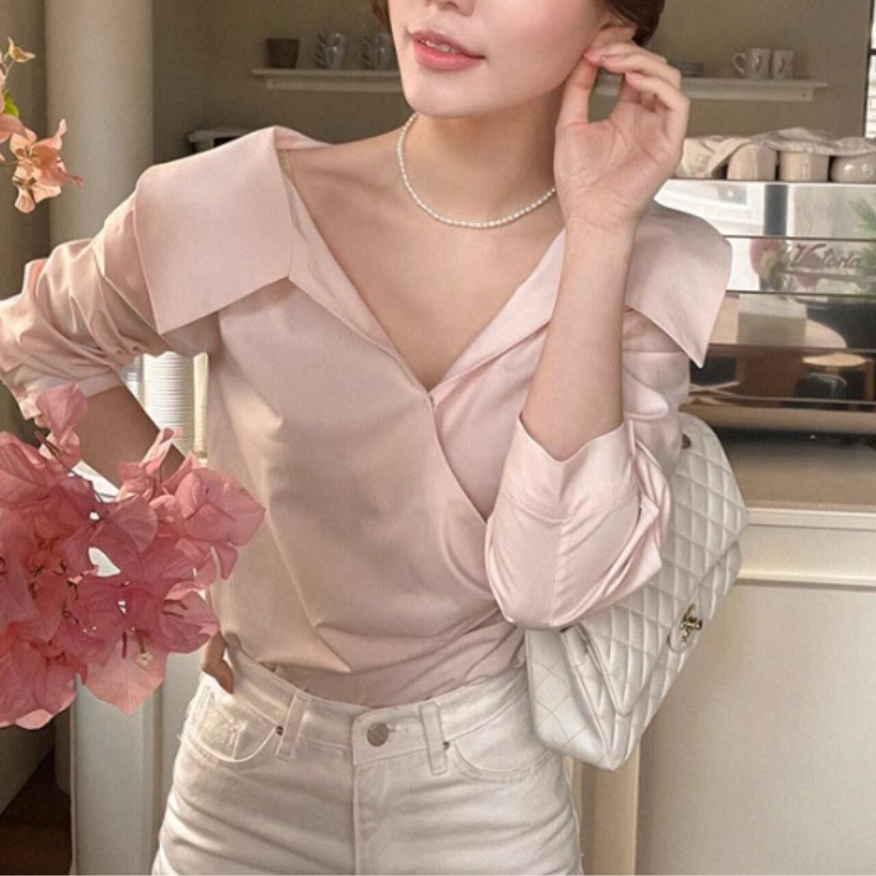 繊細なドレープと、折り返しを効かせたネックデザインが印象的な上品ブラウス。
