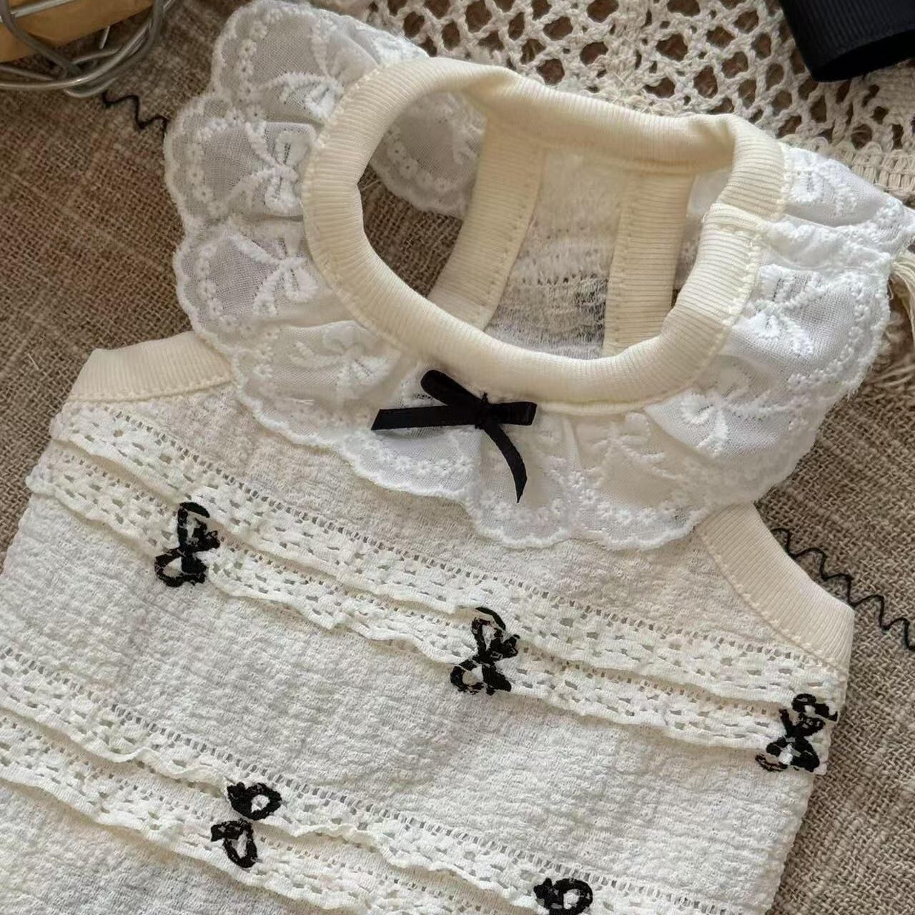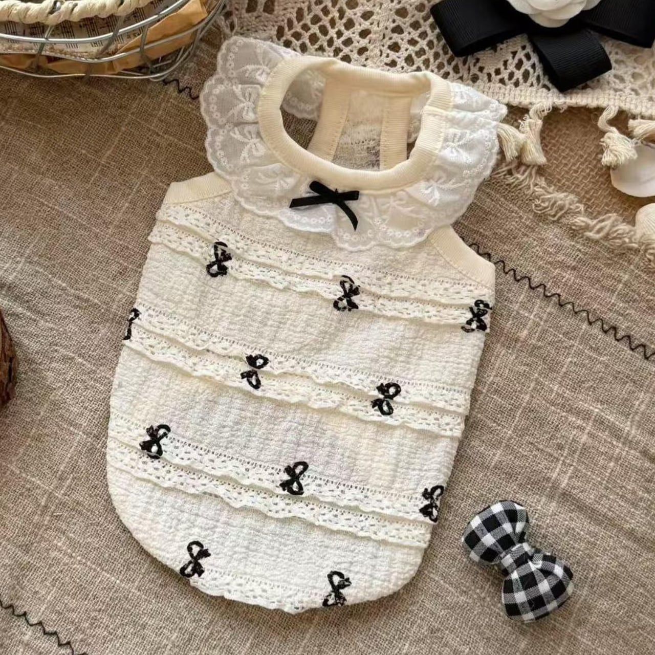 繊細なリボン刺繍とレースのフリルが施された、上品なワンピースデザインのドッグウェア。