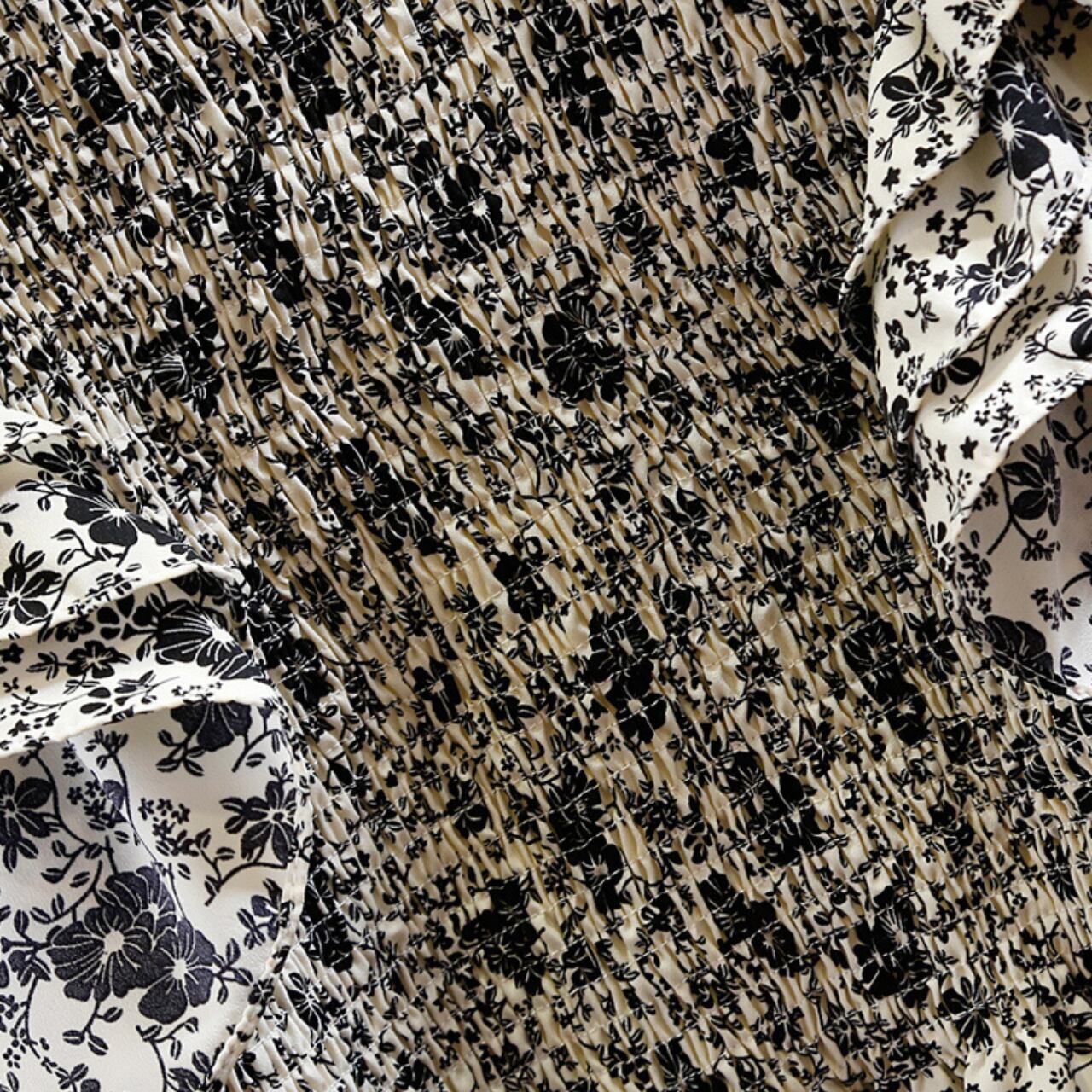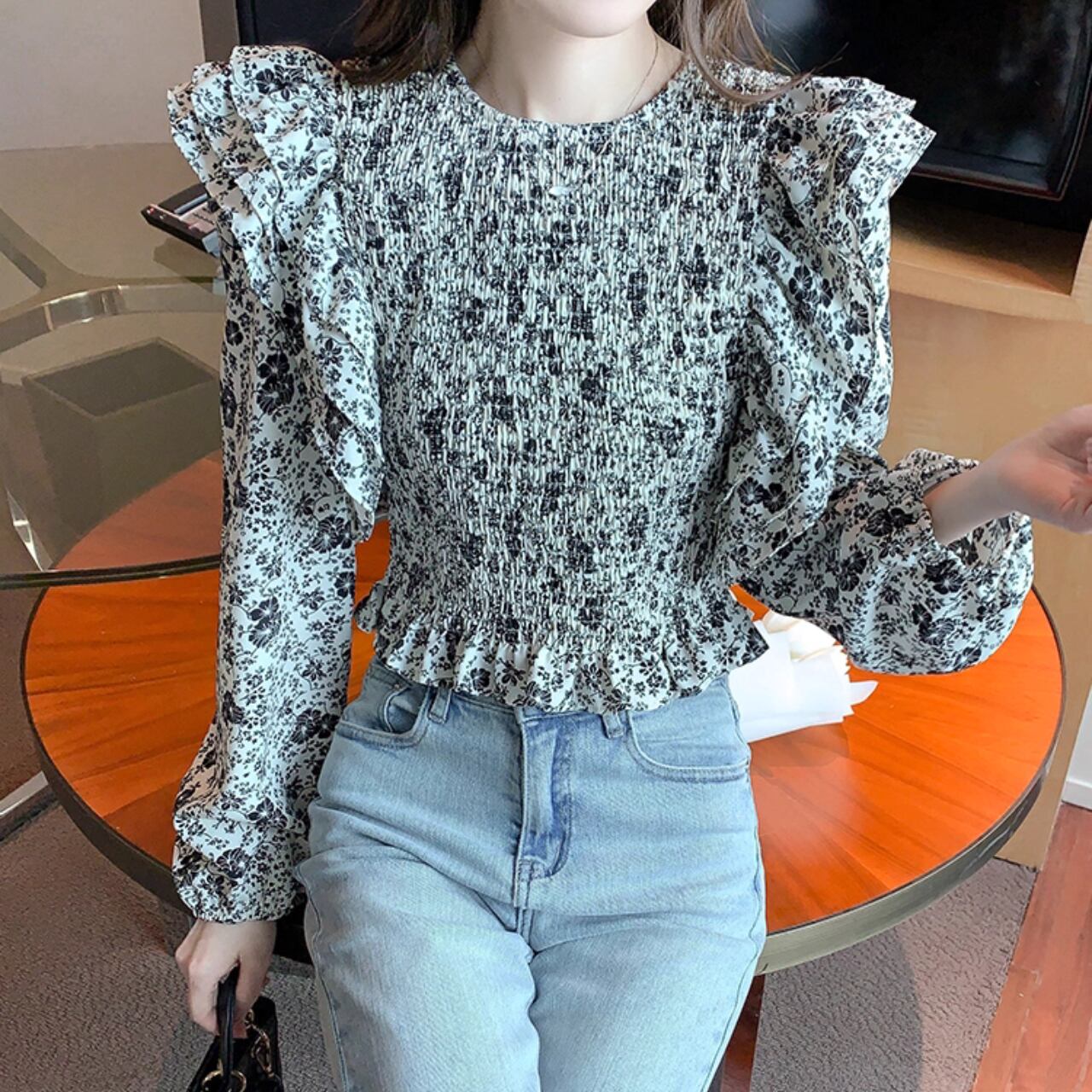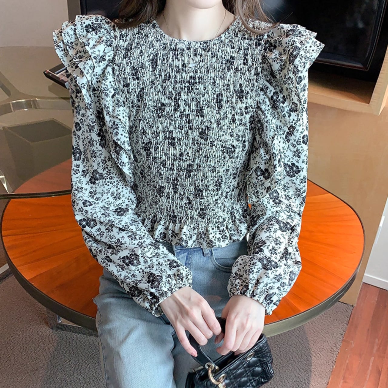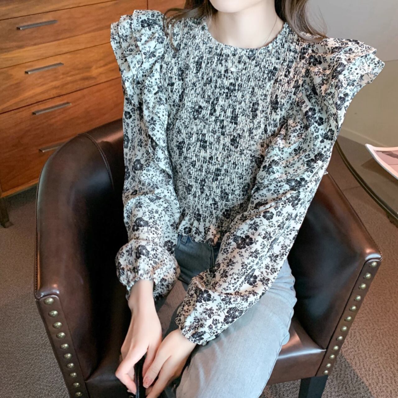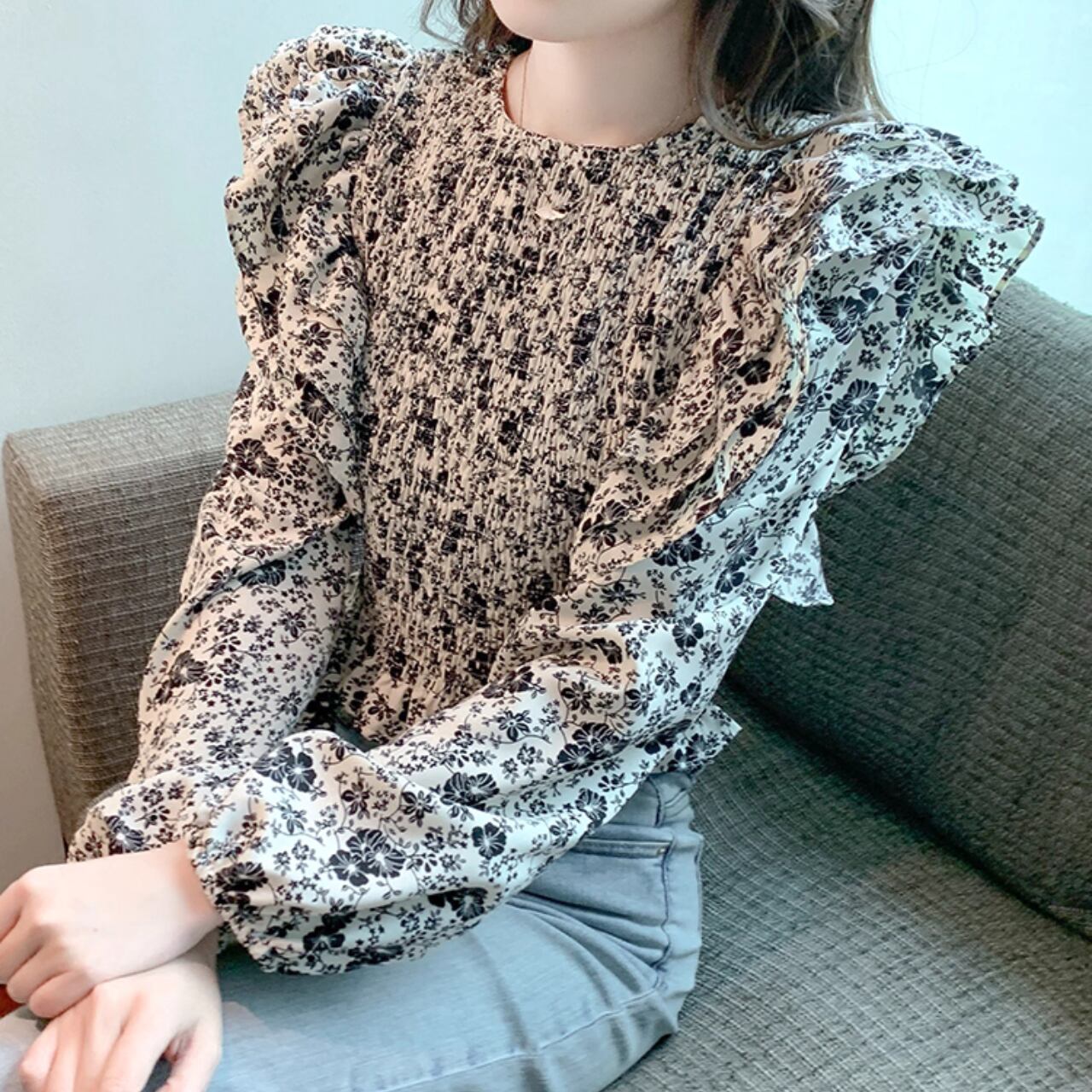 繊細なシャーリングにふんわり重なるフリルスリーブが印象的な、大人フェミニンブラウス。