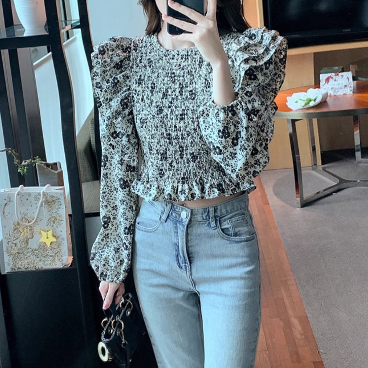 短すぎない上品なクロップド丈がウエストラインをすっきり見せ、どんなボトムともバランスよくコーデが決まります。デニム合わせでも上品にまとまり、一枚で華やかさが出るので、お出かけやデートにもおすすめの優美な一着です。