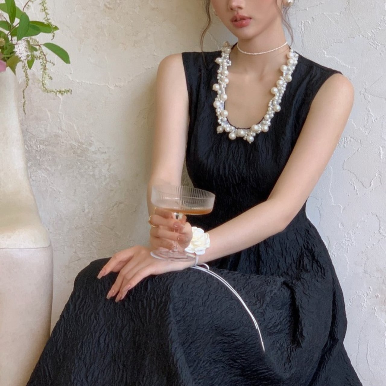 ネックラインにパールをあしらった、上品で華やかなワンピース。