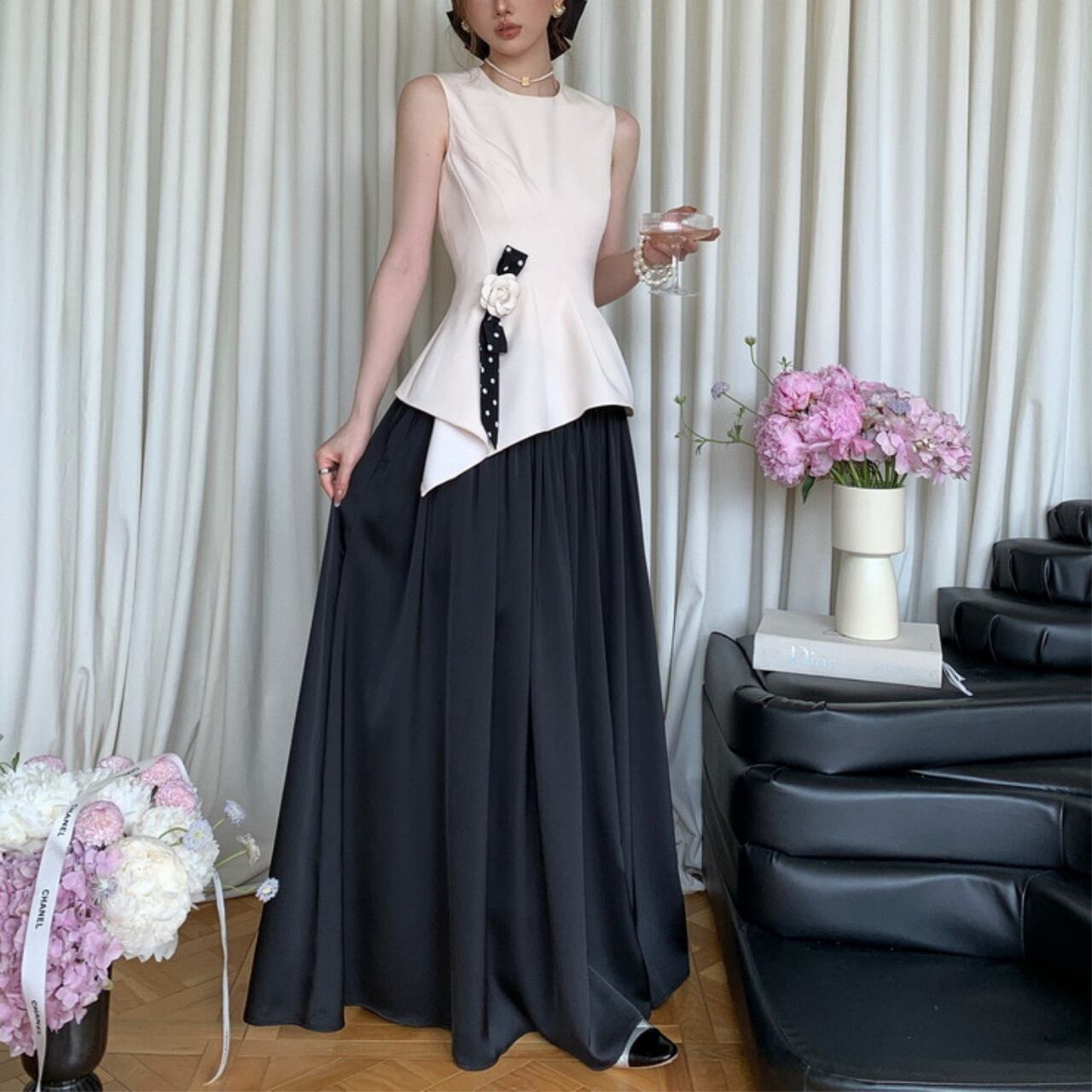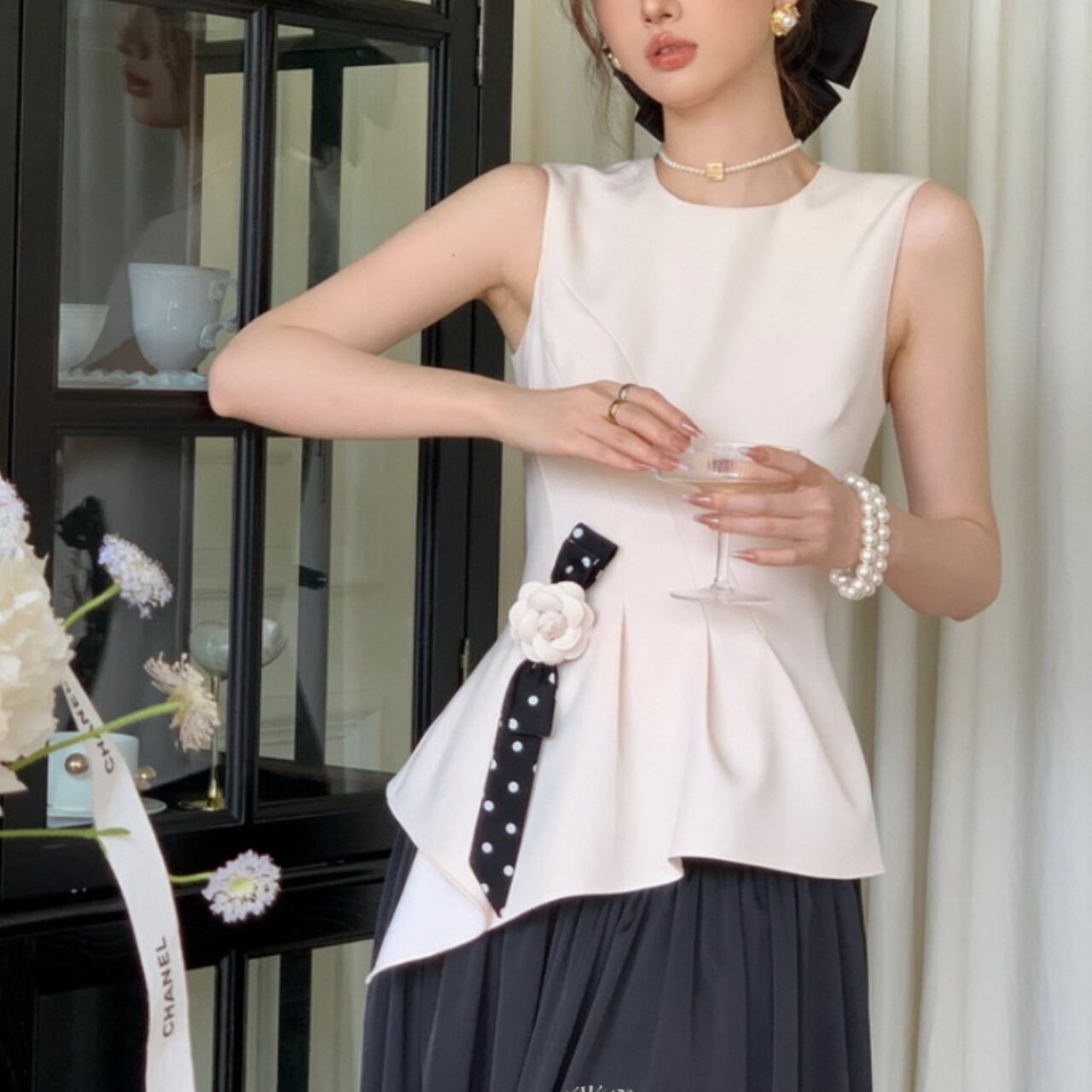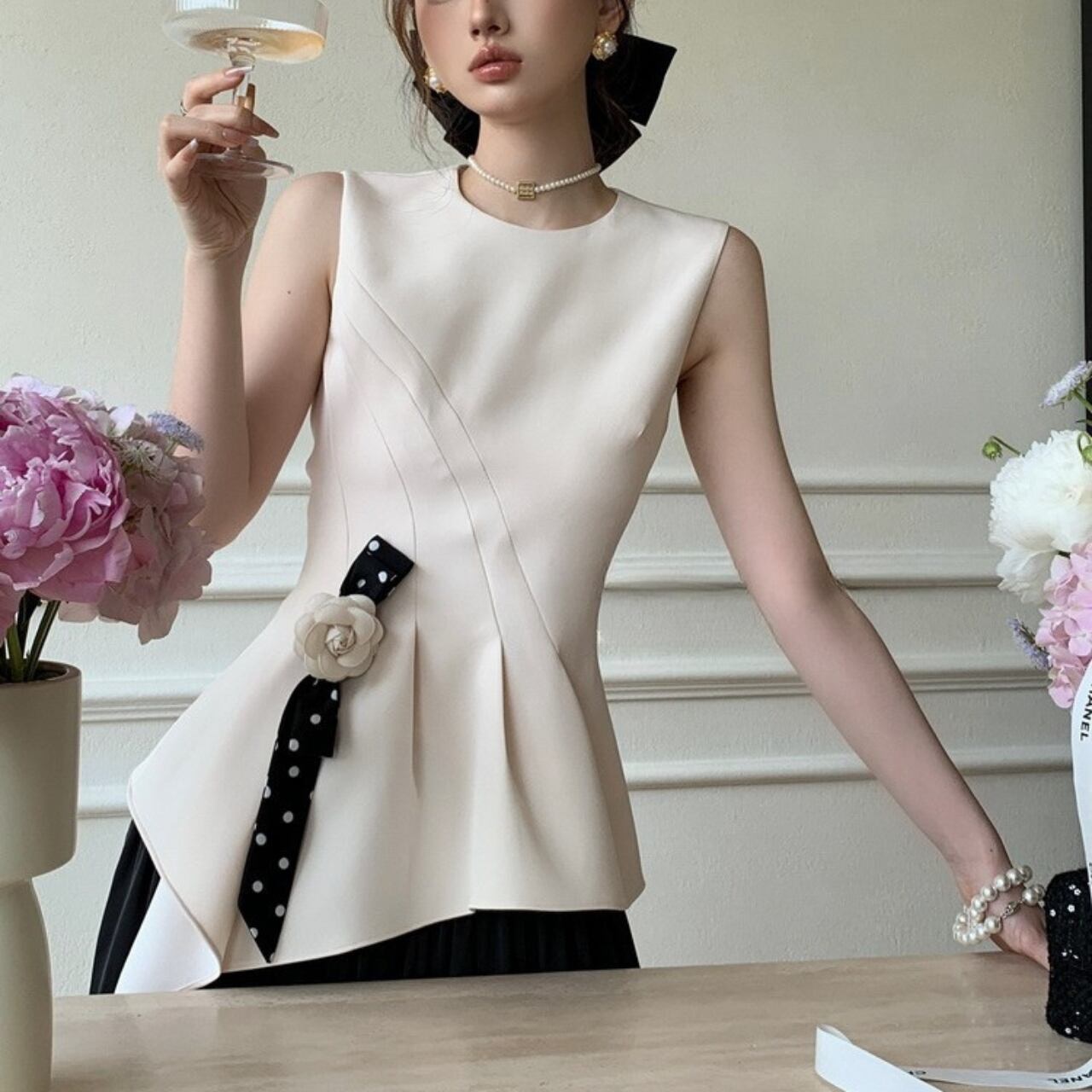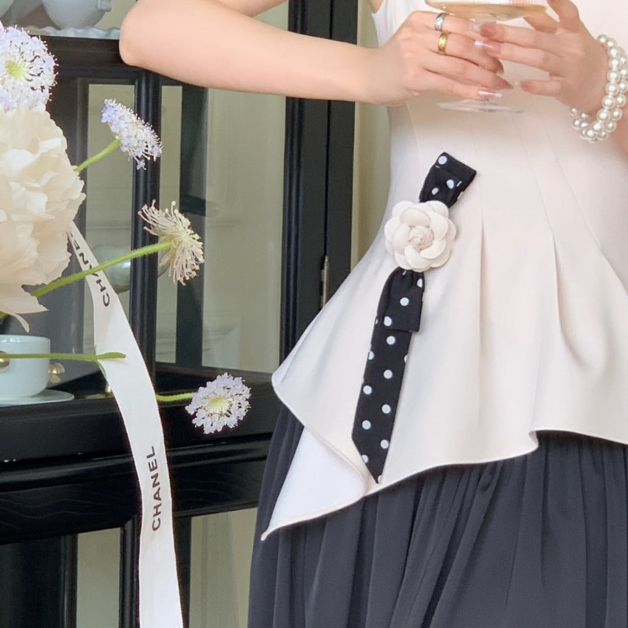 サイドにあしらったドット柄リボンとカメリアモチーフがアクセントとなり、クラシカルな華やかさを演出します。モードなモノトーンコーデにも、フェミニンなスタイルにも映える、大人の気品を宿したトップスです。