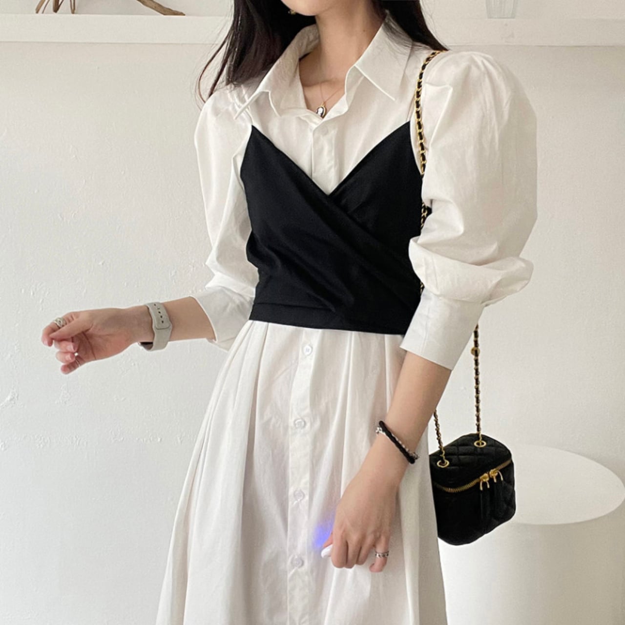 上品なシャツワンピースに、後ろでクロスして巻くことでビスチェ風にアレンジできるレイヤードデザインをプラス。