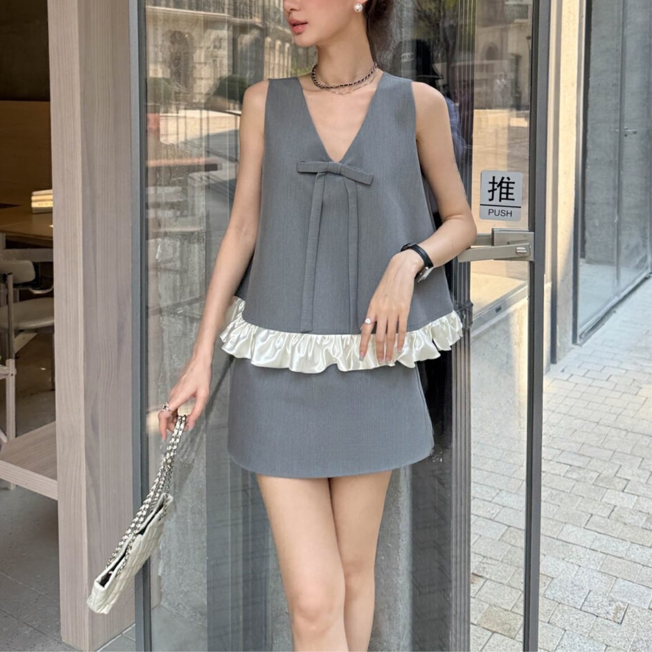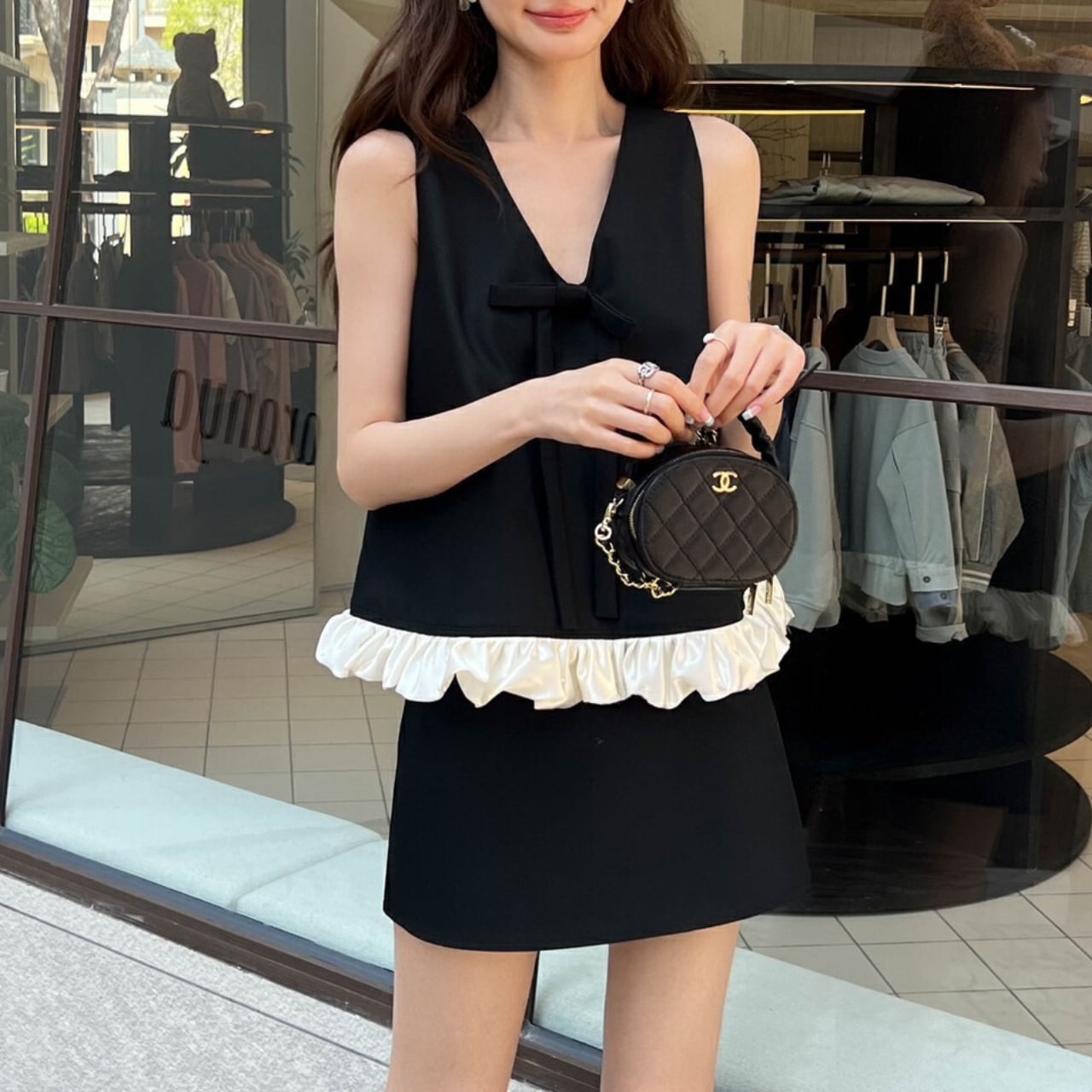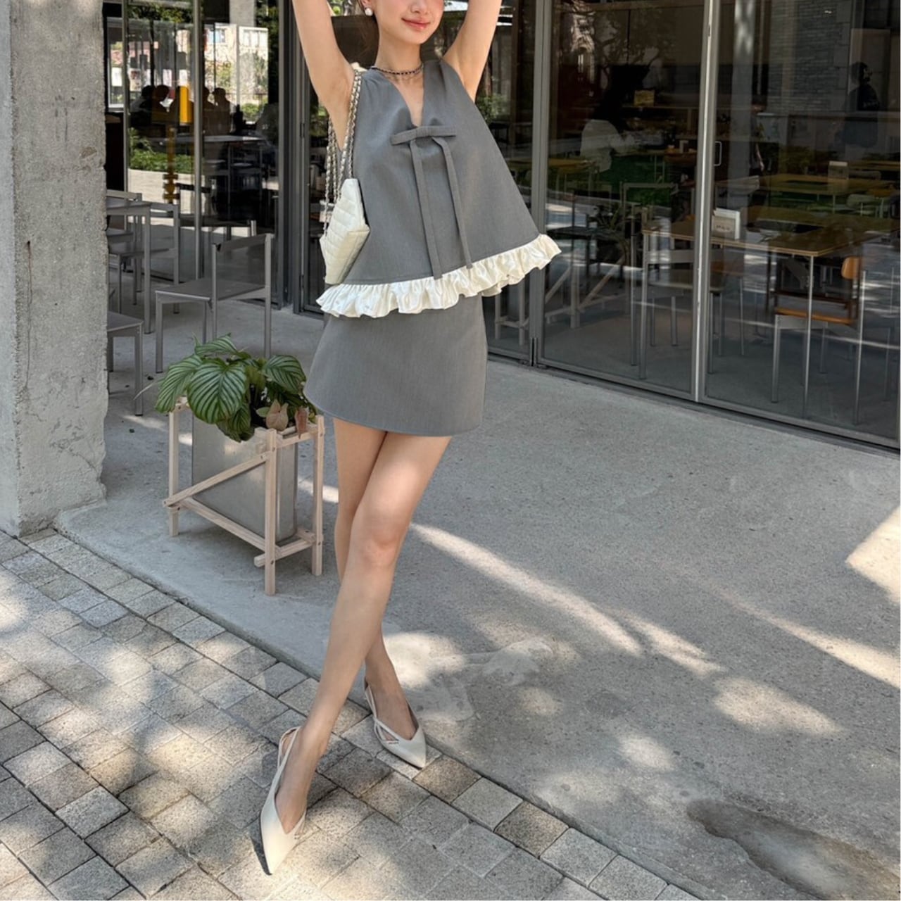 上品なリボンとフリルがアクセントになった、洗練された印象のセットアップ。