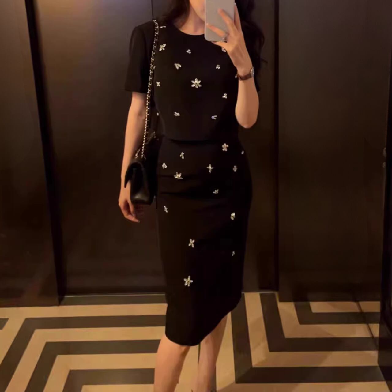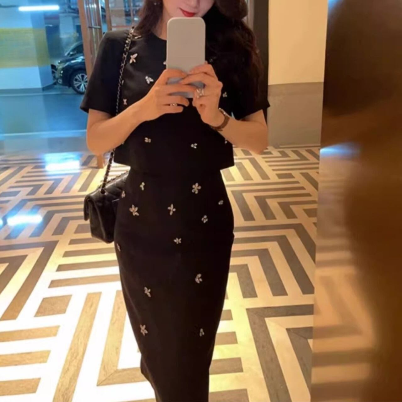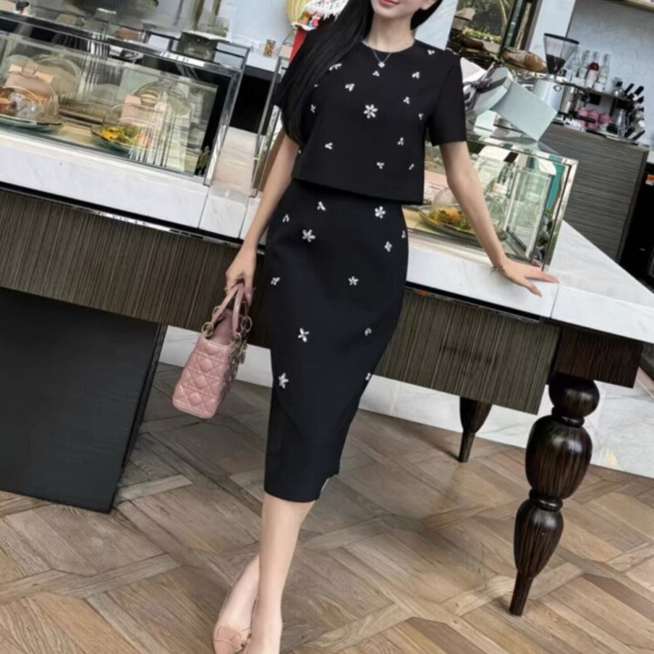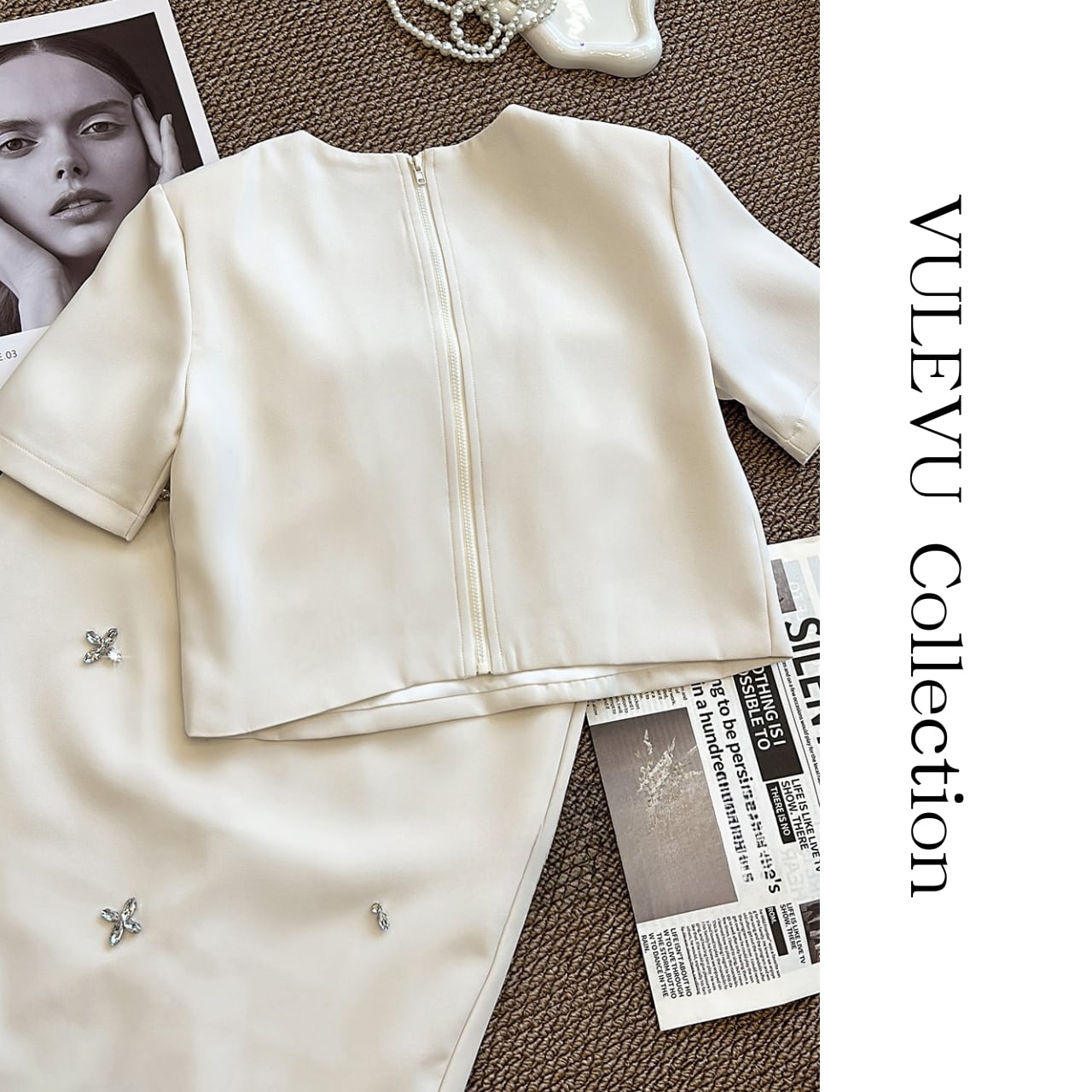 上品なショート丈トップスとタイトスカートの組み合わせが、洗練されたシルエットを演出します。それぞれ単品でも着まわしやすく、オケージョンやディナーシーンにも映える一着です。