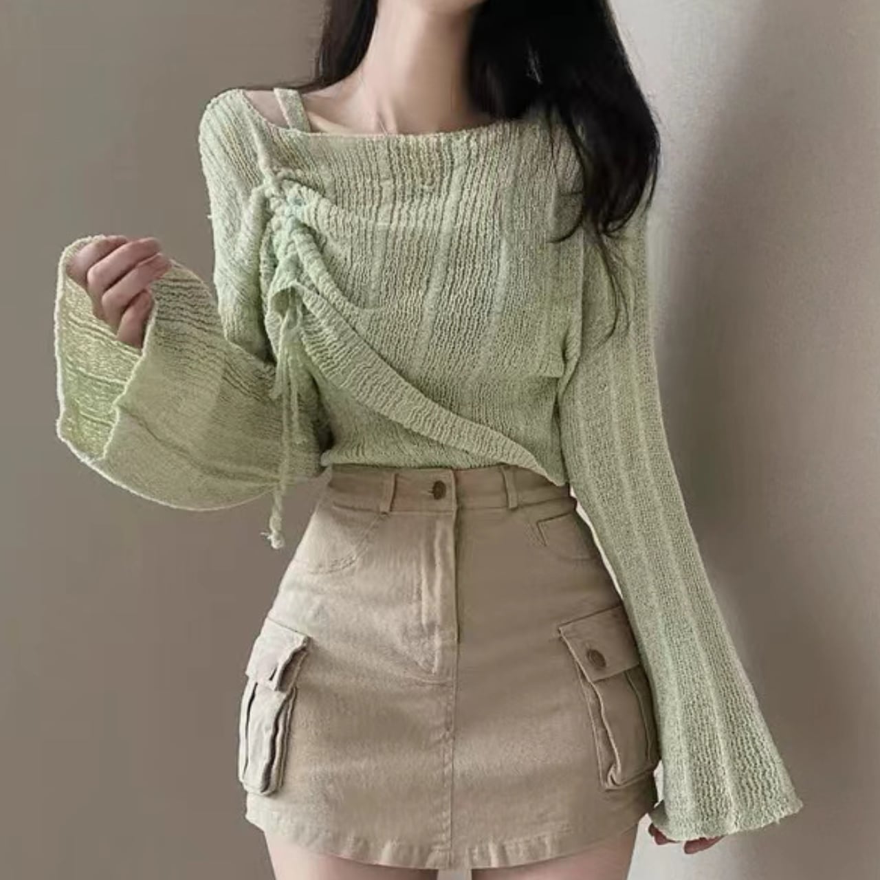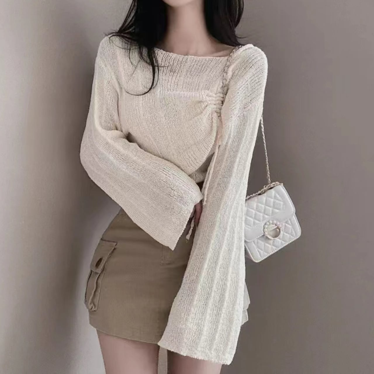 華やかな袖口と、片側にあしらったドローストリングデザインが印象的なニットプルオーバー。