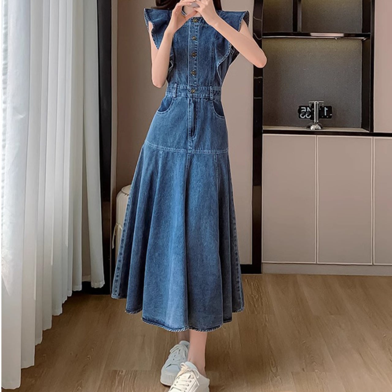 肩にあしらわれたフリルスリーブが華やかさを添える、大人のデニムワンピース。