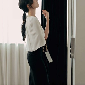 きれいめパンツと合わせればオフィススタイルに、タイトスカートと合わせればお食事会やセレモニーにも映える万能トップスです。