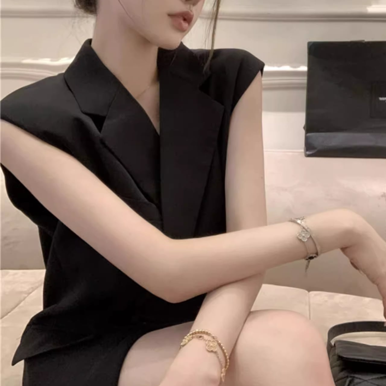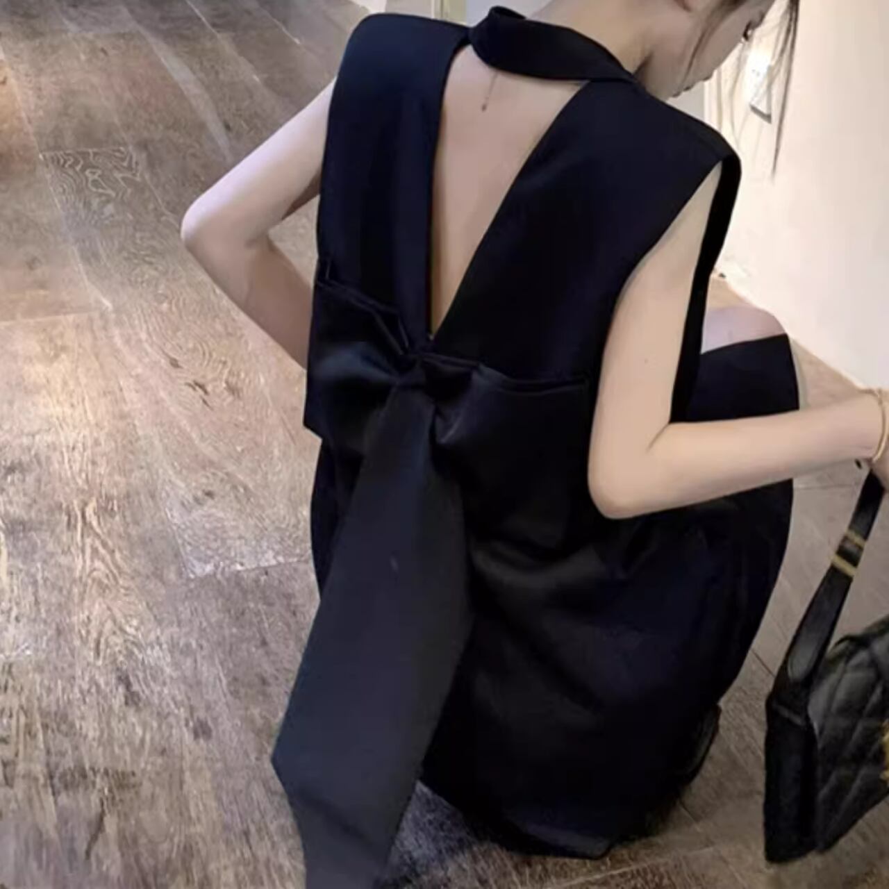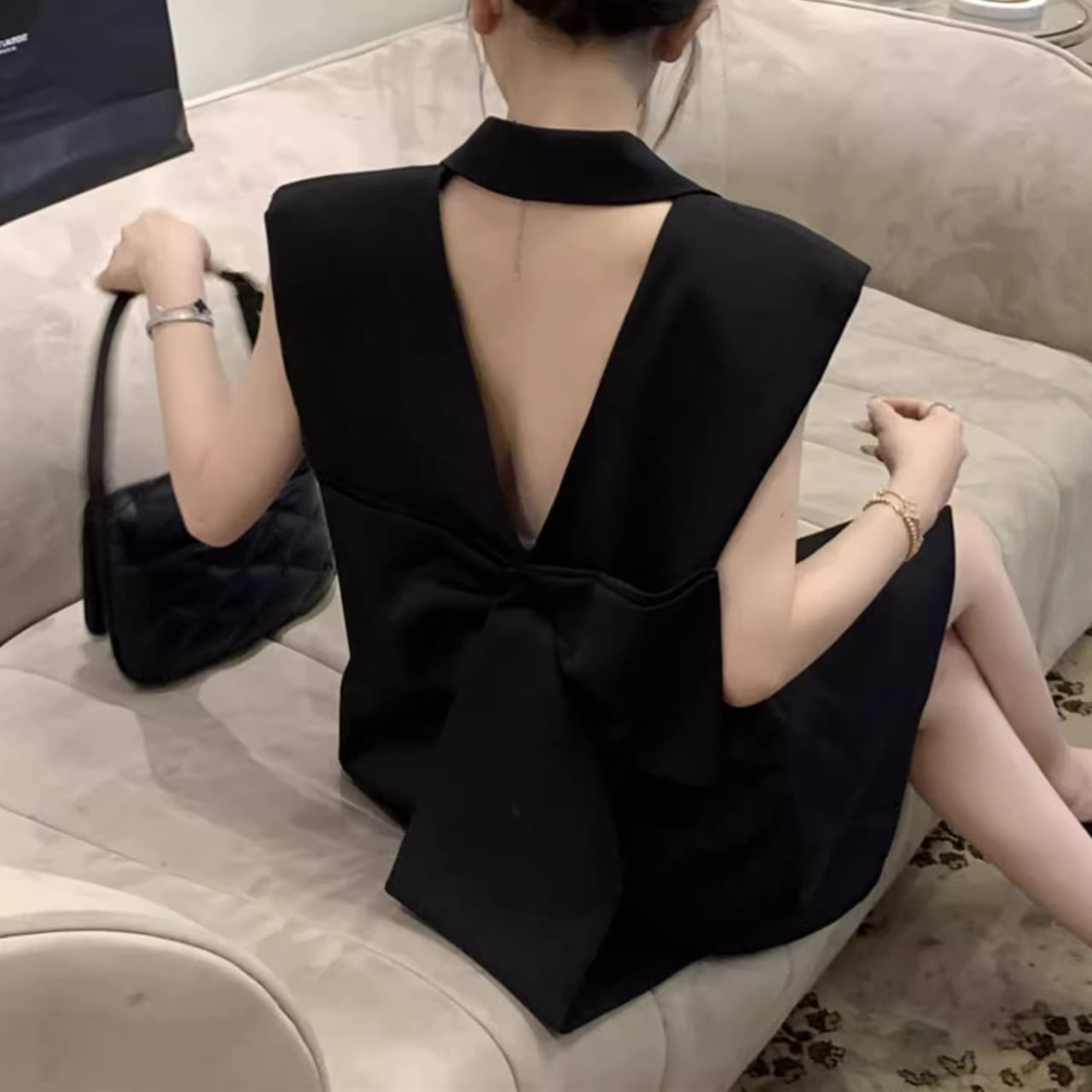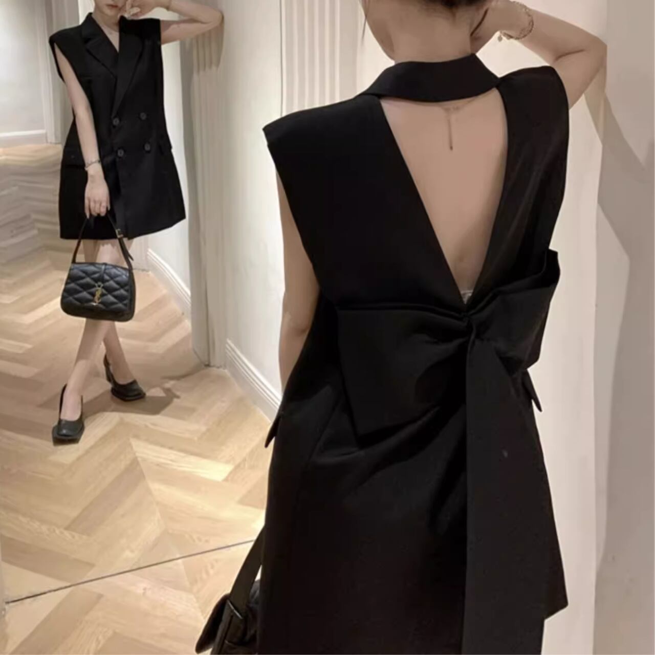 テーラード風のフロントデザインと、大胆に開いた背中のVラインが絶妙なコントラスト。