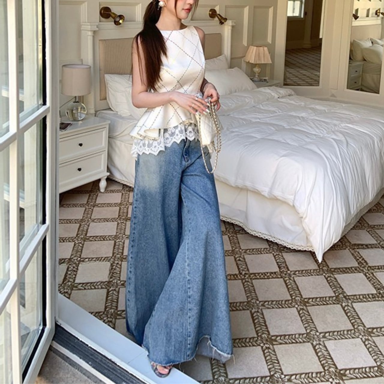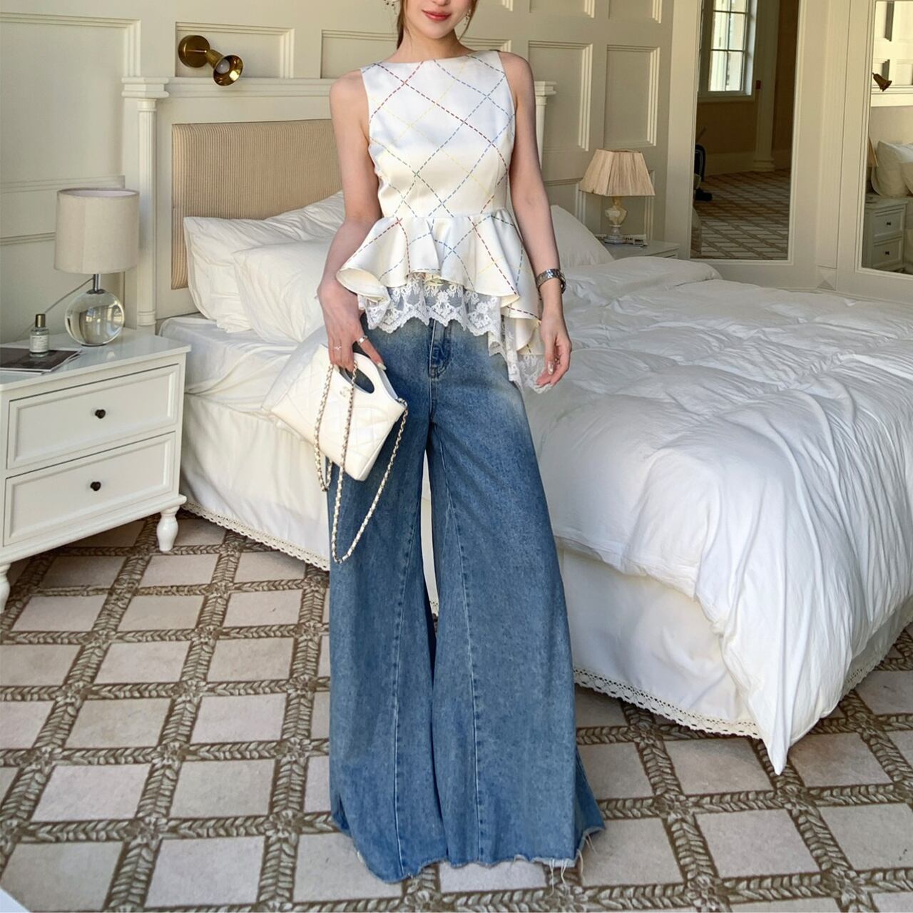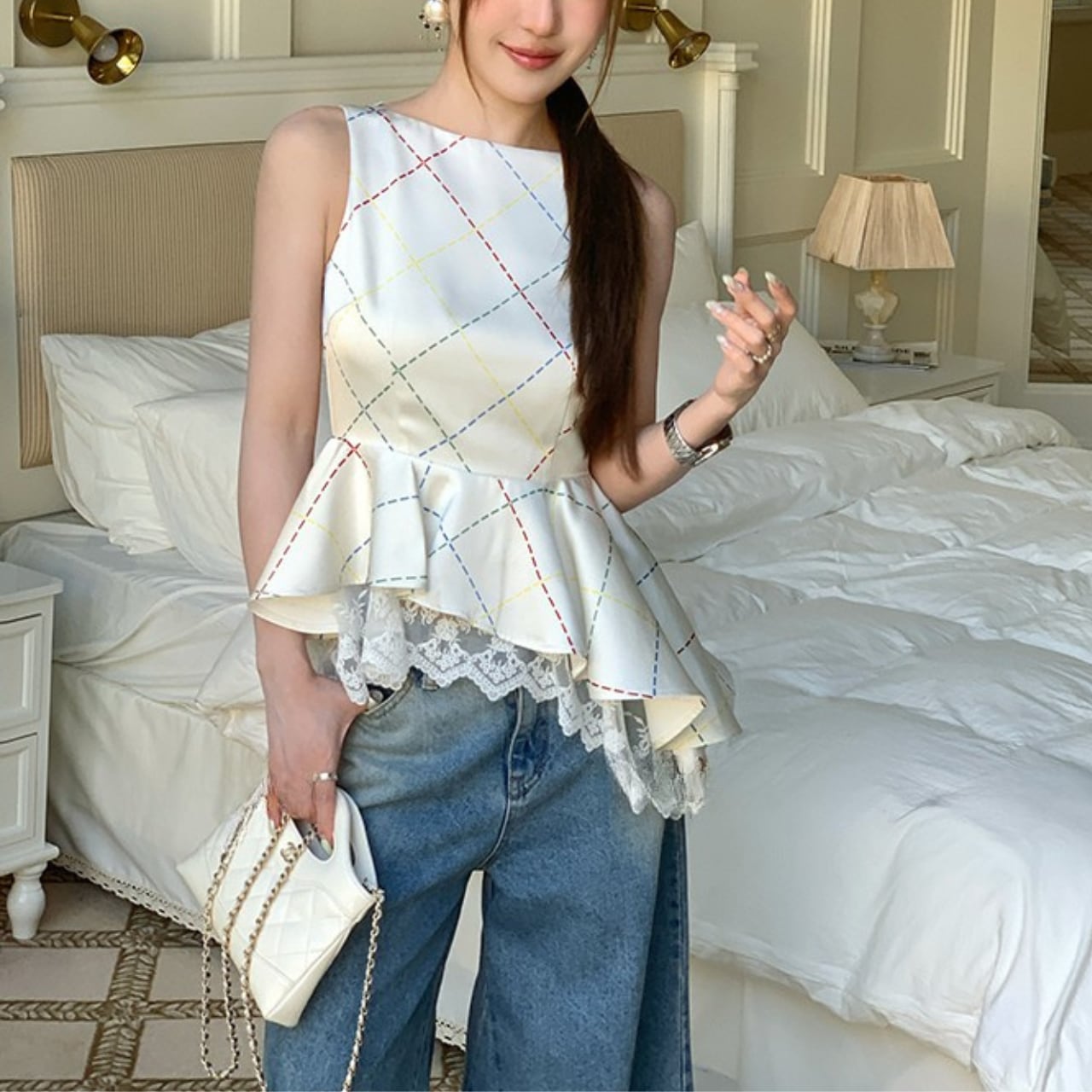 ほんのり光沢のあるチェック柄が上品で、カジュアルなデニムにも女性らしい甘さをプラスします。一枚で着映えが叶う、特別な日にもおすすめの一着です。