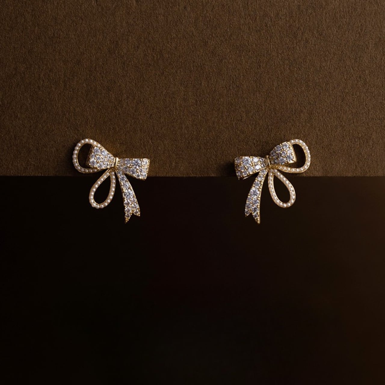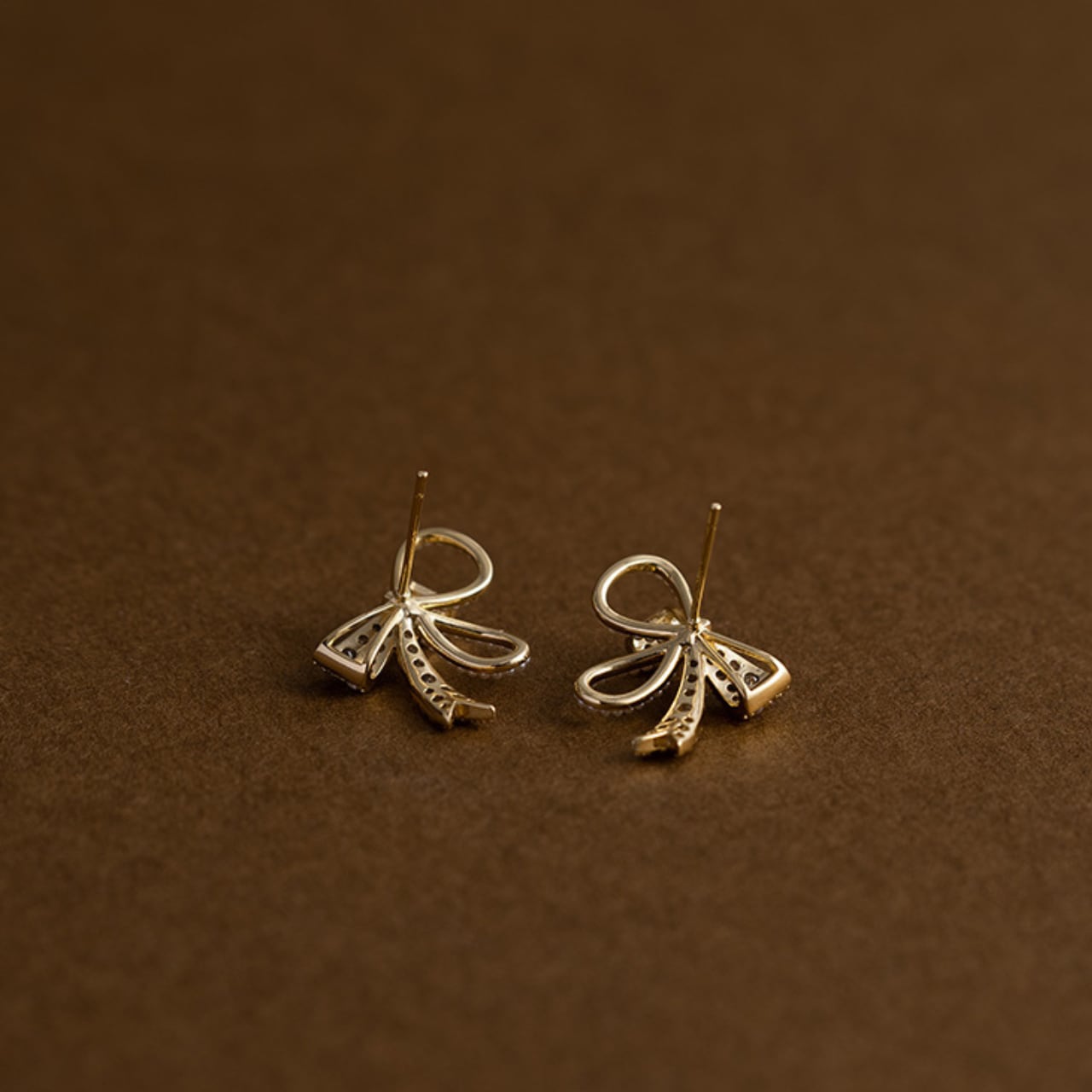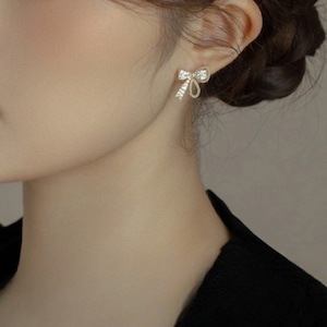 繊細なリボンモチーフにきらめくストーンを丁寧にあしらった、華やかな印象のパヴェピアス。