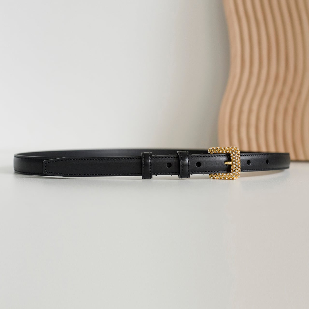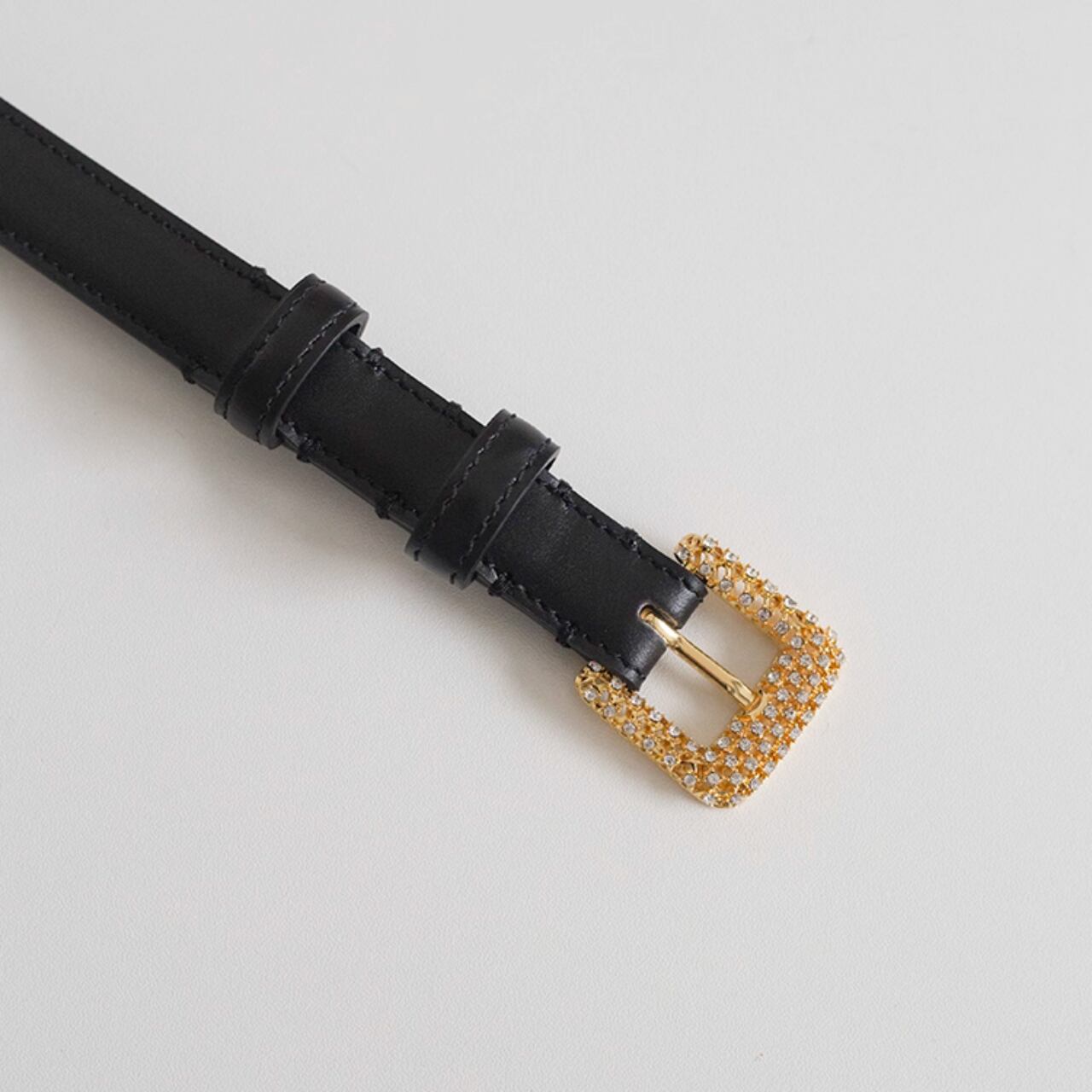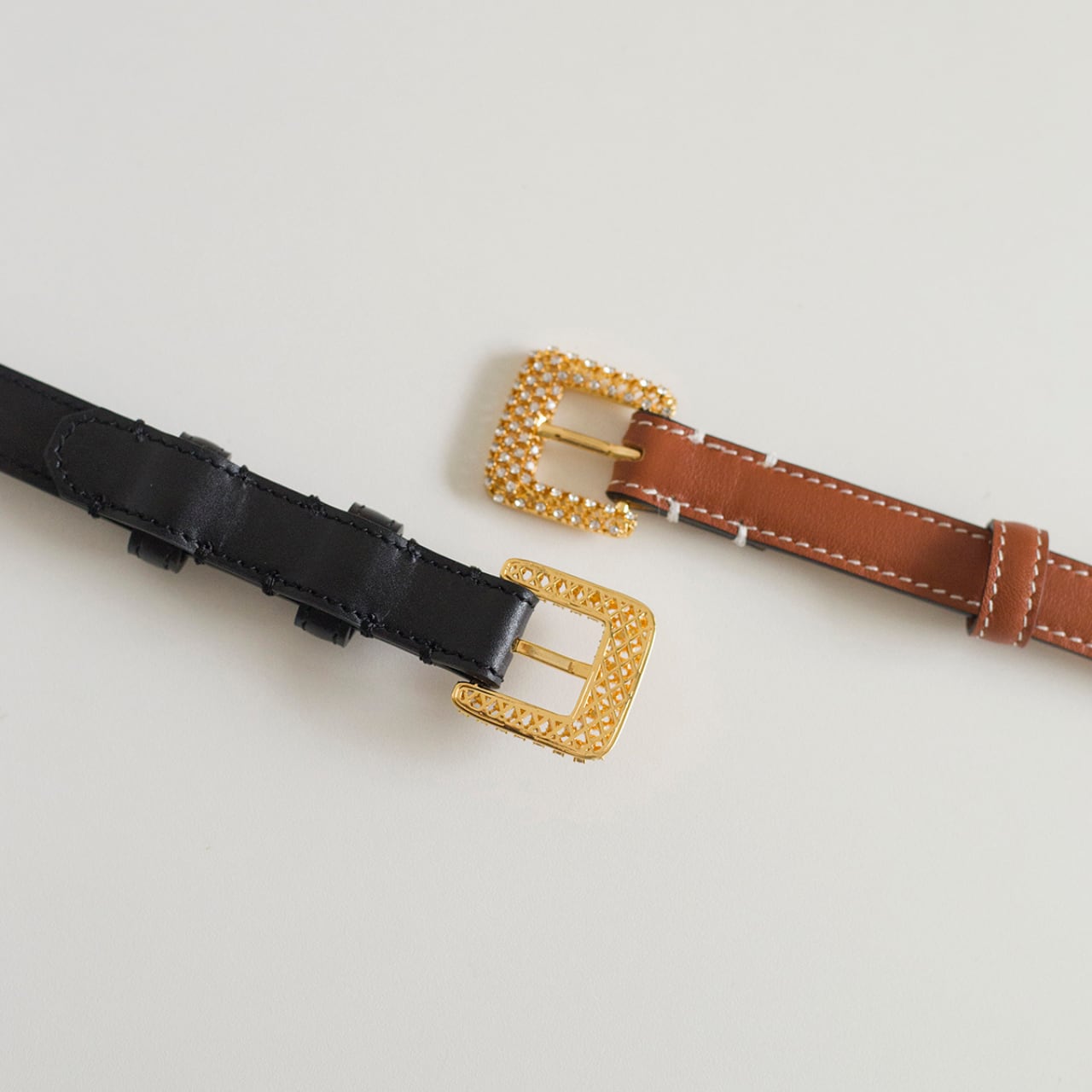 贅沢にきらめくラインストーンバックルと、丁寧に縫製された本革の質感が美しく調和したレザーベルト。細身ながら存在感があり、シンプルなワンピースやパンツに一点投入するだけで洗練された印象に。ベルトは柔らかくしなやかな牛革素材を使用し、上品なきちんと感と快適な着け心地を両立。