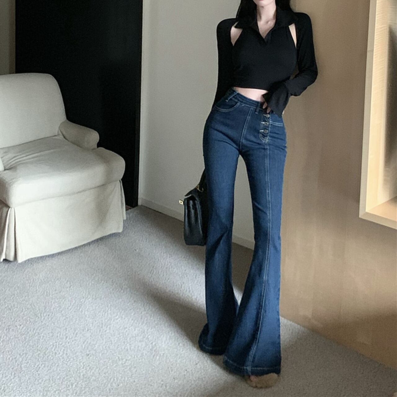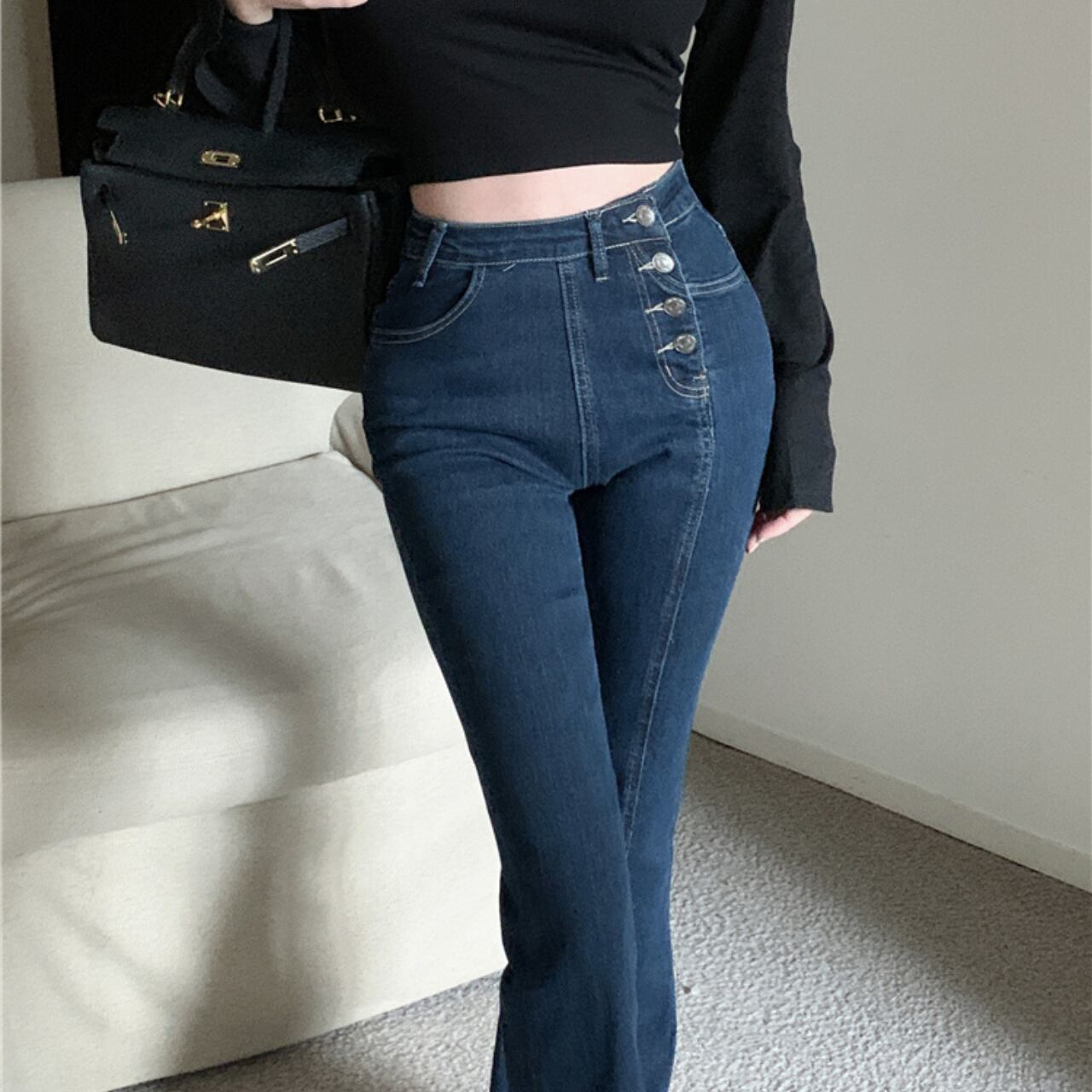 ボタンスリム ハイウエストフレアデニム B70