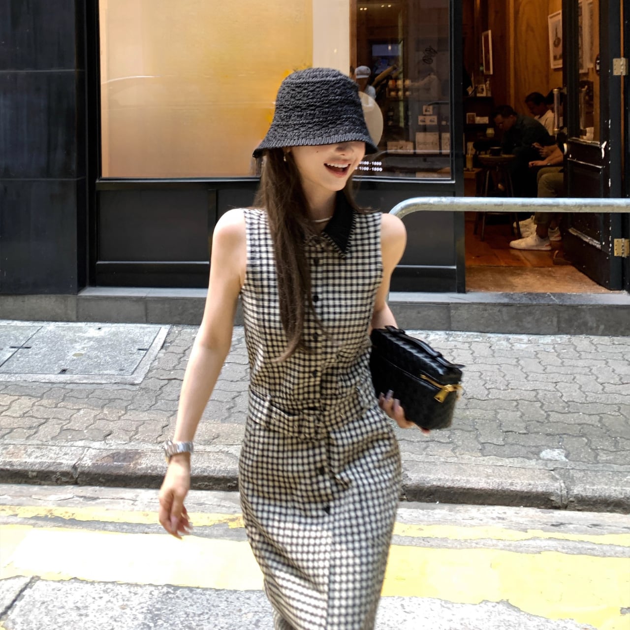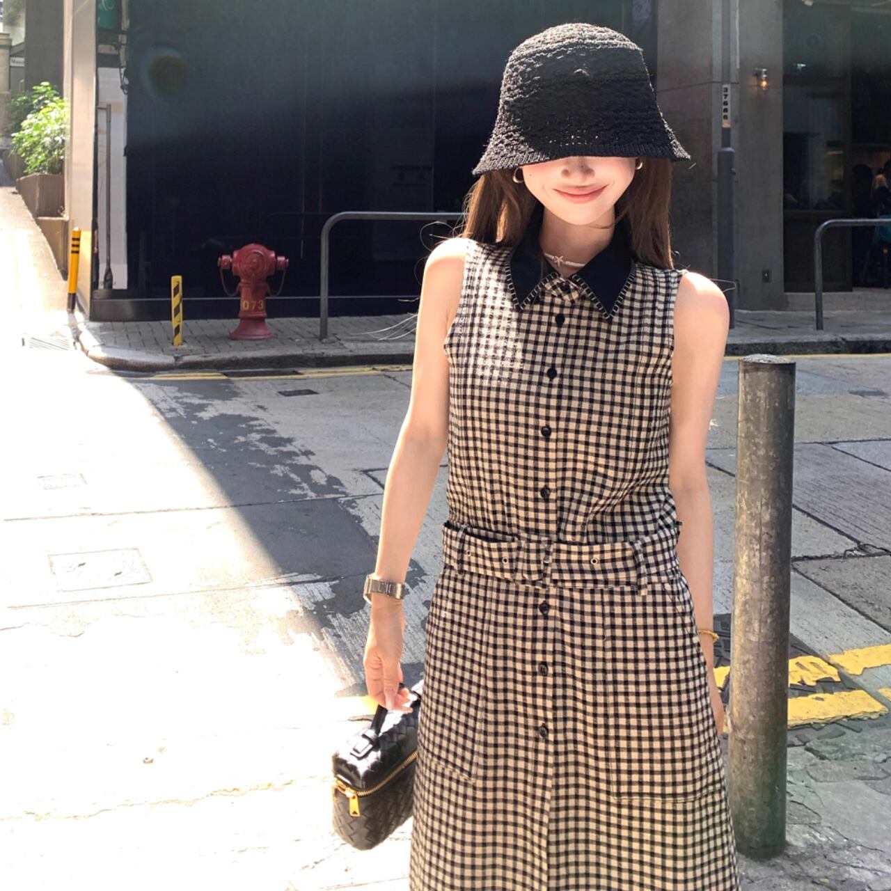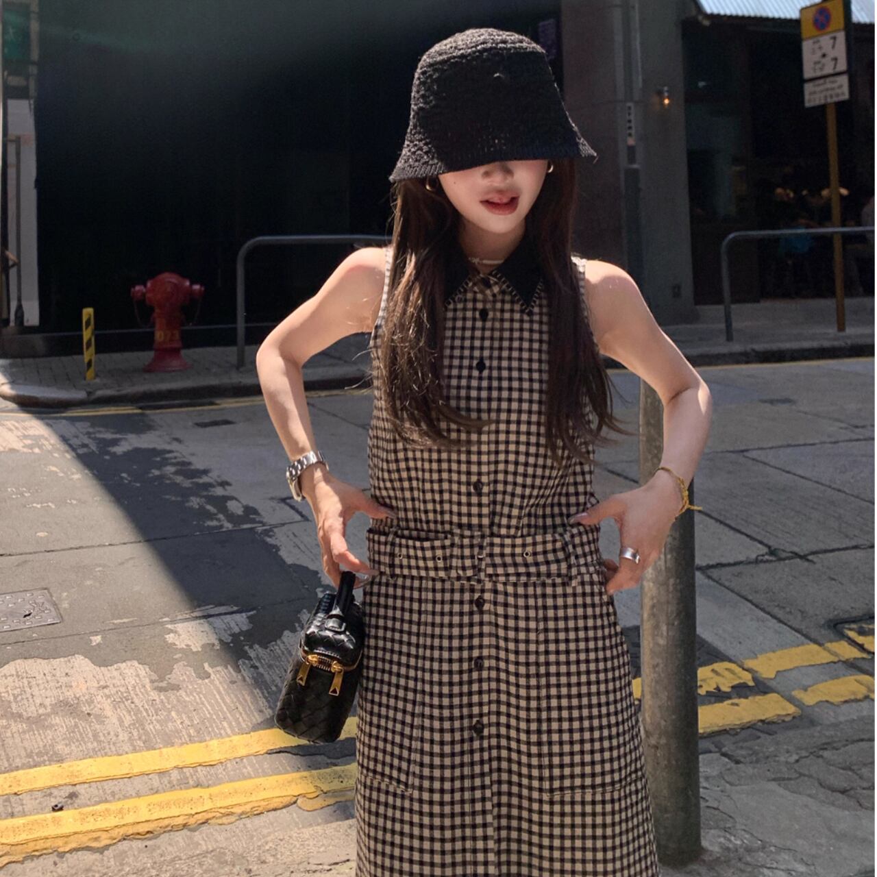 大人のためのモダンなギンガムチェックを纏った、ノースリーブのフレアドレス。