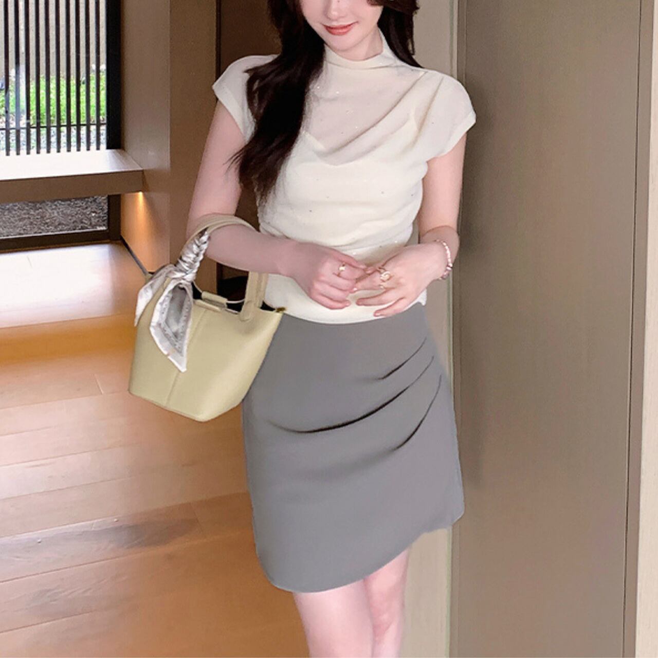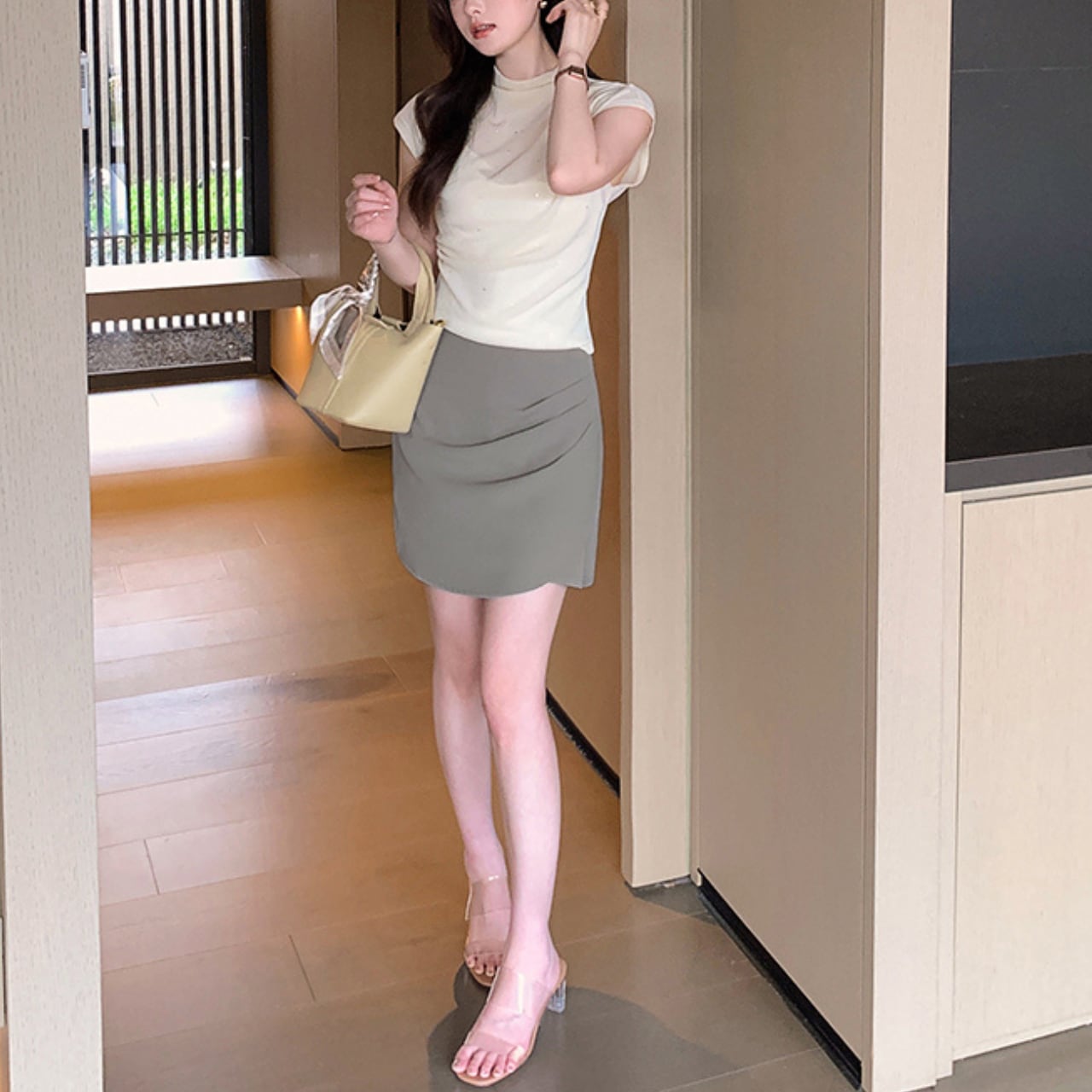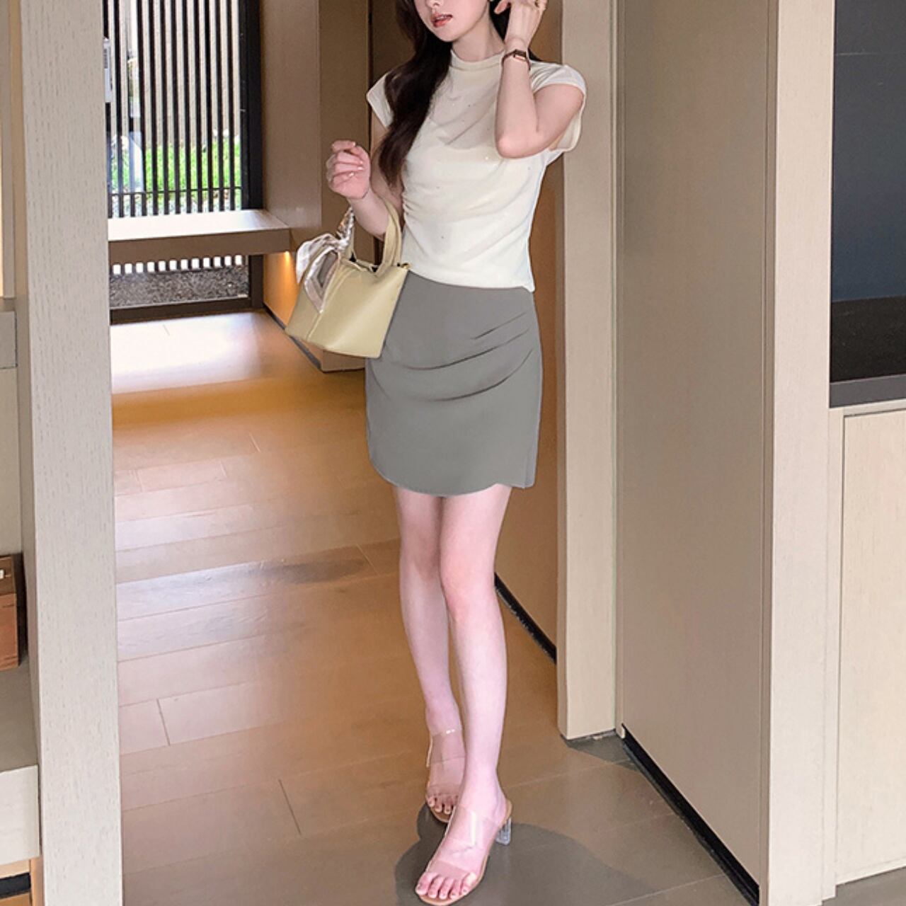なめらかな素材感と、さりげないドレープが美しく映えるハイウエストスカート。