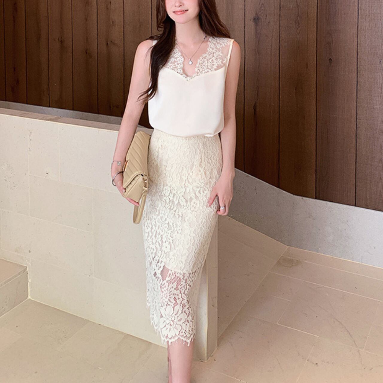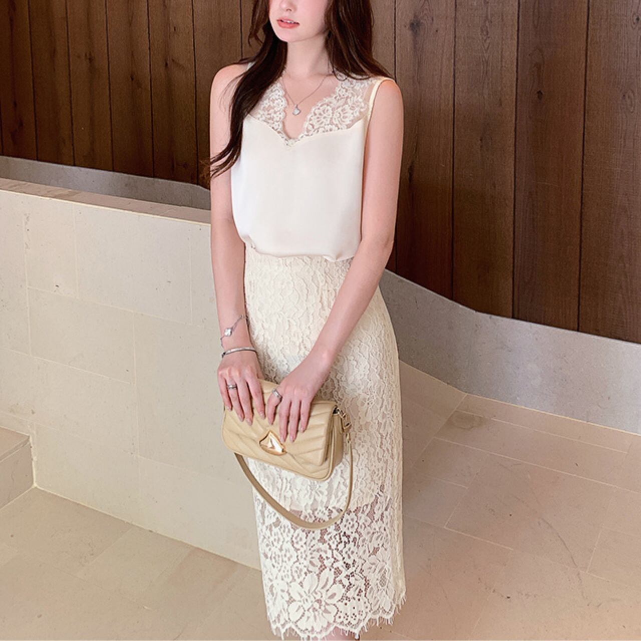 光を受けて艶めくシルキー素材と、繊細なレースが上品に映えるトップス。