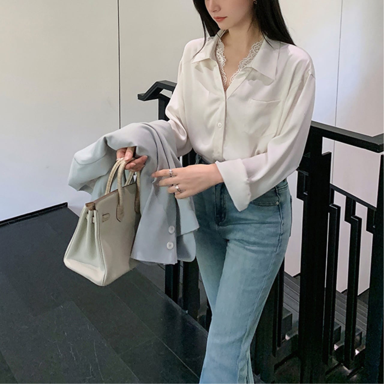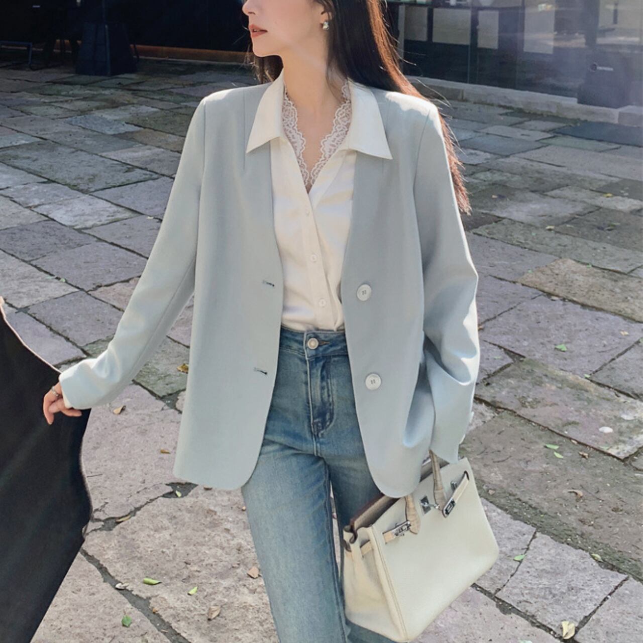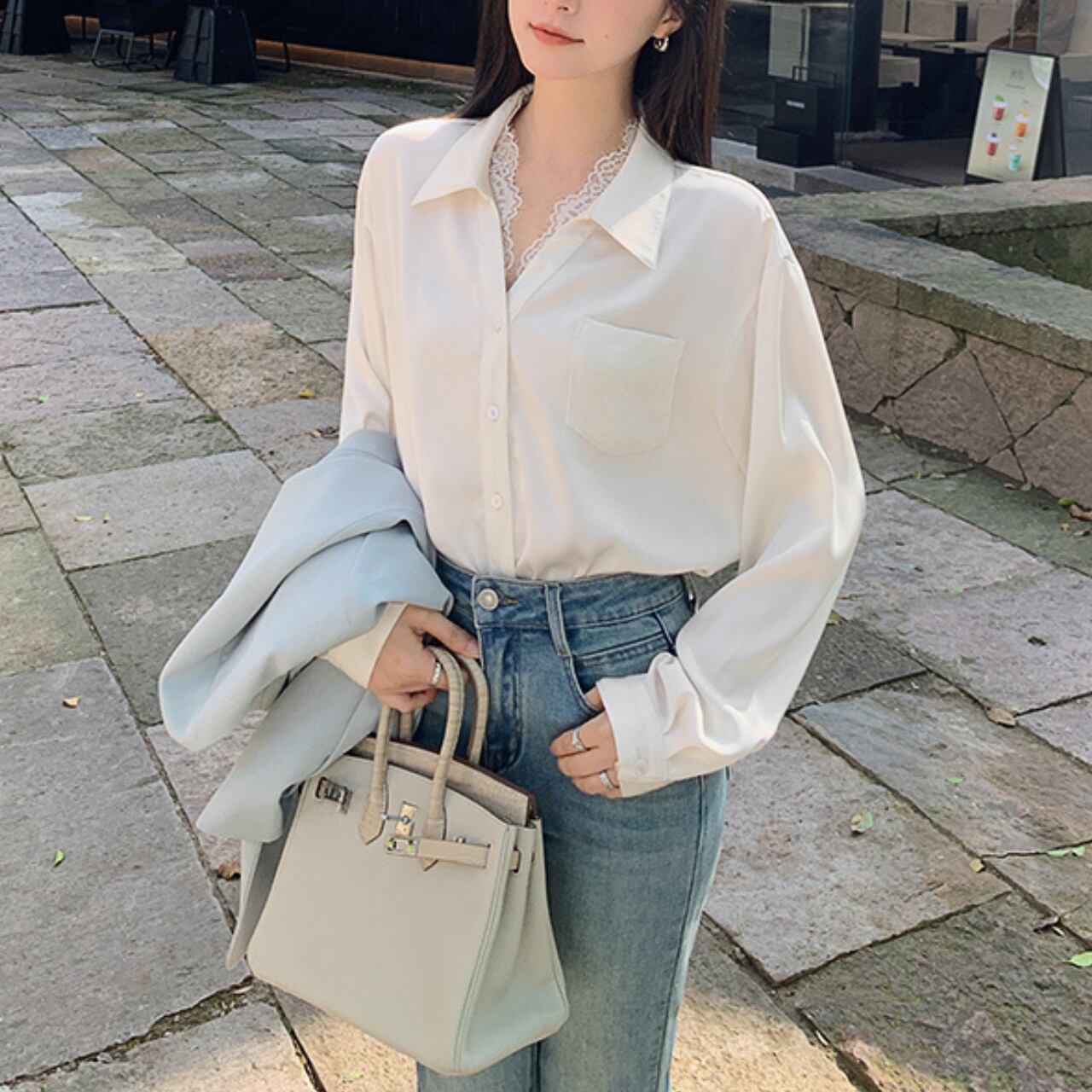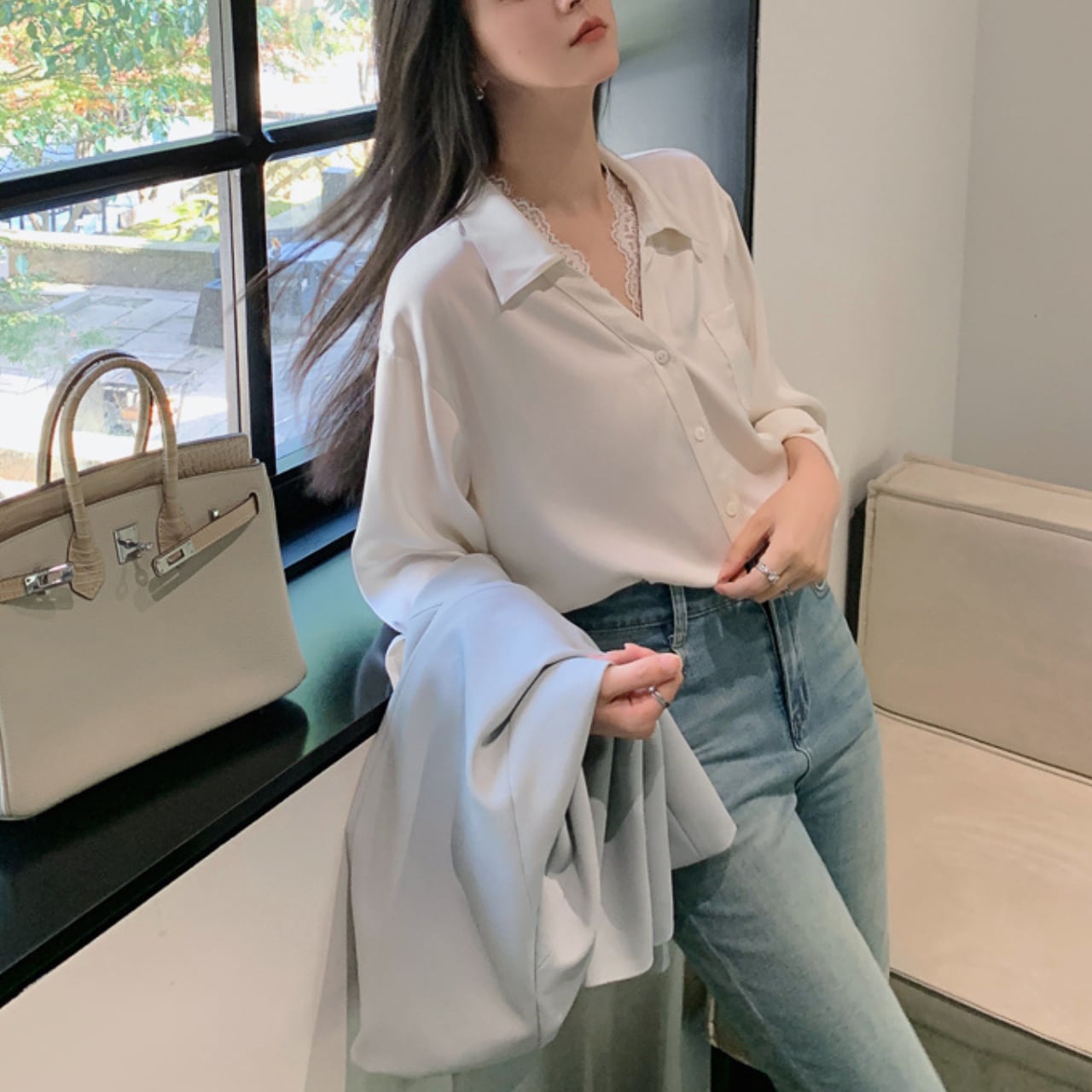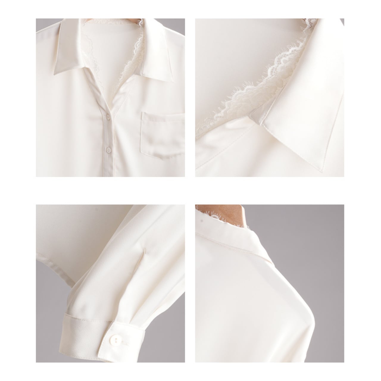 繊細なレースの襟元が印象的な、上品で愛らしいブラウス。