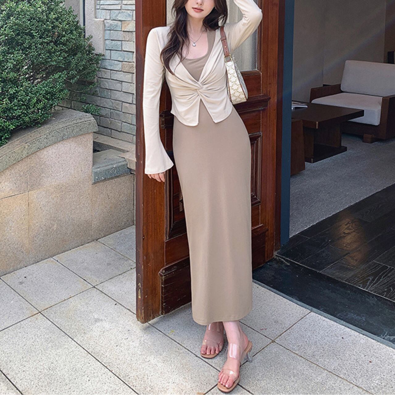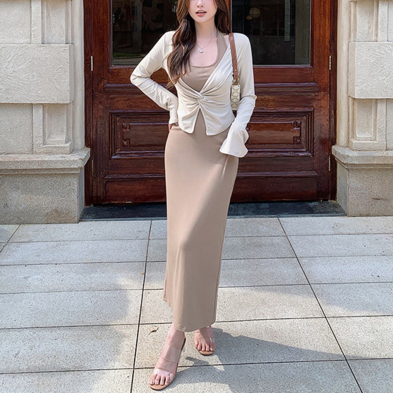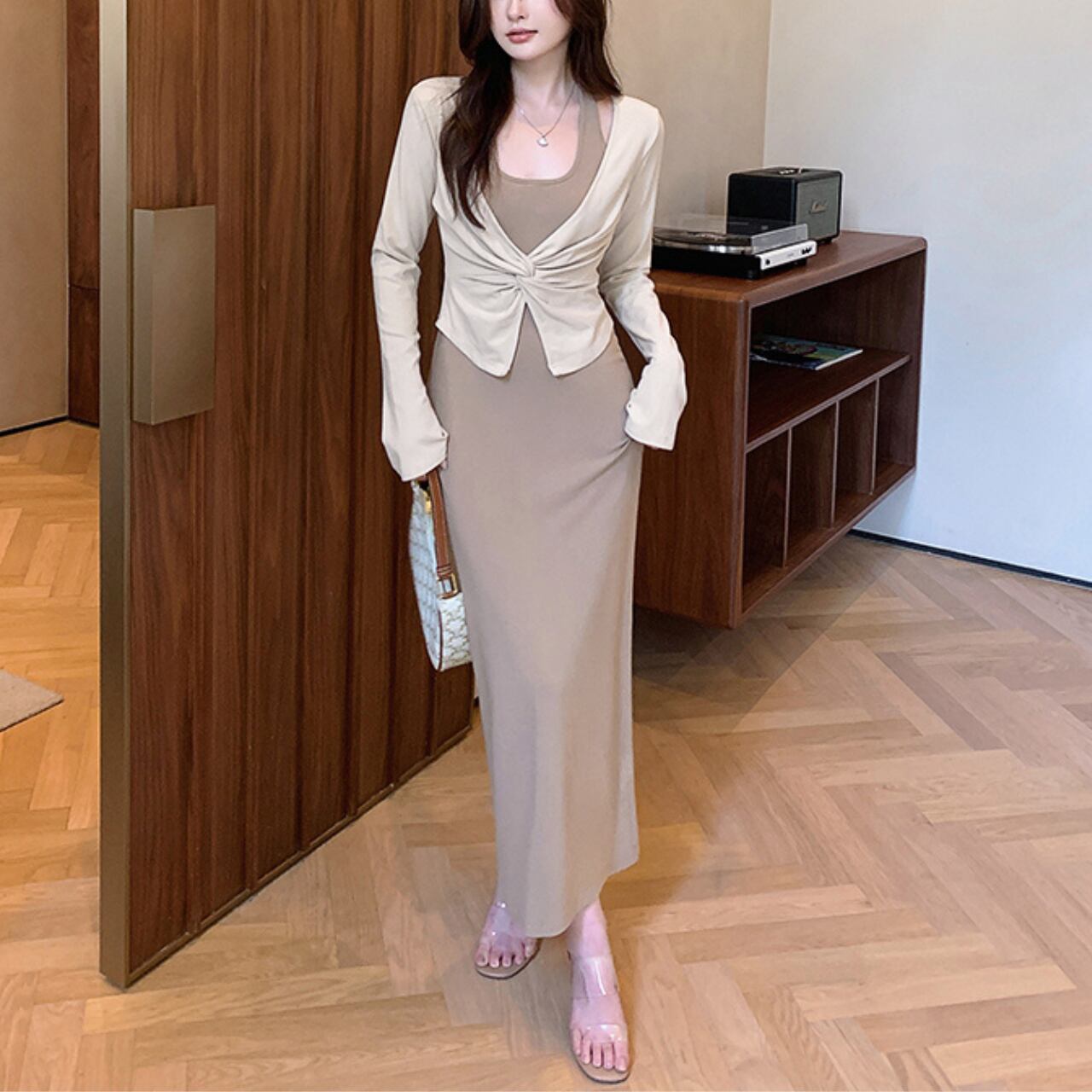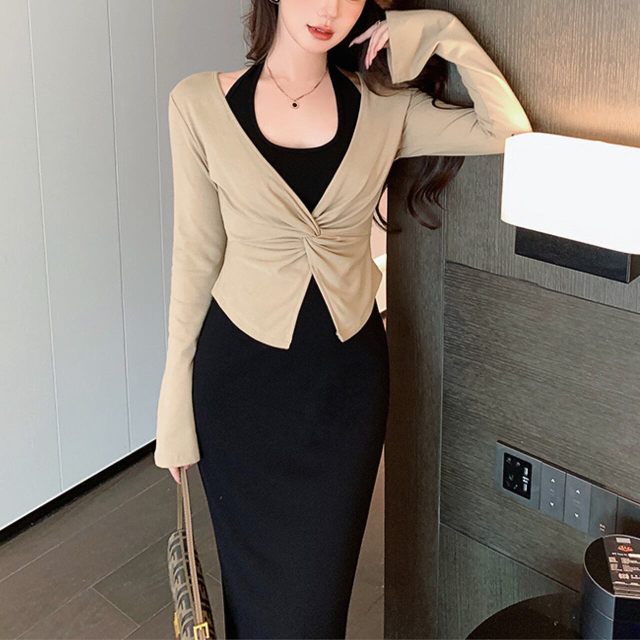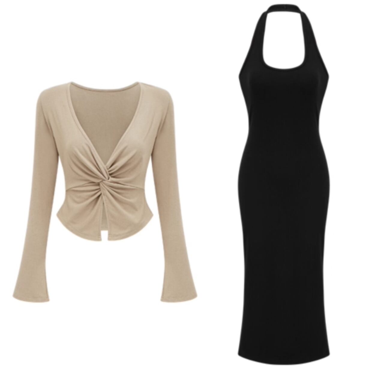 大胆な背中開きが美しい、ホルターネック風ワンピースとカーディガンのセットアイテム。