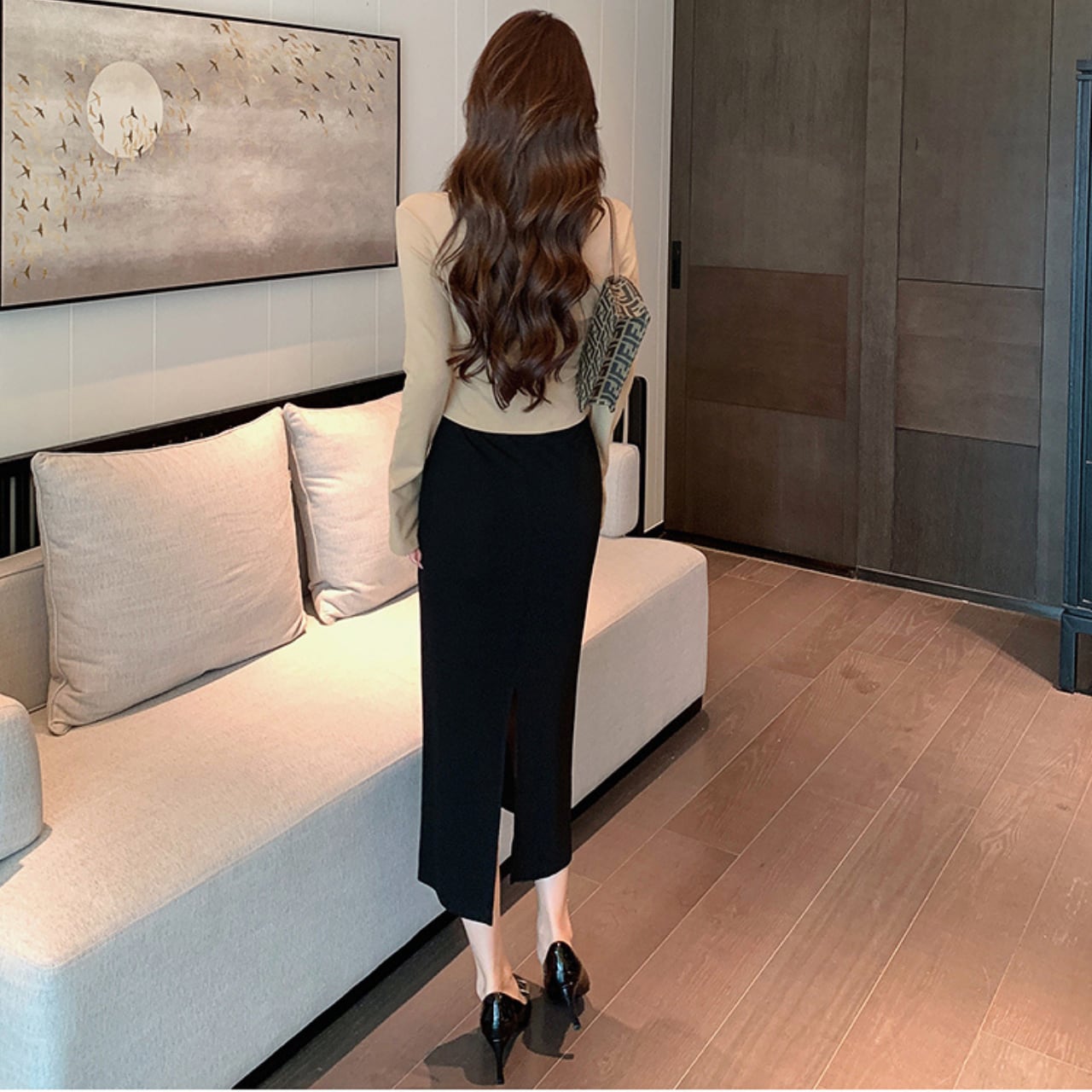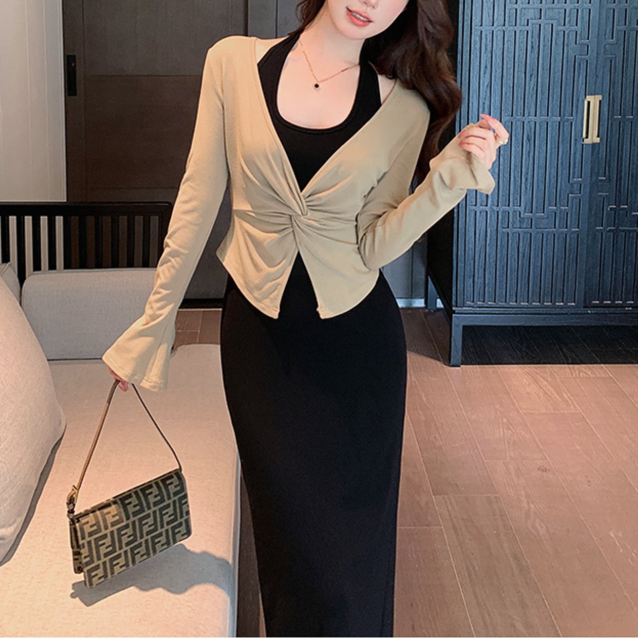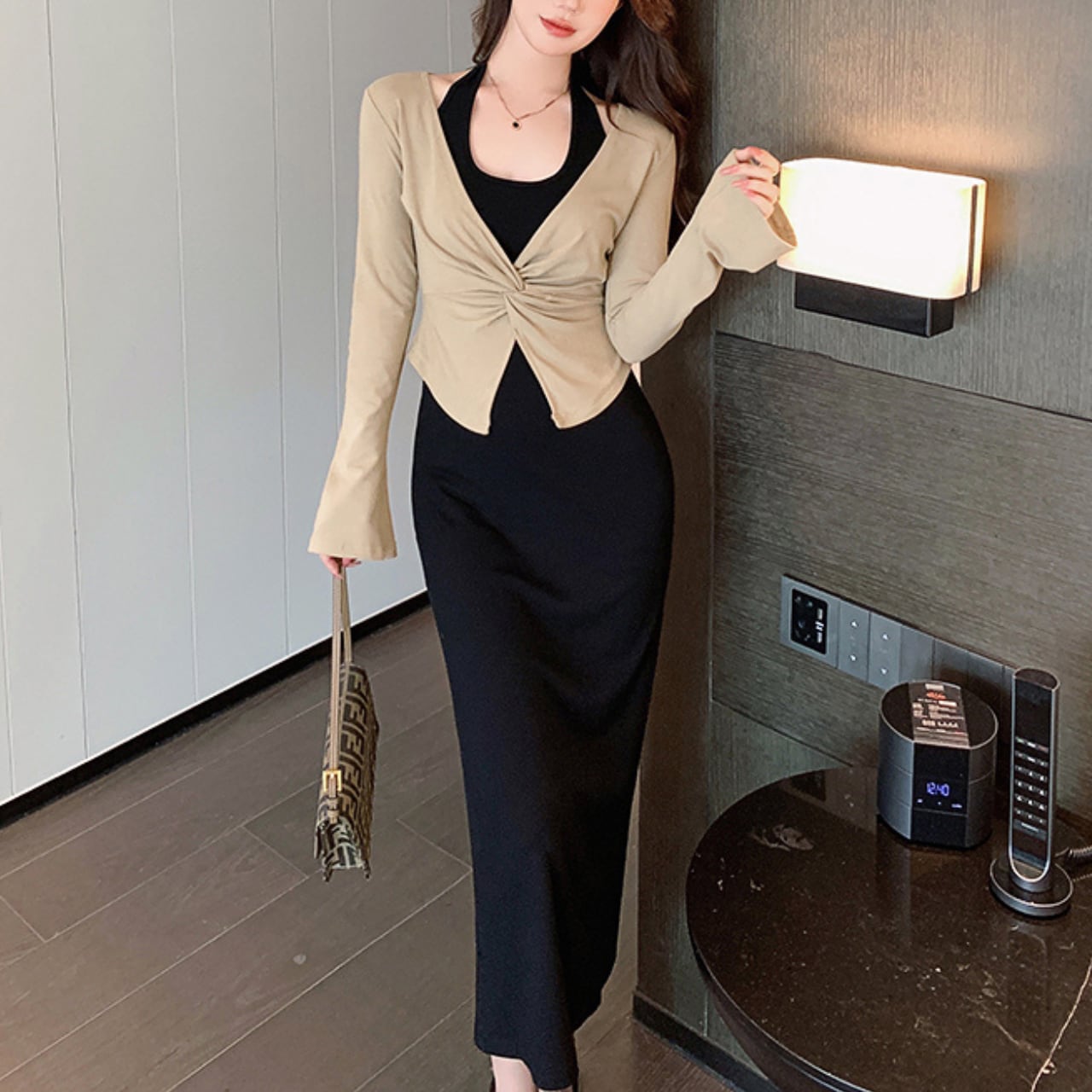 女性らしさを引き立てるIラインシルエットに、フロントツイストのトップスが洗練された印象をプラス。程よく肌見せしながらも上品にまとまります。