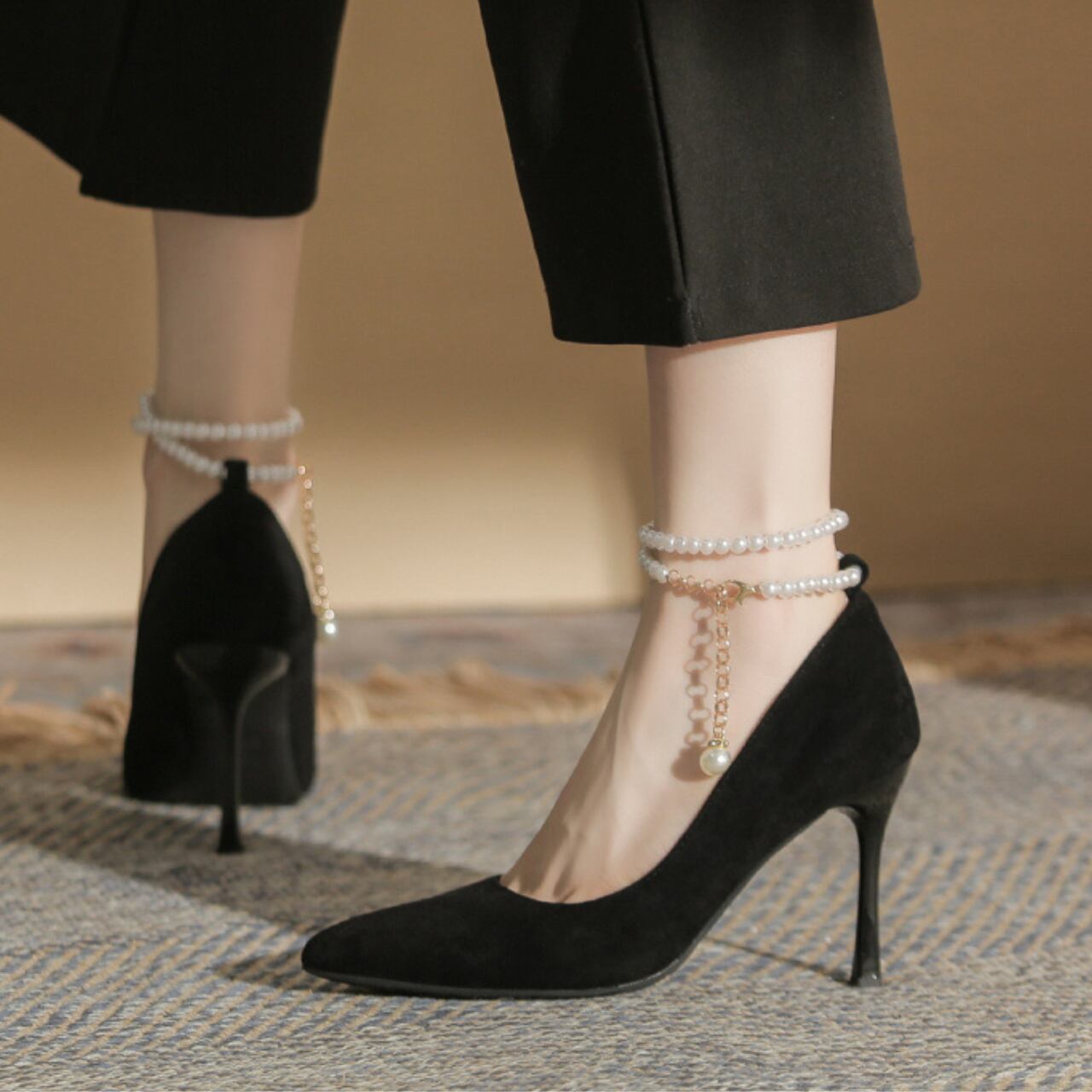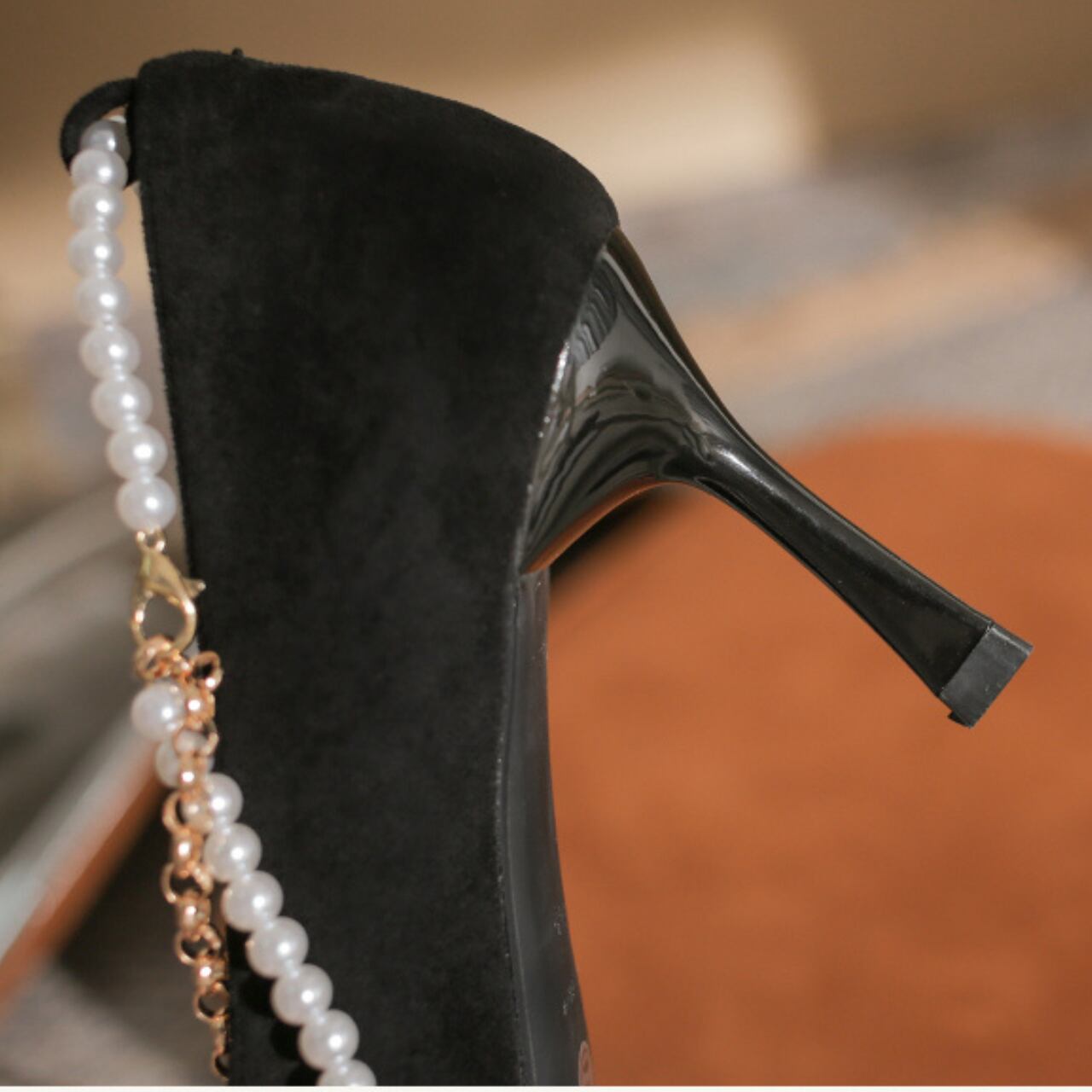 3連パールとゴールドチェーンが繊細に揺れ、シンプルなスタイルにエレガントな彩りを添えるパンプス。かかとの美しさを引き立てるヒールは、脚をきれいに魅せてくれる嬉しいポイント。オフィスや特別なシーンはもちろん、シンプルコーデの格上げアイテムとしてもおすすめです。
