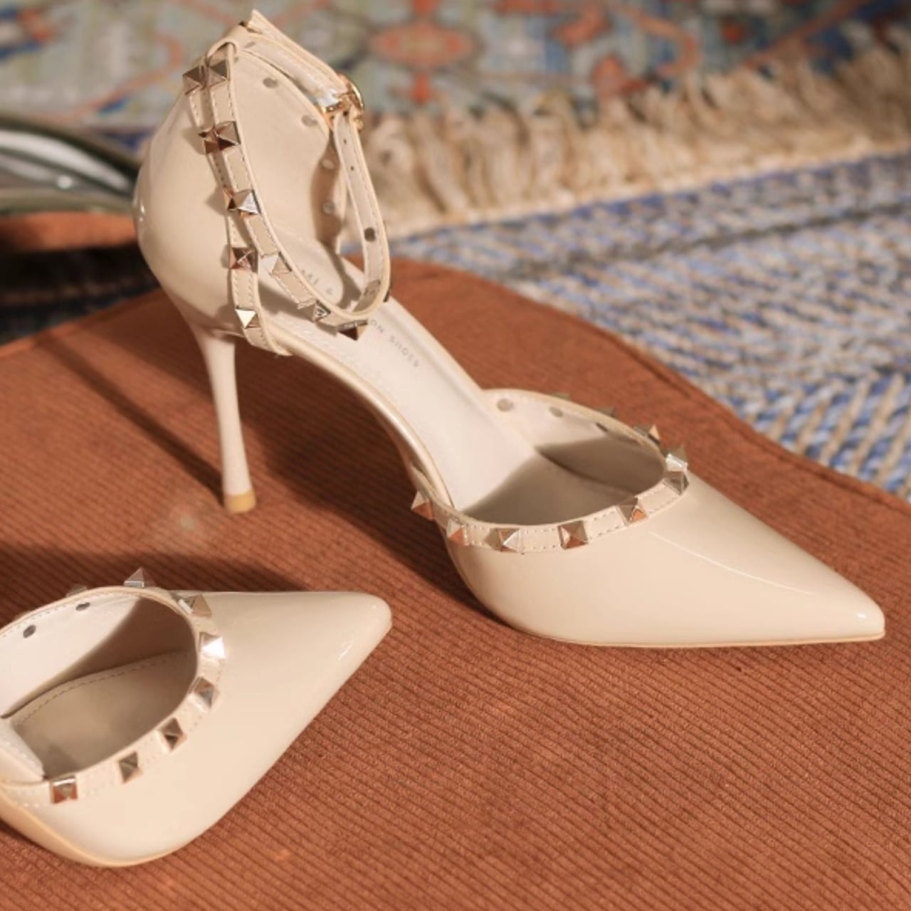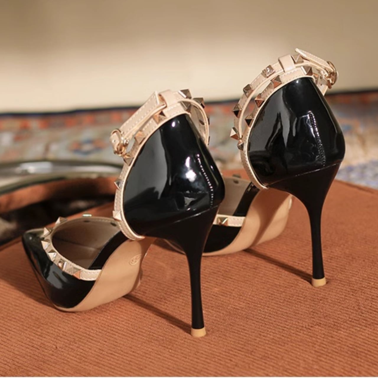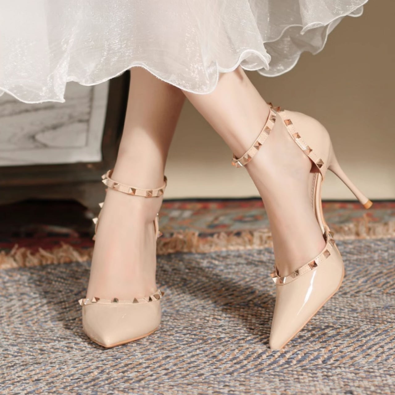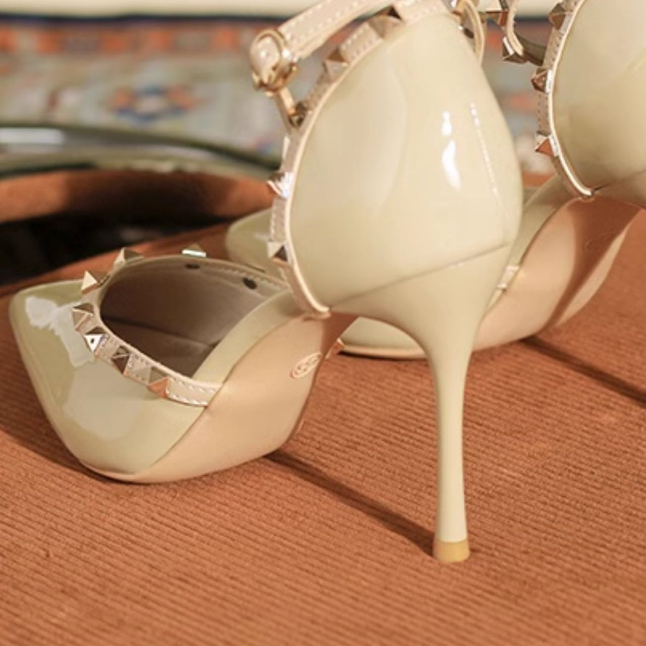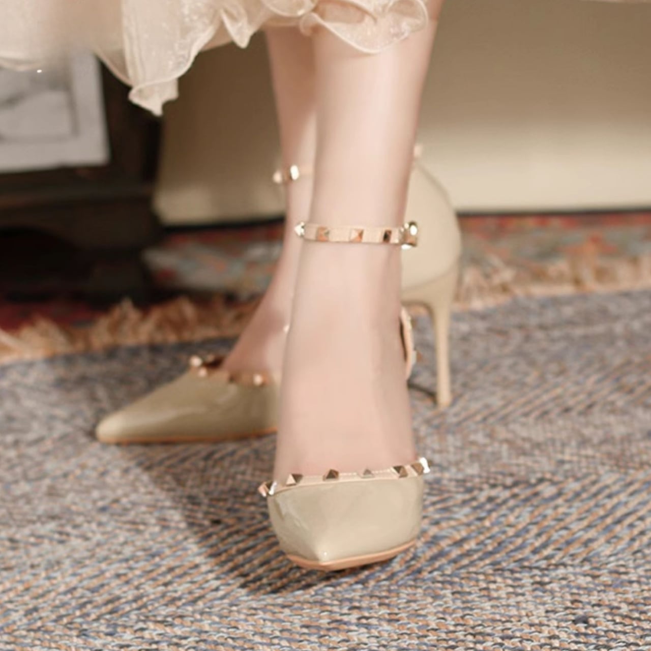艶やかなエナメル調素材にスタッズをあしらった、エレガントなポインテッドトゥパンプス。