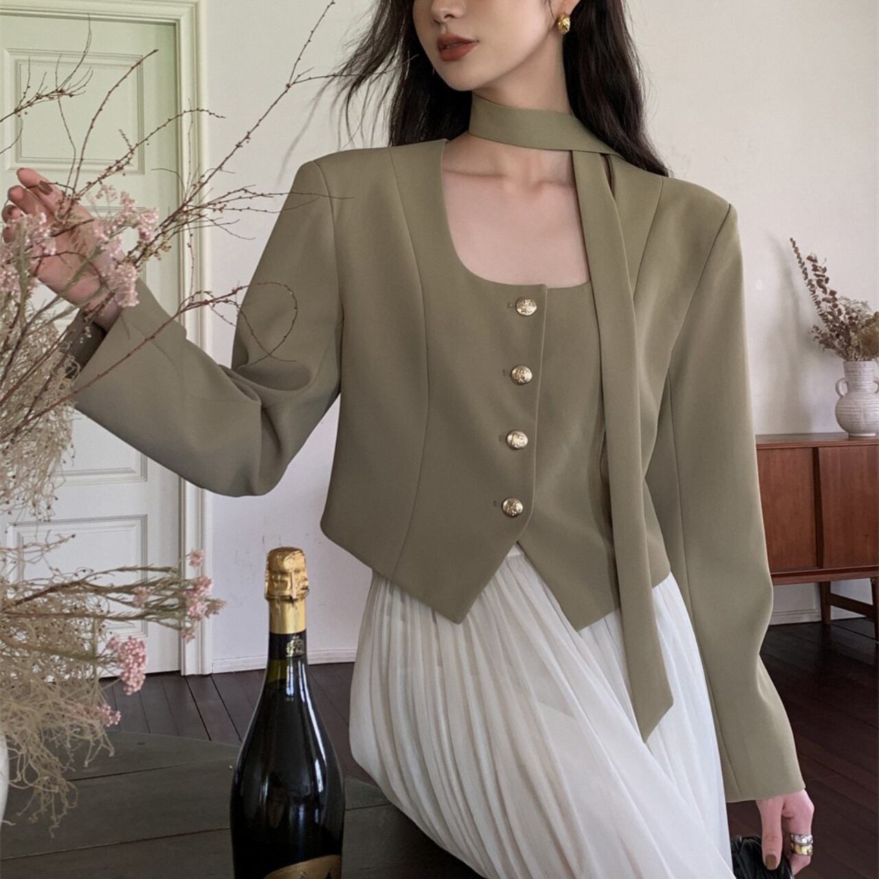 スクエアネックとゴールドボタンがクラシカルな印象を添えるエレガントジャケット。ウエストラインを自然に引き立てるコンパクトなシルエットで、パンツにもスカートにも合わせやすいデザインです。付属のスカーフ風リボンで、首元に上品なアクセントをプラス。デイリーから特別なシーンまで幅広く活躍する一枚です。