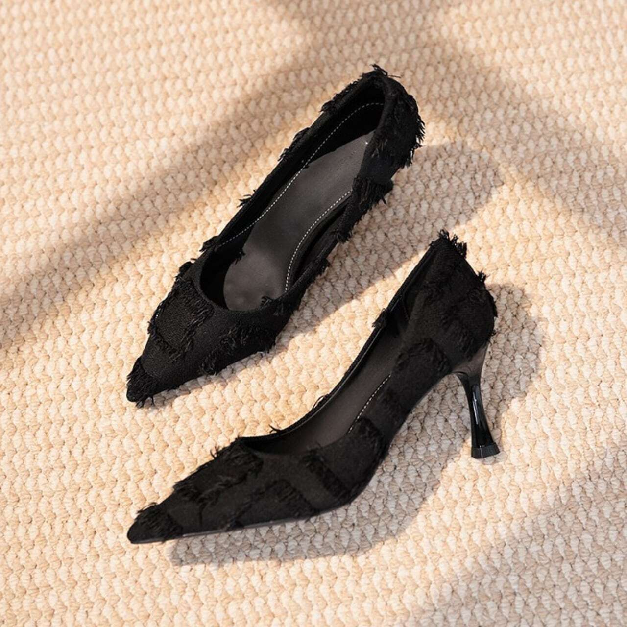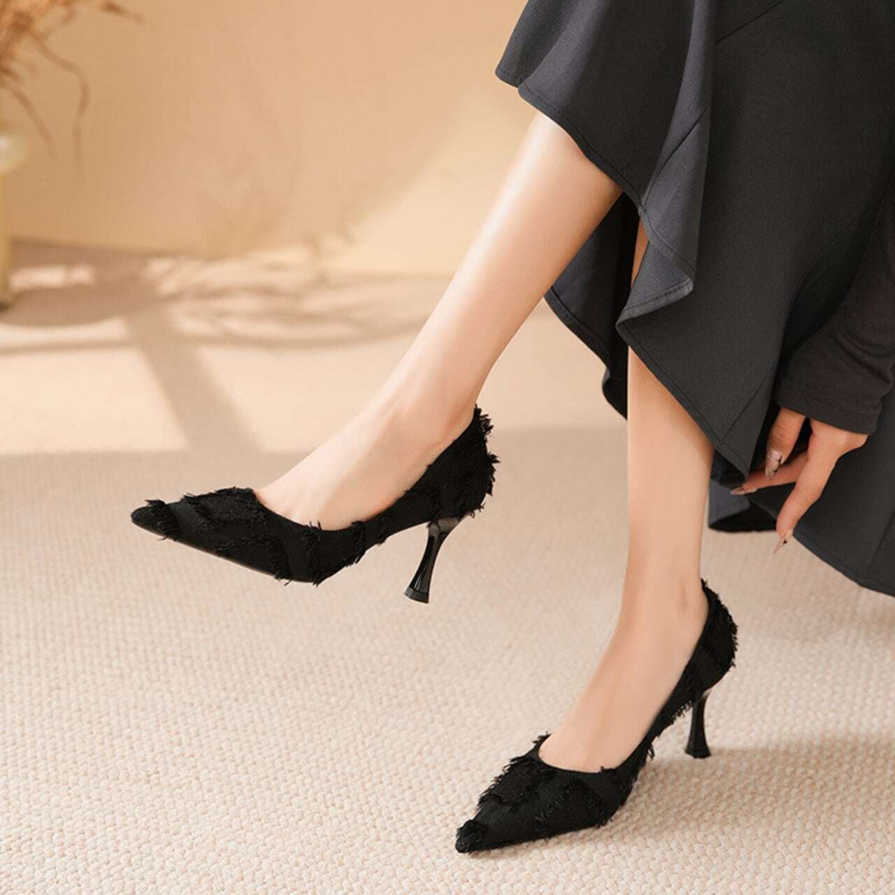 フリンジ調のファブリックが、足元にモードなアクセントを添えるパンプス。シャープなポインテッドトゥが女性らしさを引き立て、上品で華やかな印象に。インソールには通気性の良いマイクロファイバーを採用し、長時間の着用も快適に。特別な日にもデイリーにも映える、エレガントな一足です。