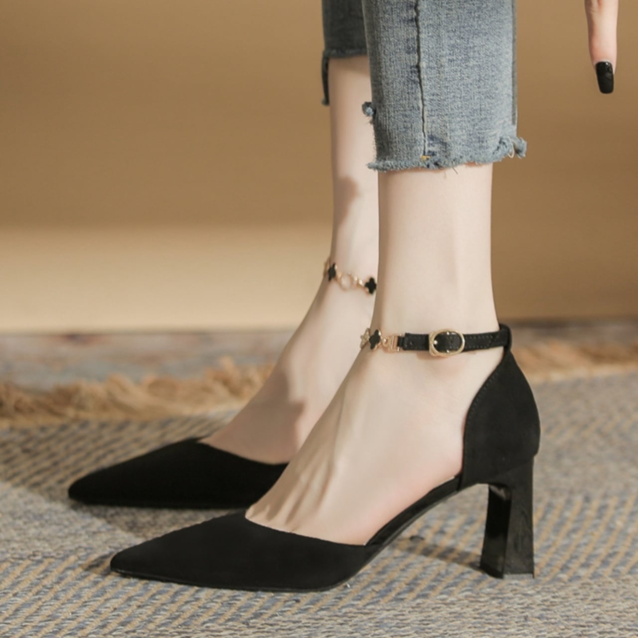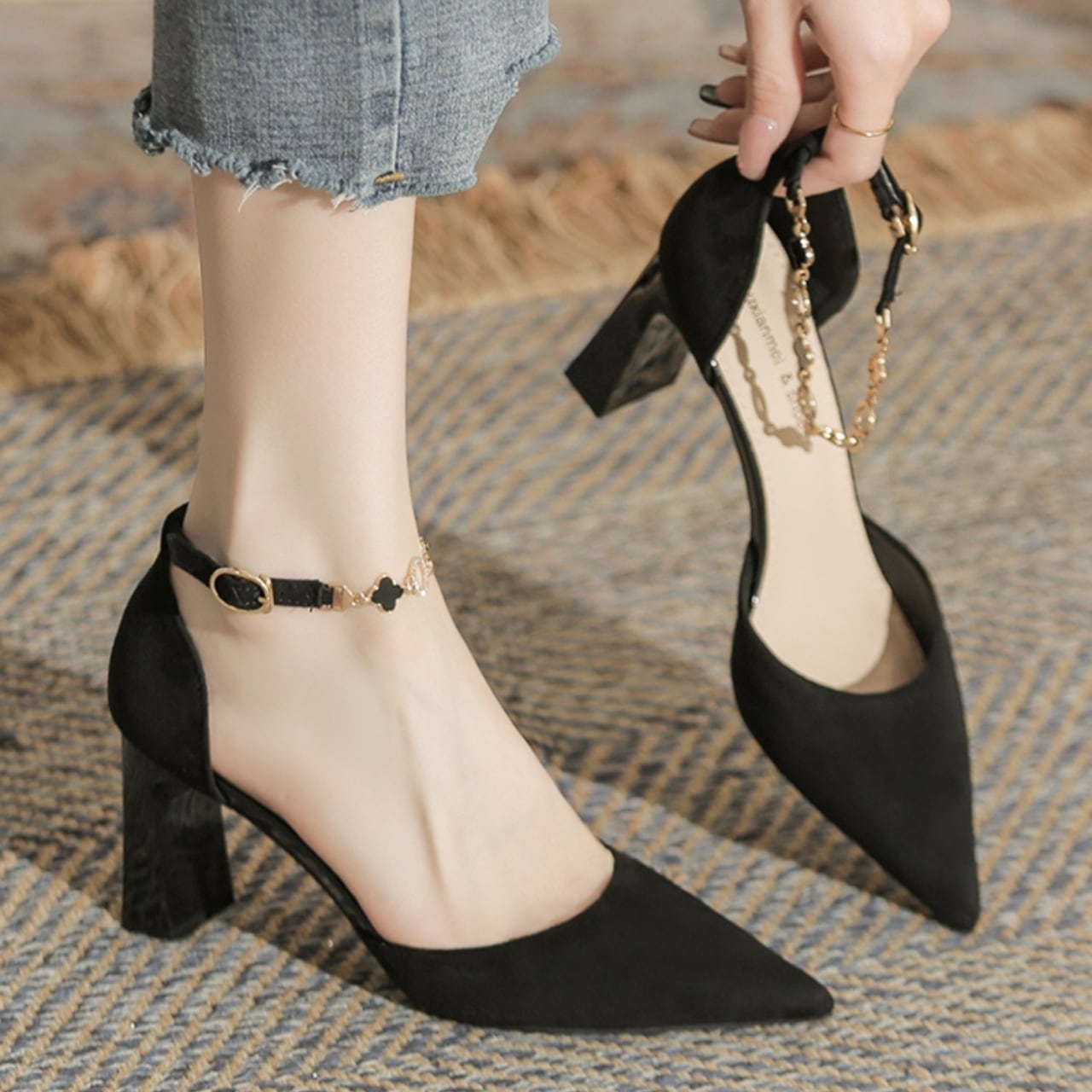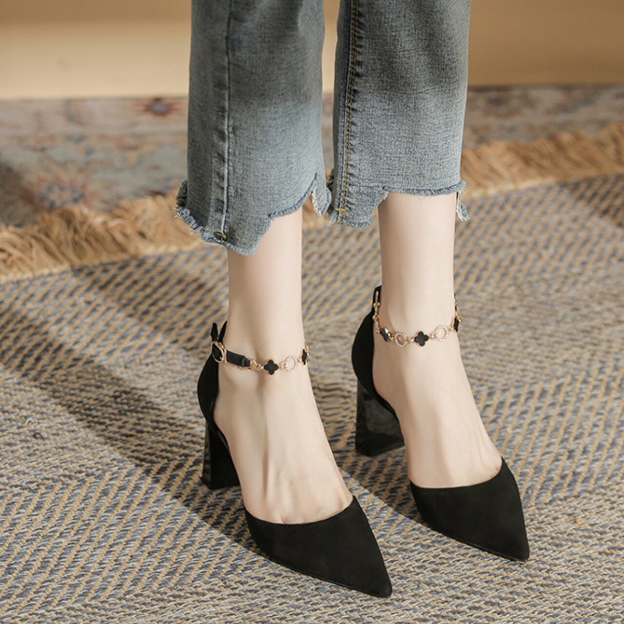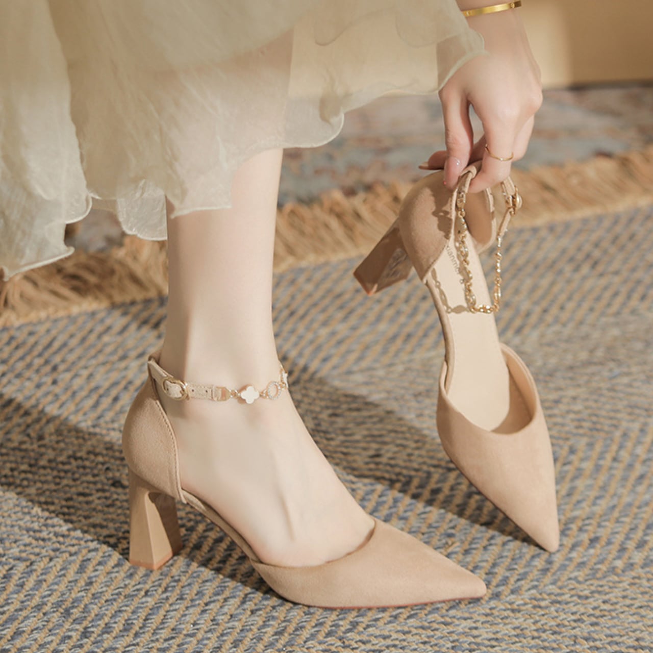 上品なパールチェーンが足元に華やぎを添える、2タイプのアンクルストラップパンプス。