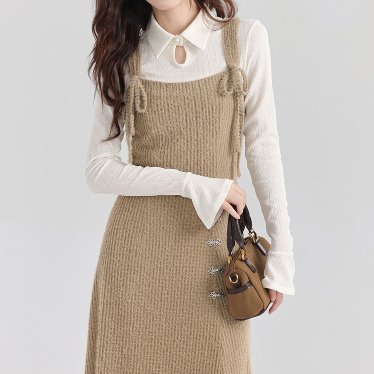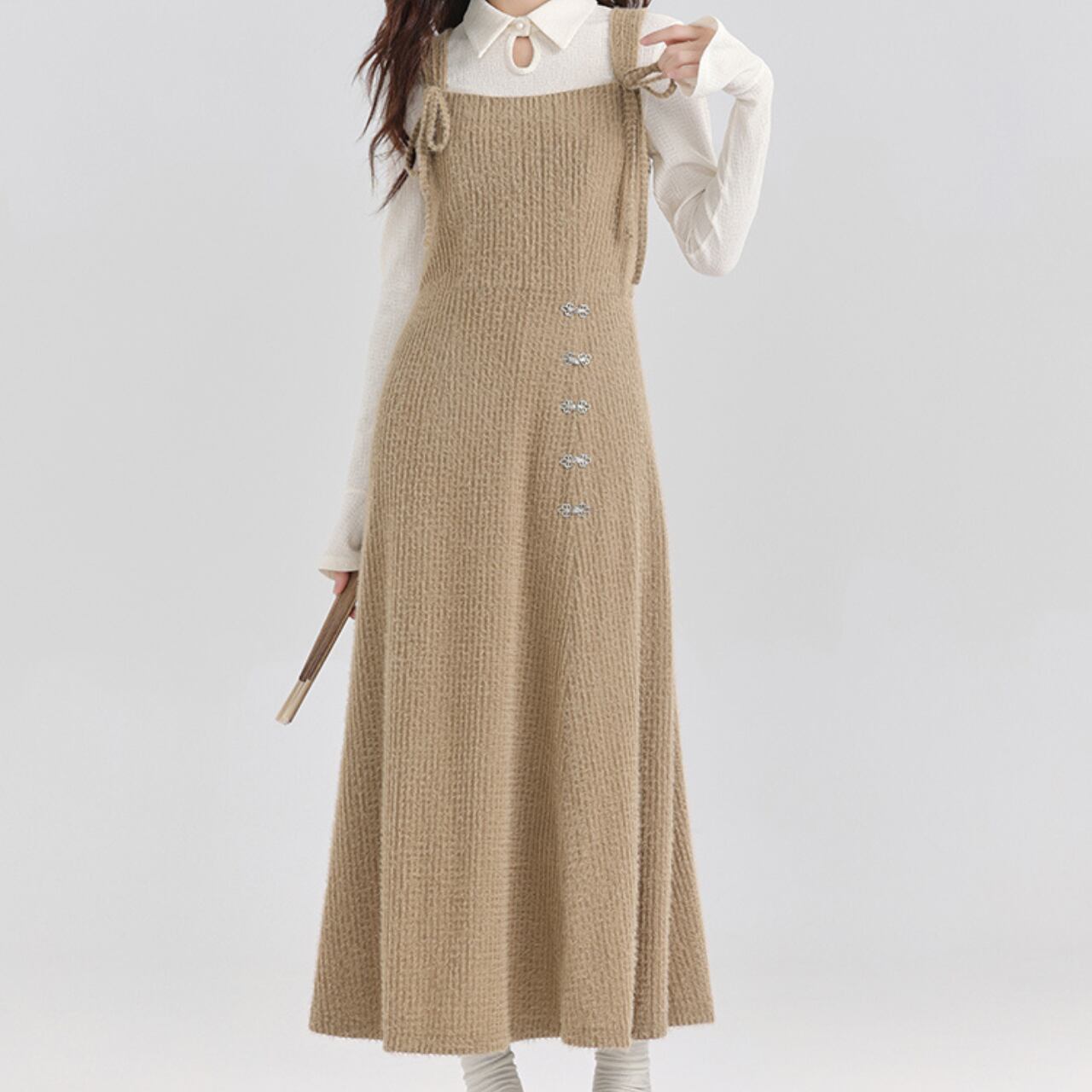 サスペンダーデザインと優しい風合いで、大人可愛い雰囲気を演出します。