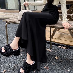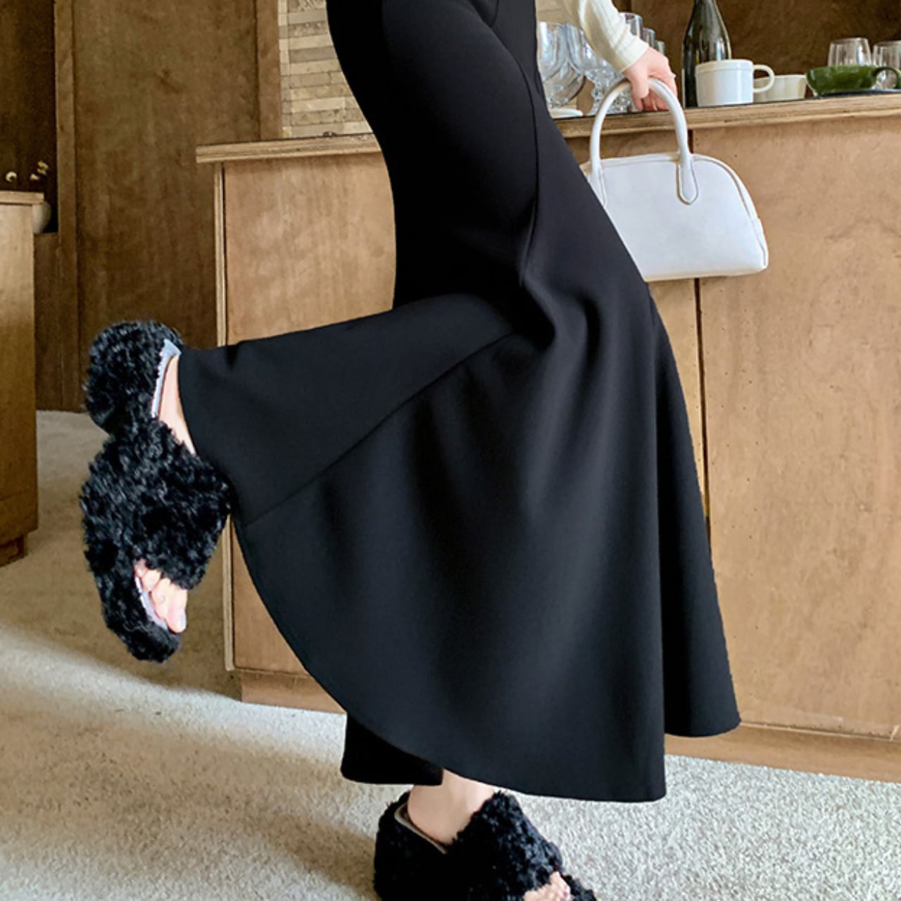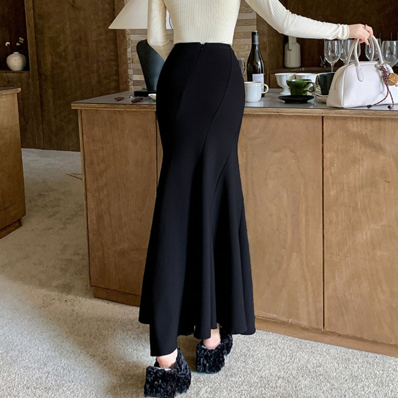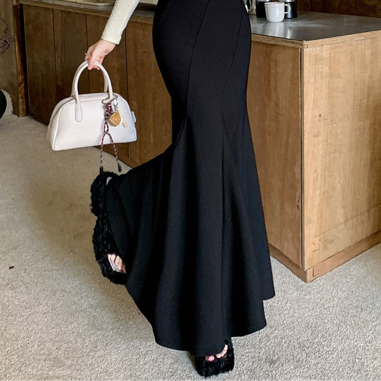 女性らしいシルエットを引き立てるマーメイドラインのロングスカート。