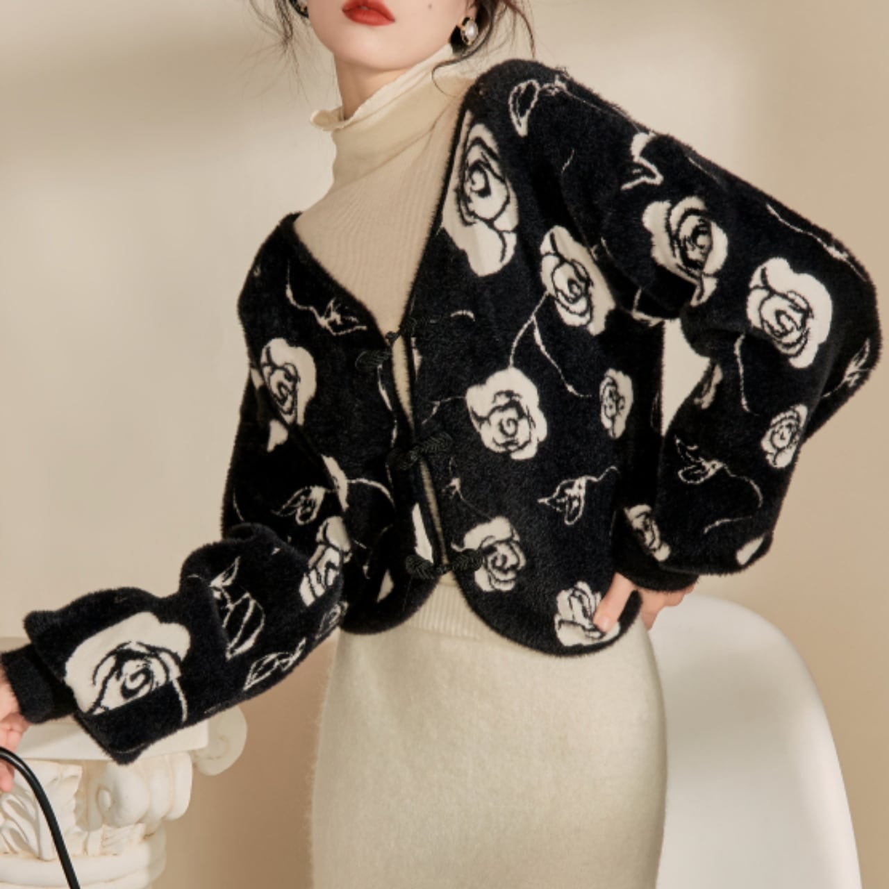 クラシカルなローズ柄を全体にあしらった、華やぎと温もりを感じるカーディガン。
