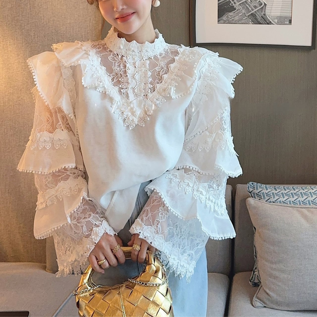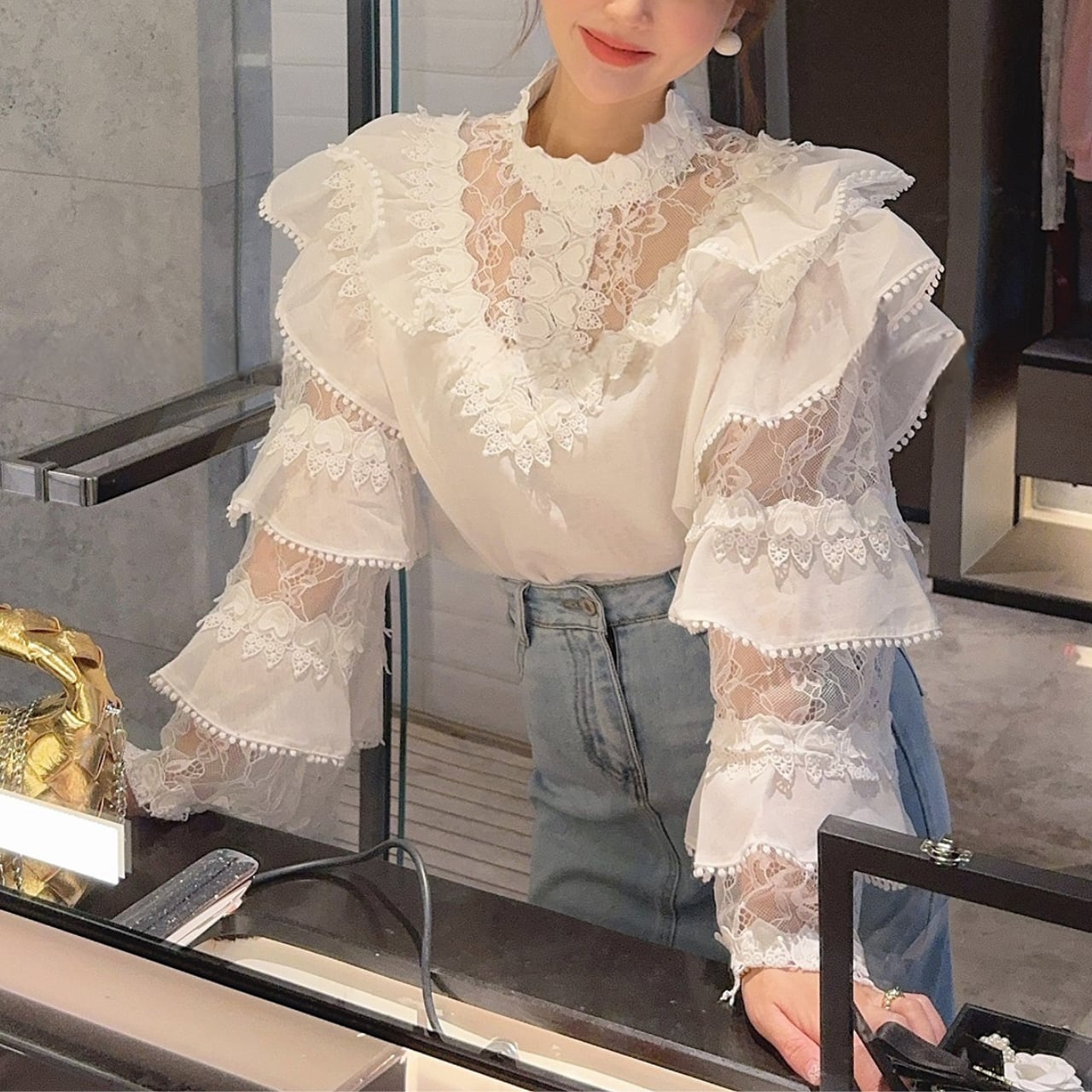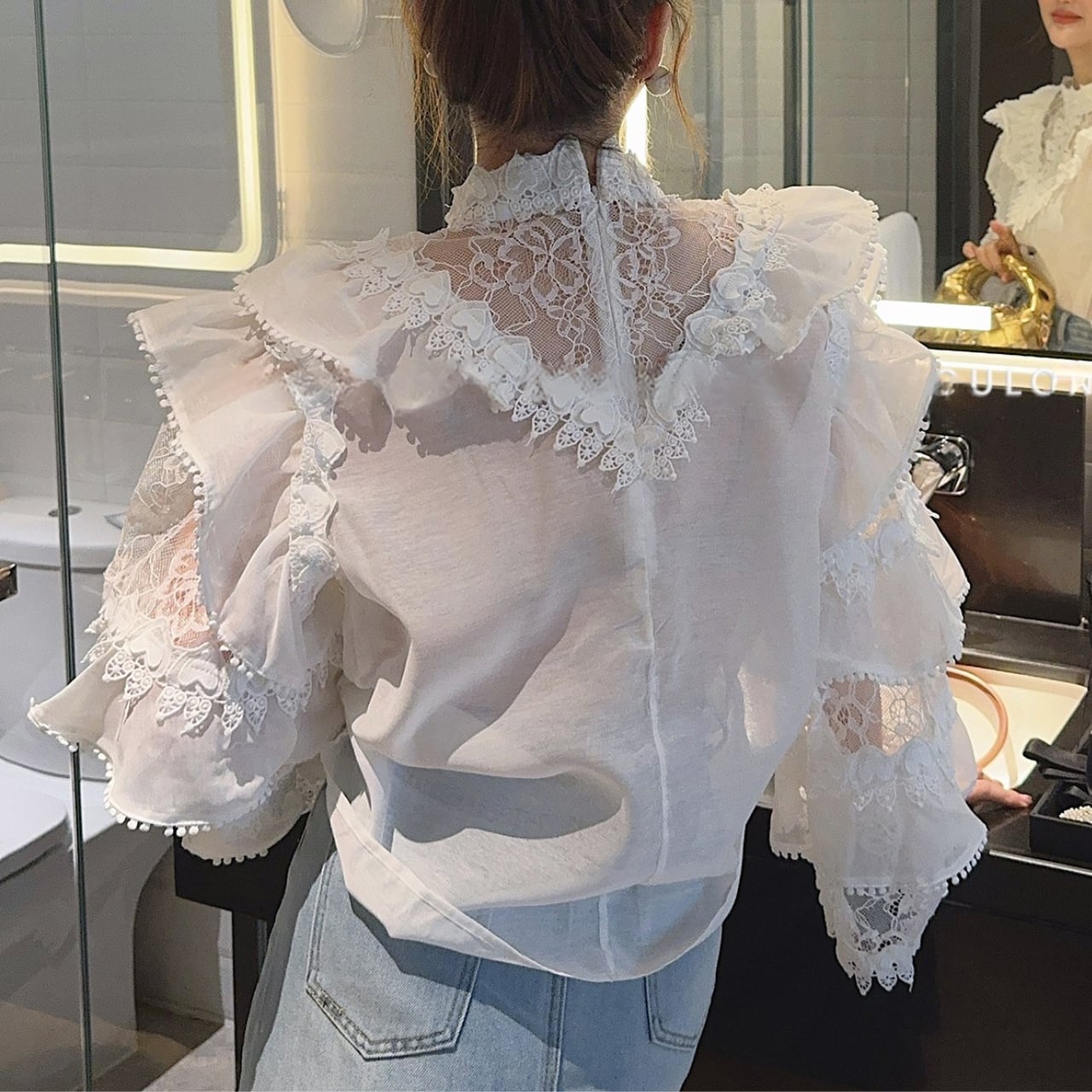 華やかなレースとフリルを贅沢にあしらった、フェミニンなシアーブラウス。