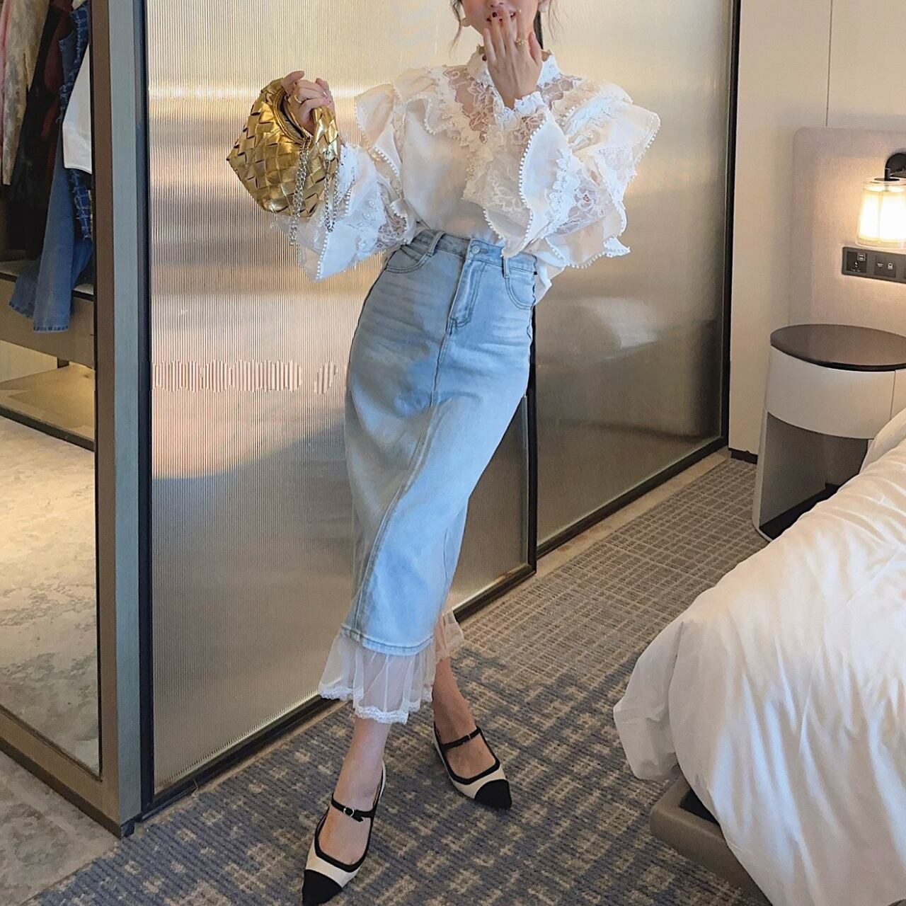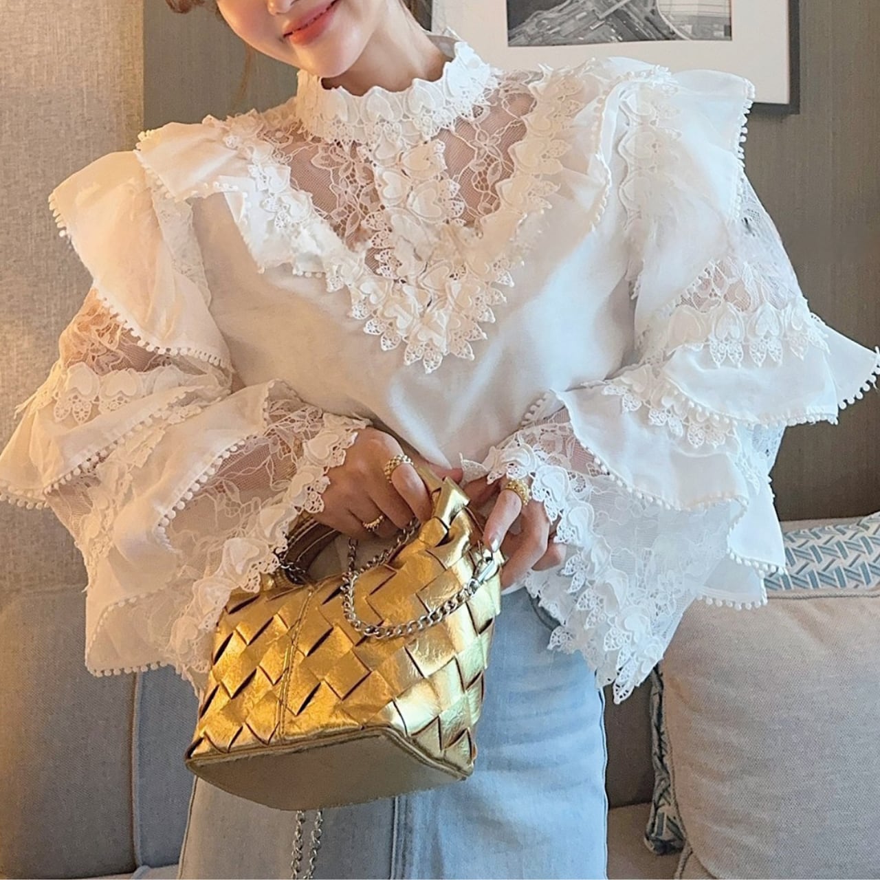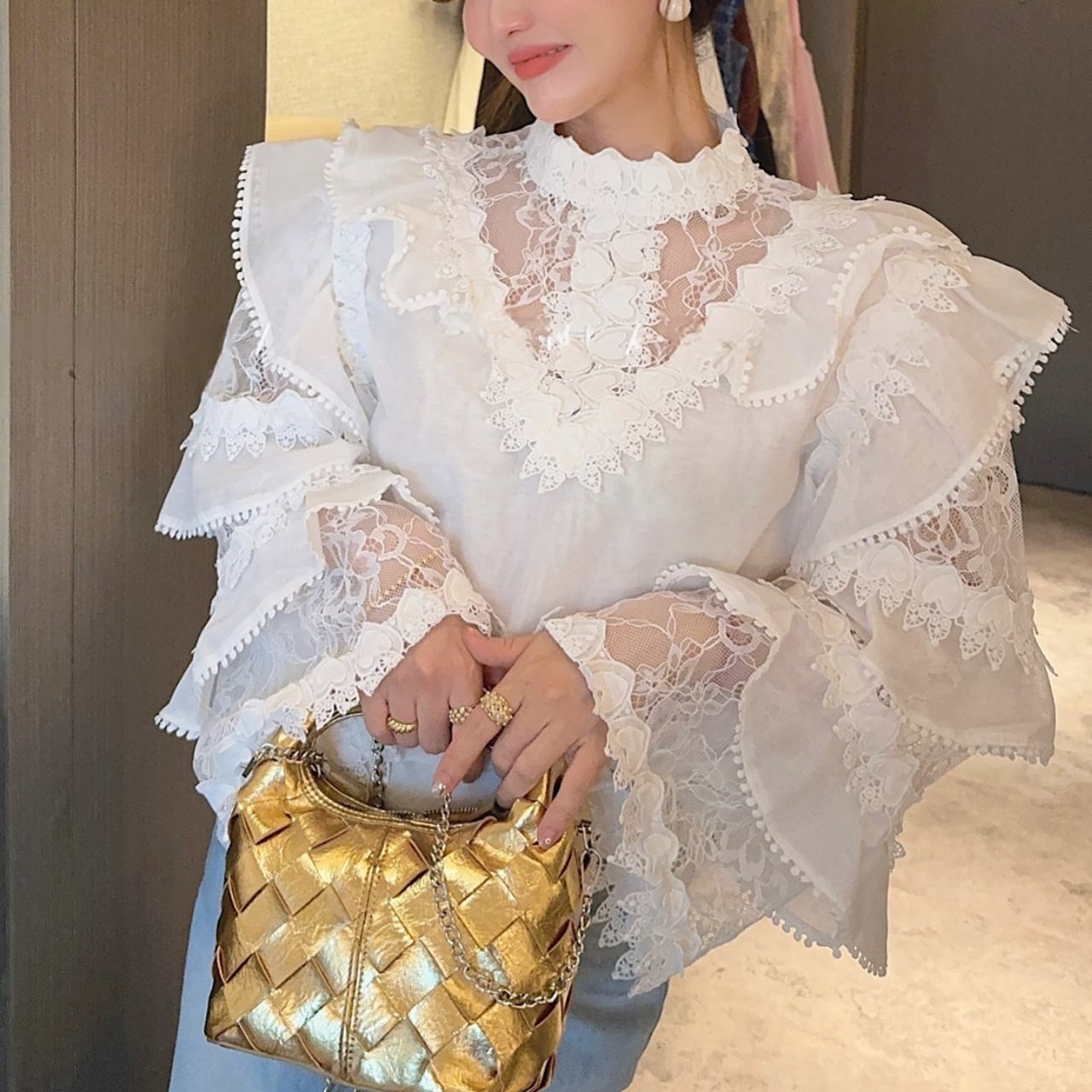 華やかなレースとフリルを贅沢にあしらった、フェミニンなシアーブラウス。