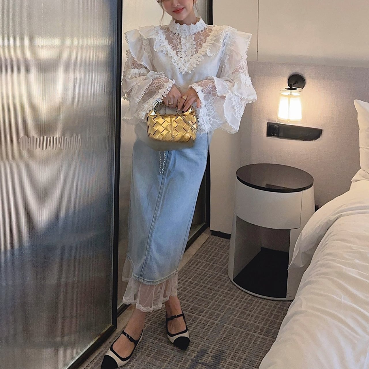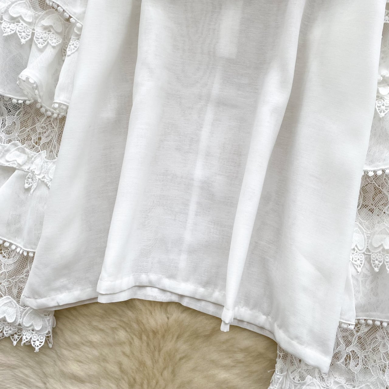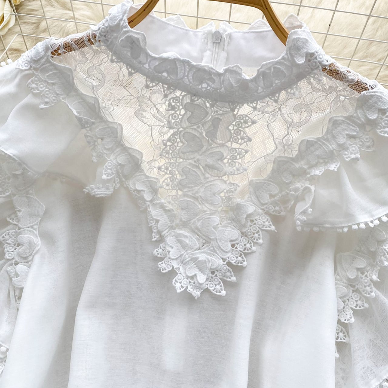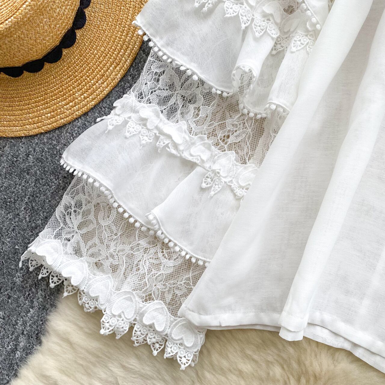 透け感のあるディテールと立体的なレースが上品で、特別な日のお出かけやデイリーコーデにも華やぎをプラスします。