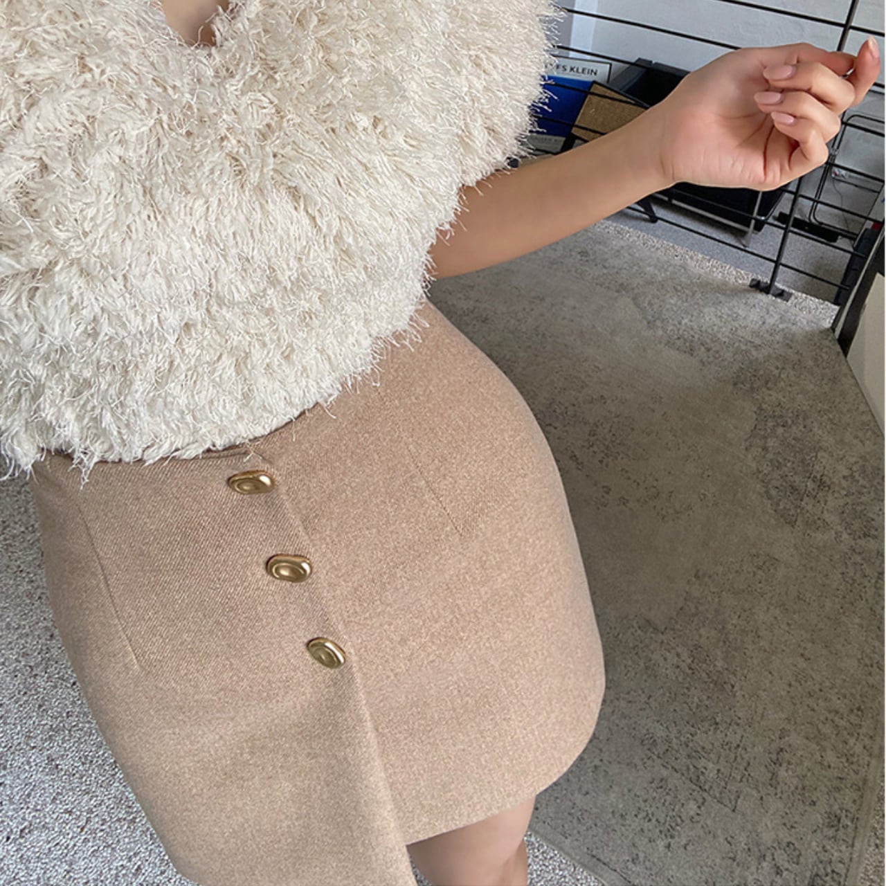 上品なウール調の素材感が魅力のベージュミニスカート。