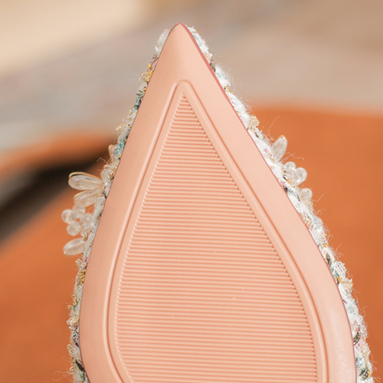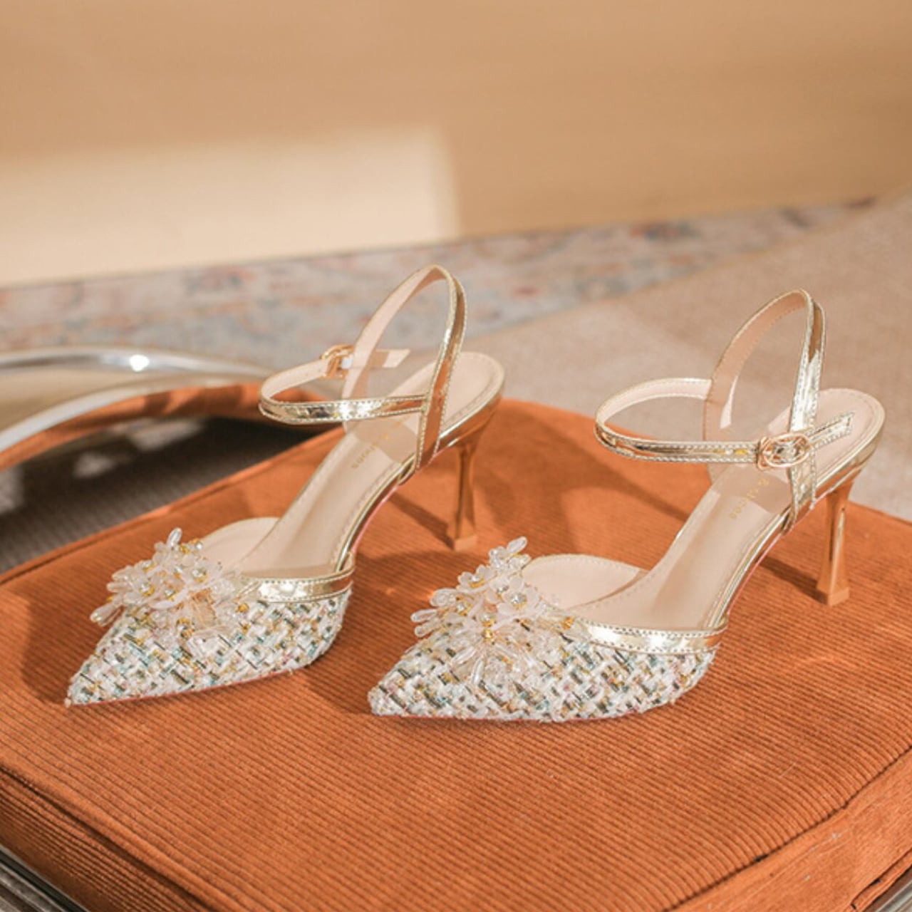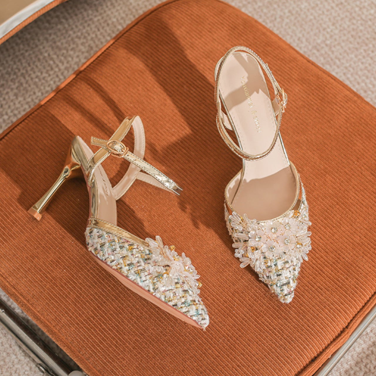 華やかなフラワービジューをあしらったツイードデザインのストラップヒール。