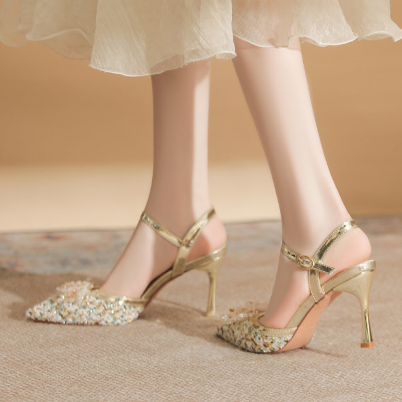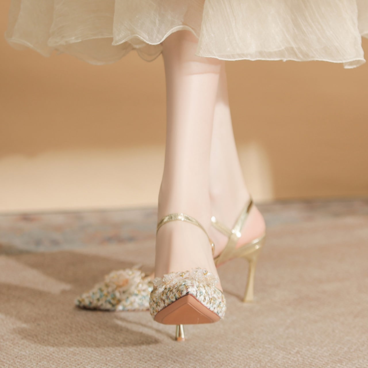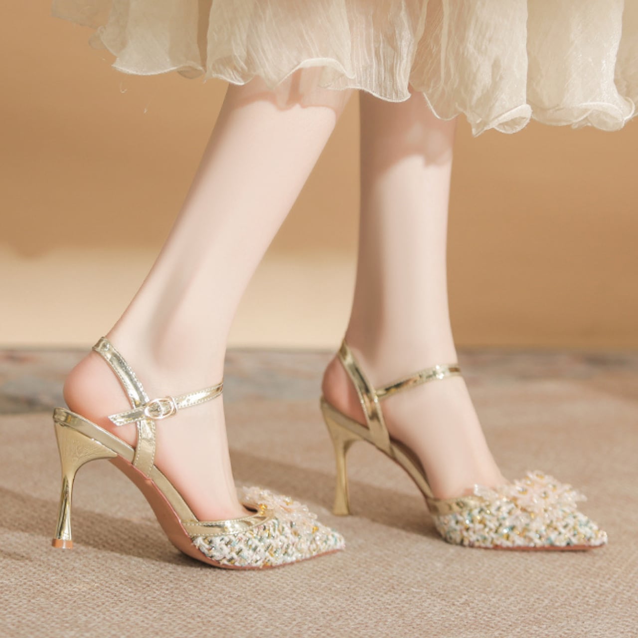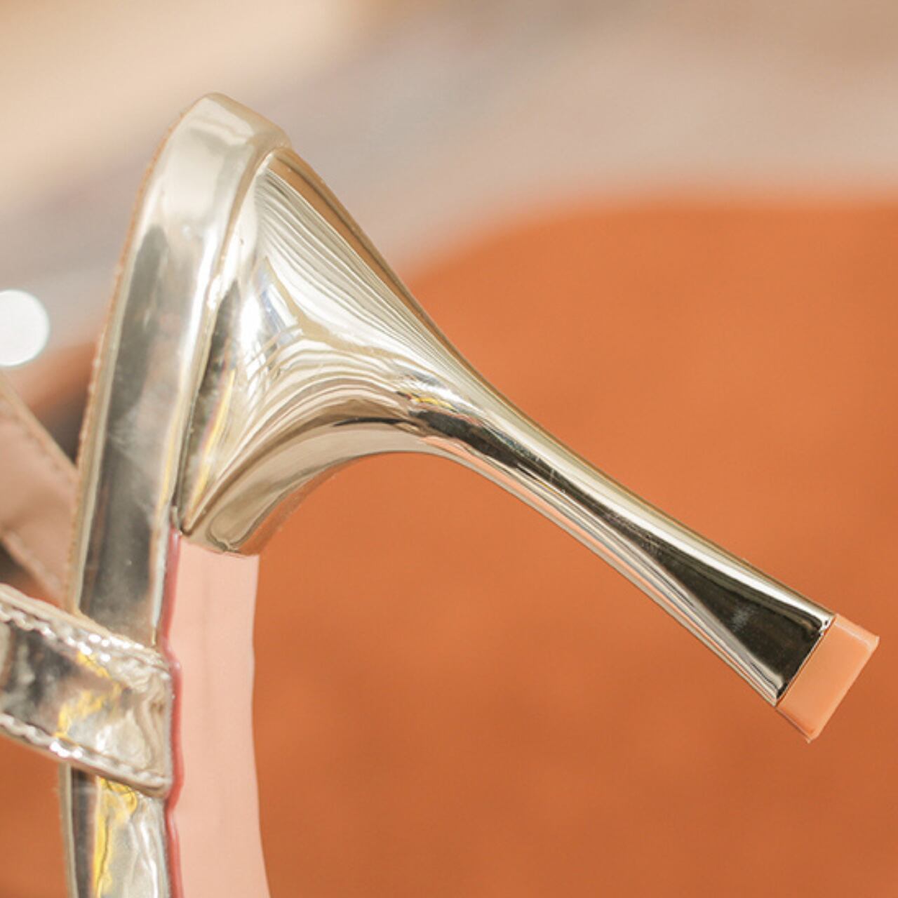ゴールドのストラップが足元をエレガントに演出し、特別な日やパーティーにも映える一足です。柔らかな履き心地と安定感のあるヒールで、見た目の美しさだけでなく実用性も兼ね備えています。