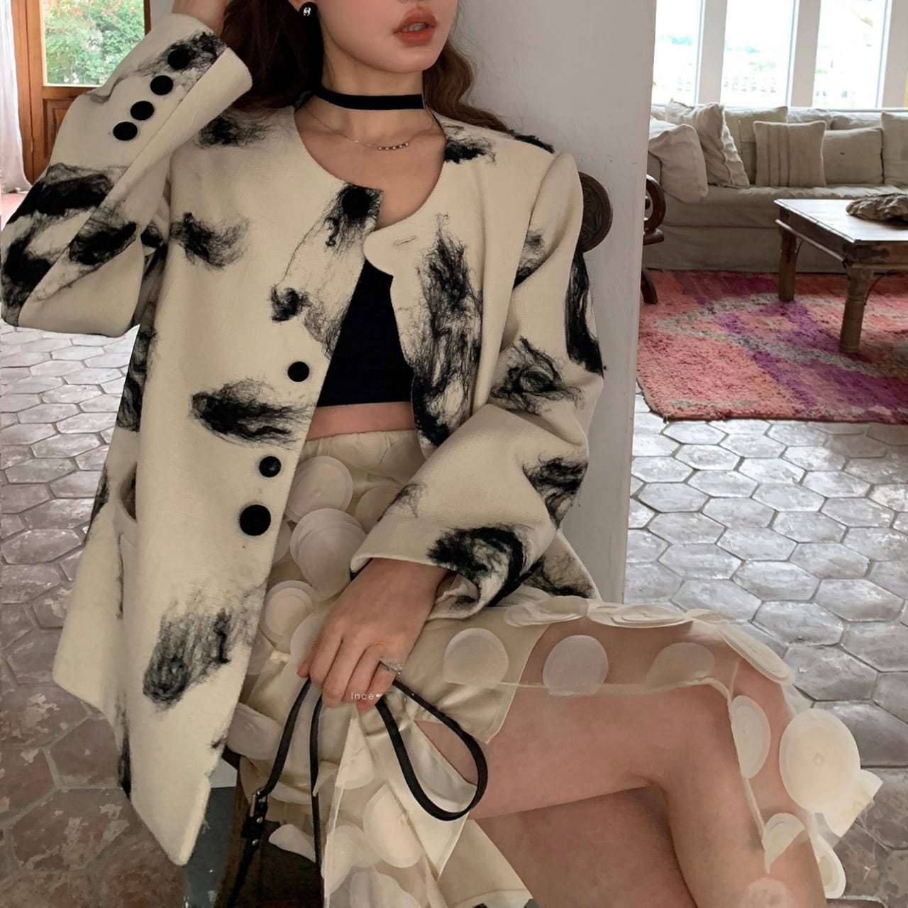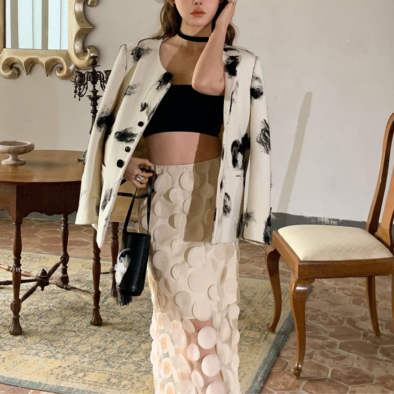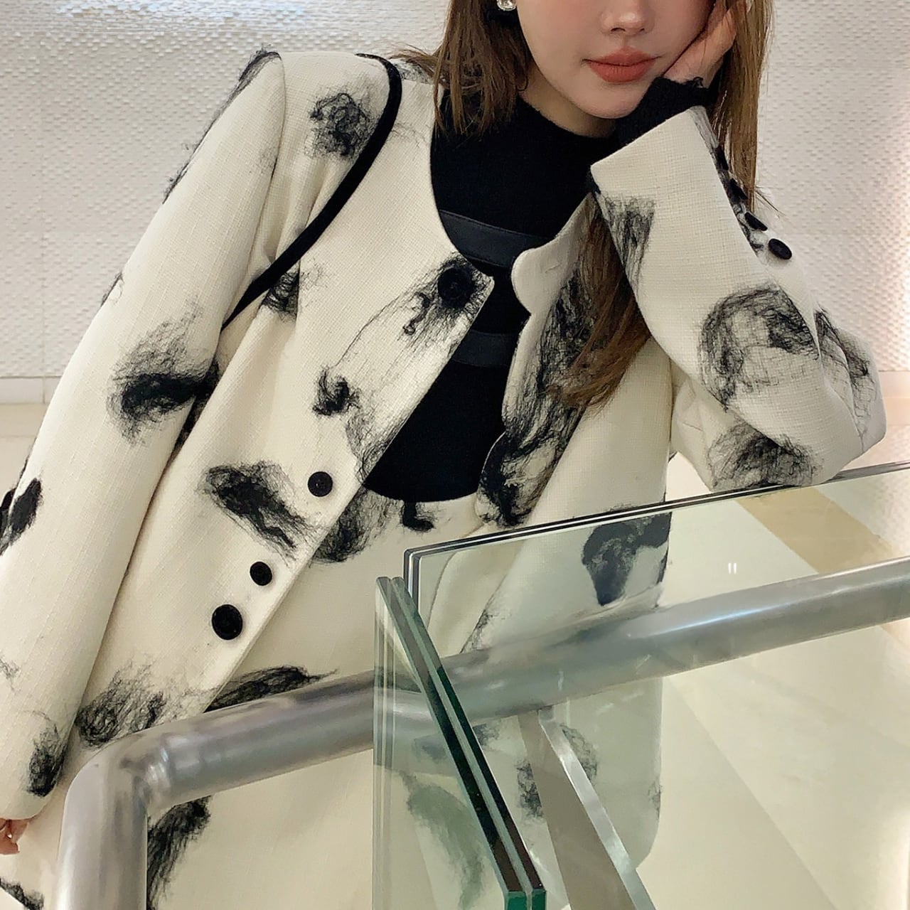 立体的なシルエットと大きめのボタンがアクセントとなり、羽織るだけでエレガントな印象に仕上がります。特別なお出かけにはもちろん、シンプルなコーディネートに合わせても洗練されたスタイルを演出します。