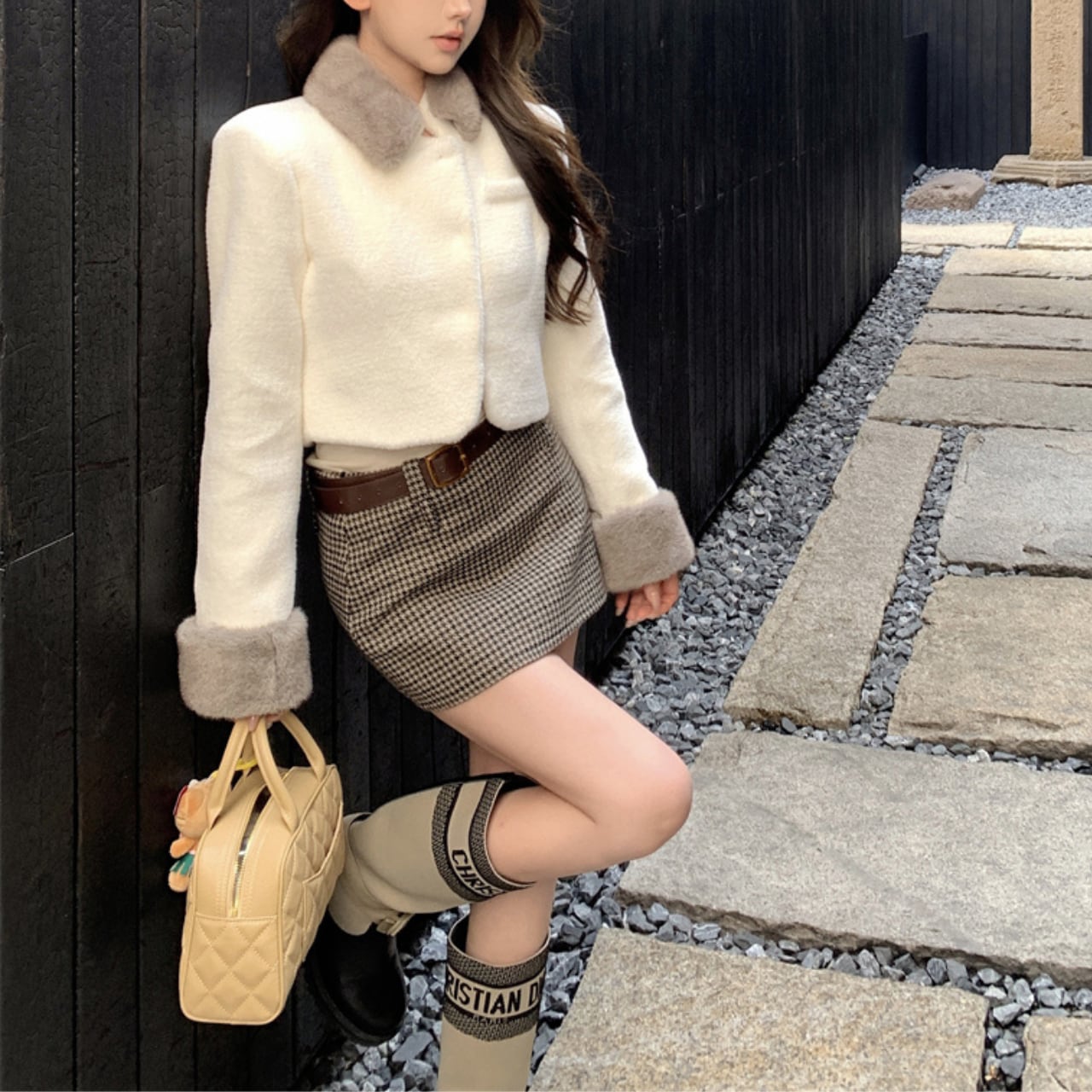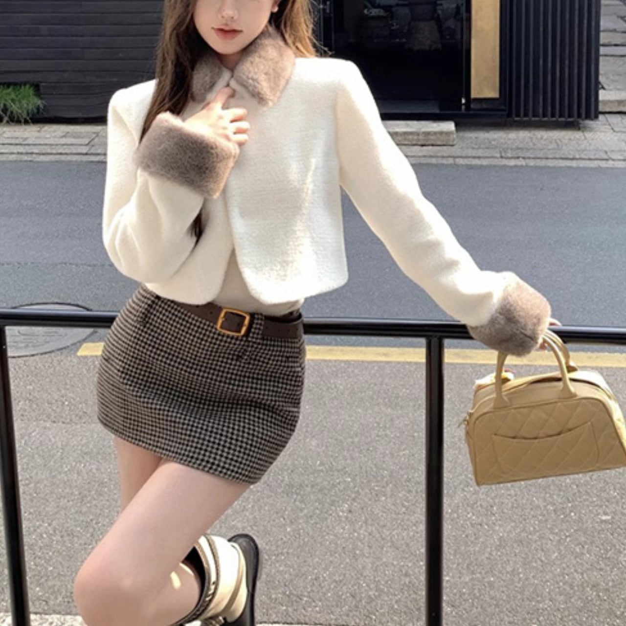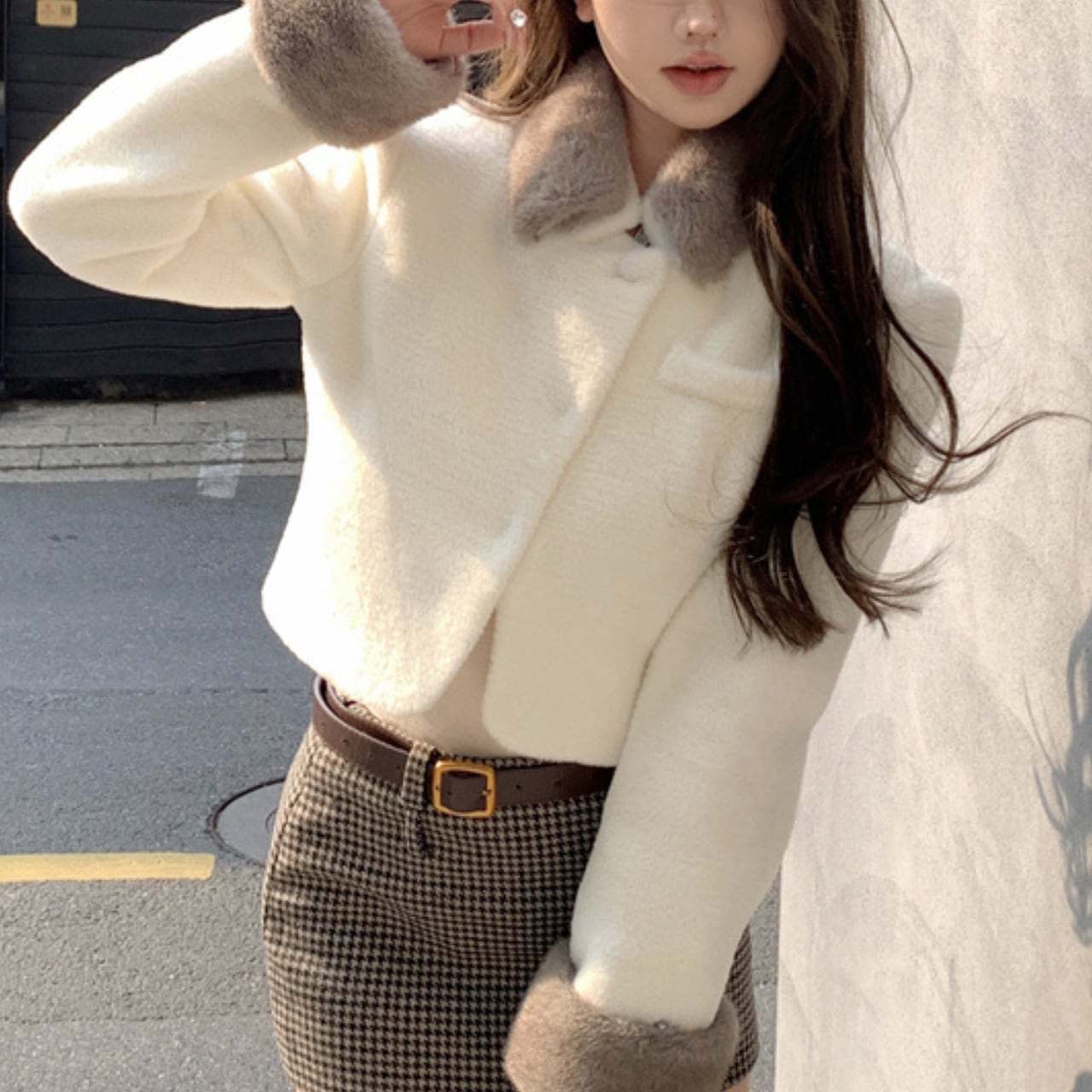上品なショート丈シルエットに、襟と袖口のフェイクファーが華やかさを添えるジャケット。