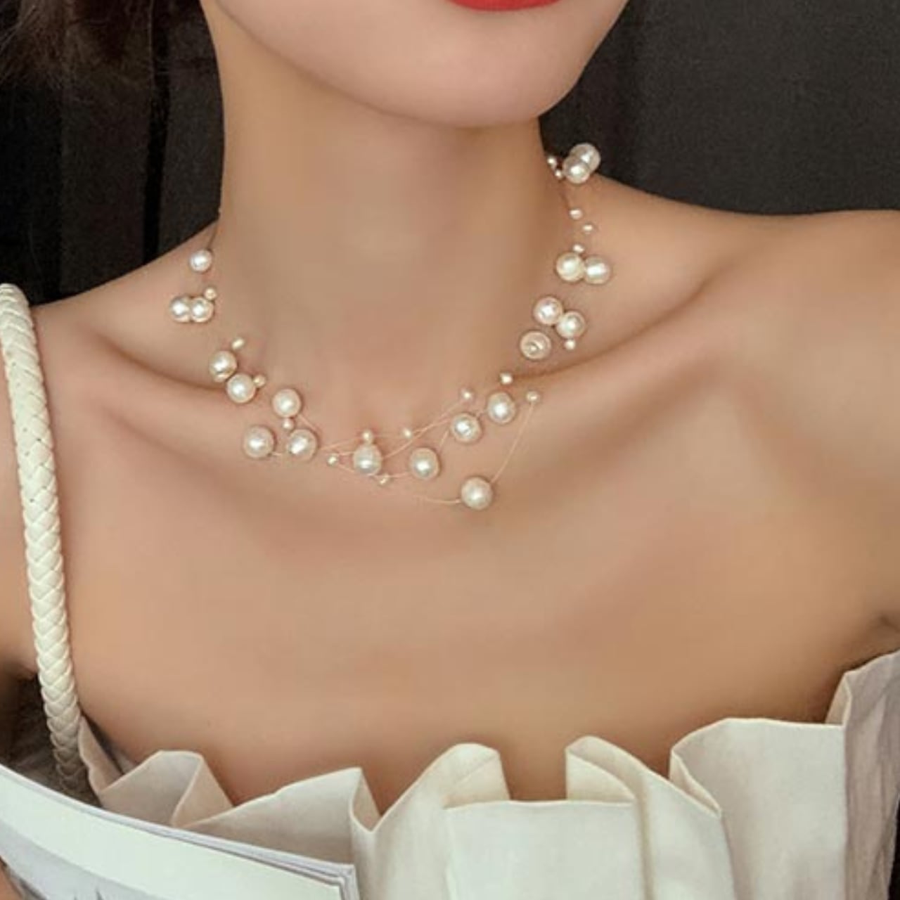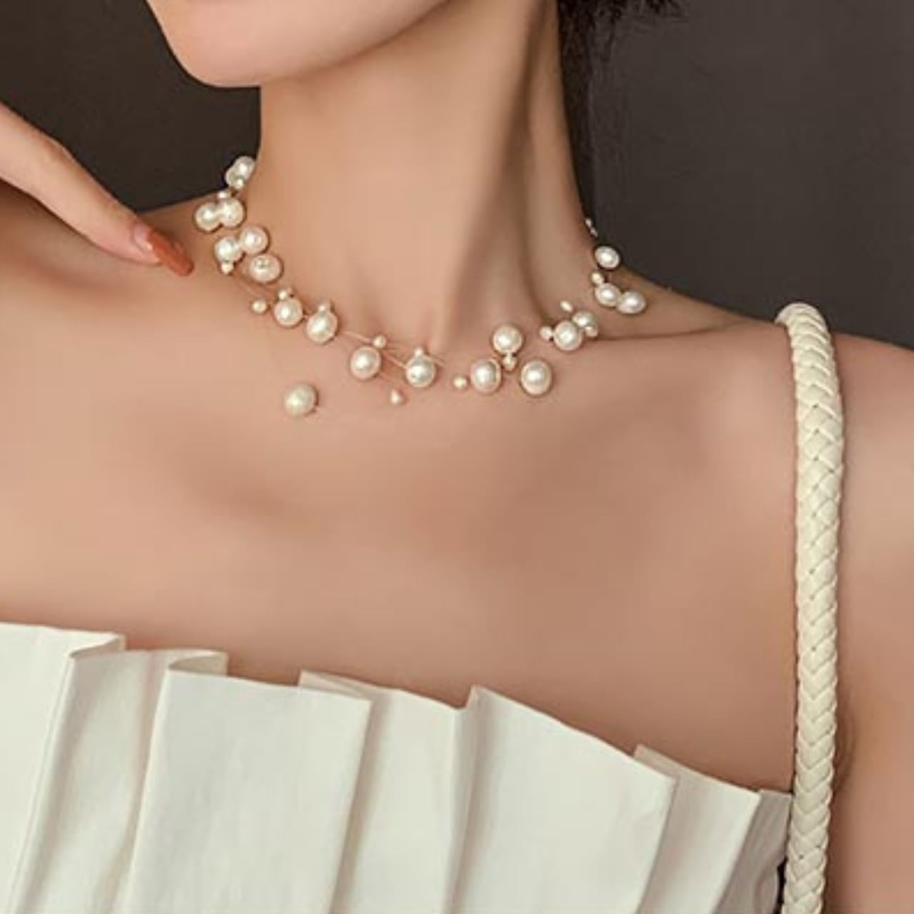 自然のパールならではのやわらかな輝きが、デコルテを華やかに引き立てます。