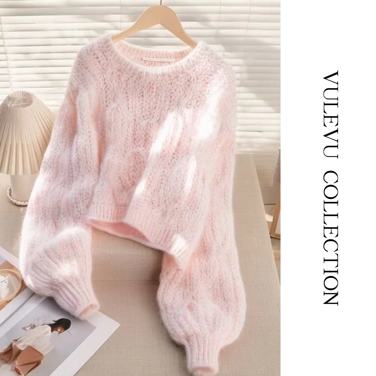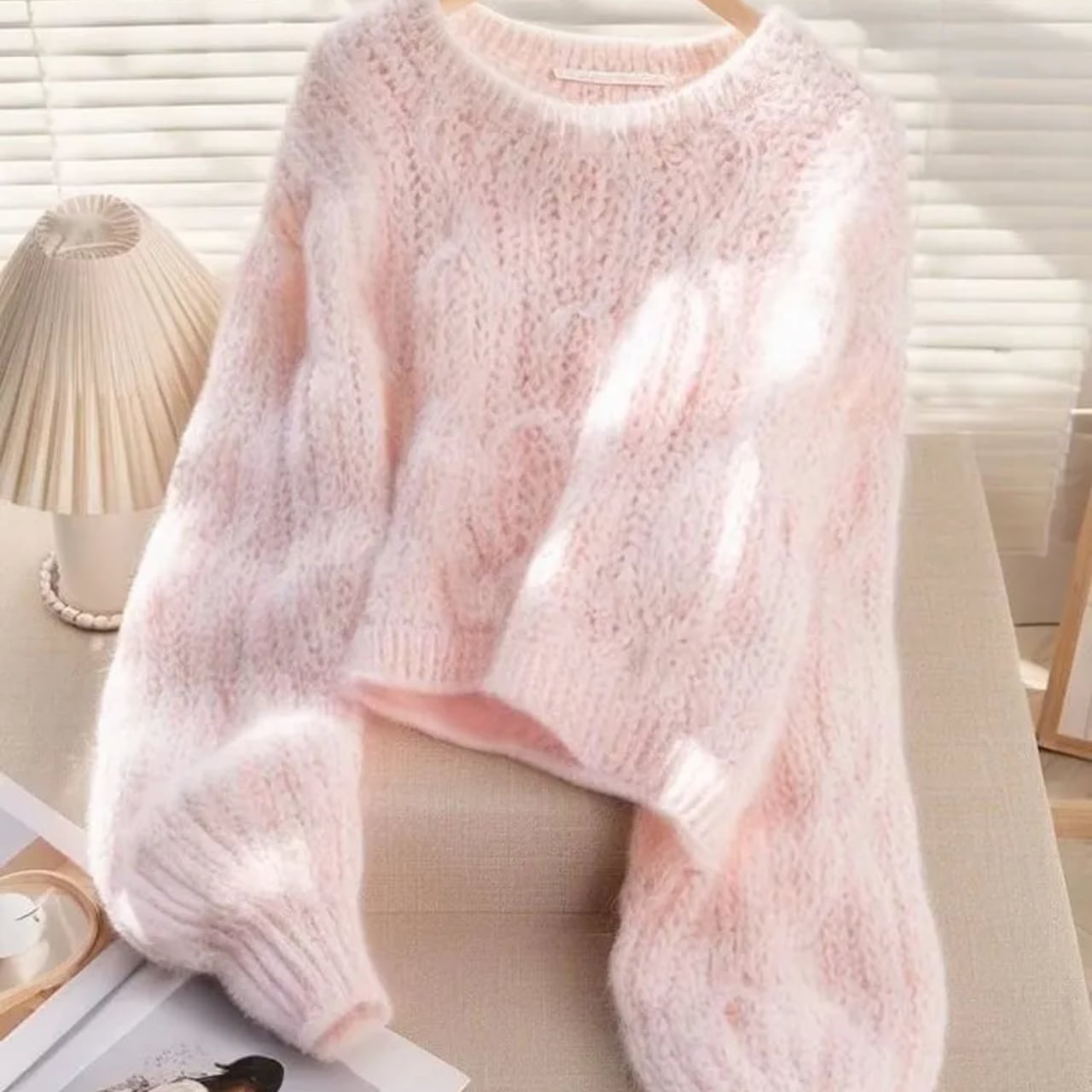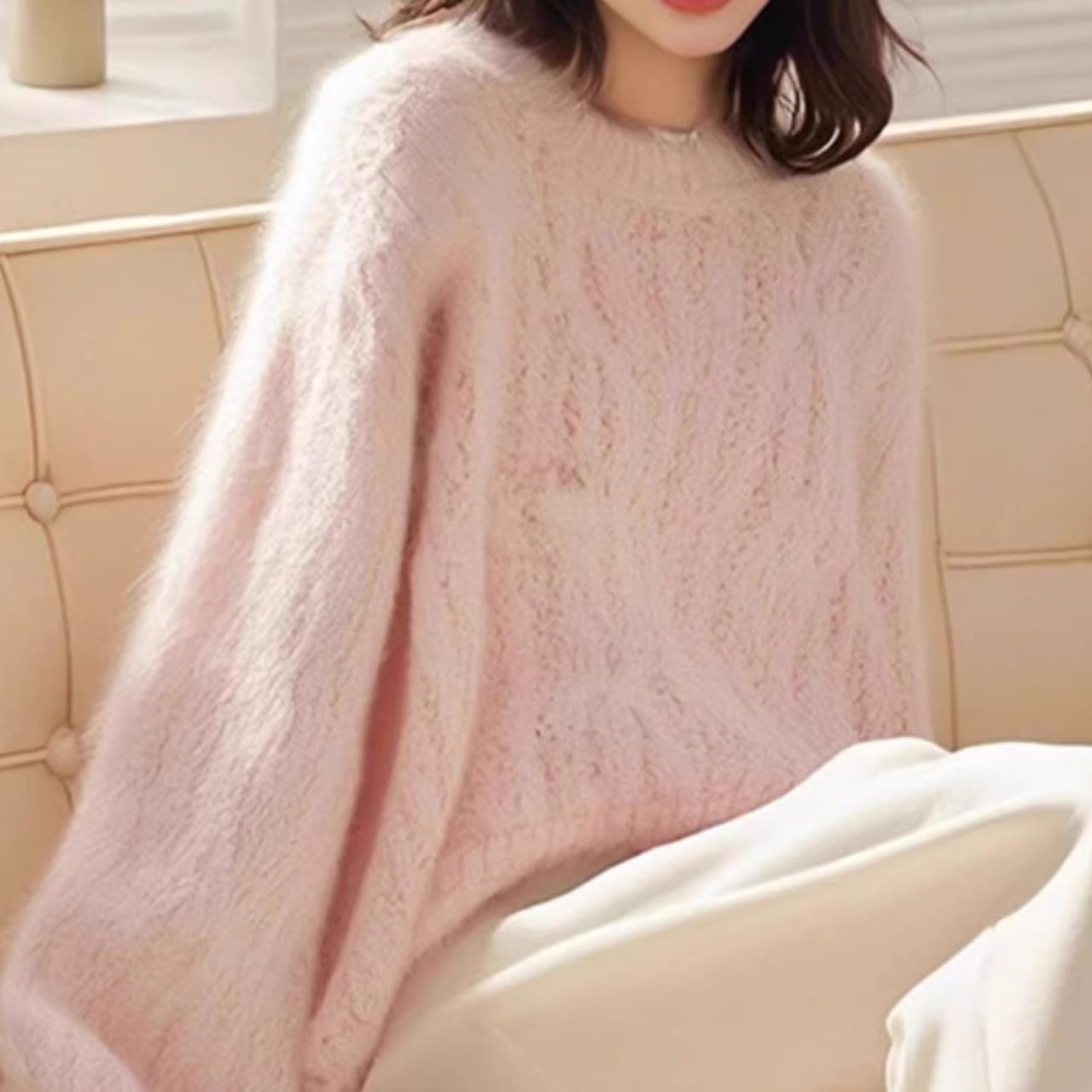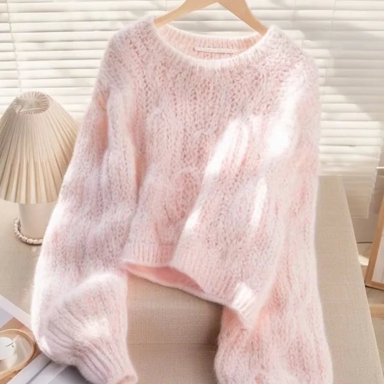柔らかくふんわりとしたペールピンクのニットプルオーバー。