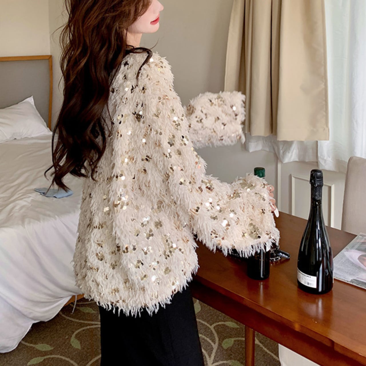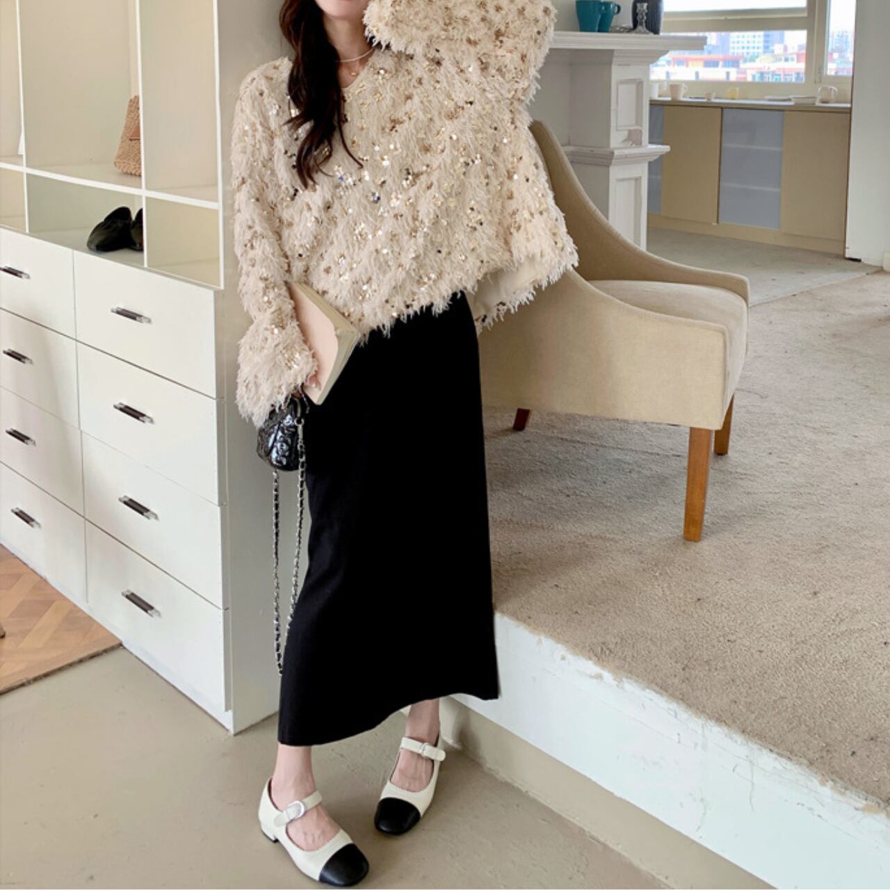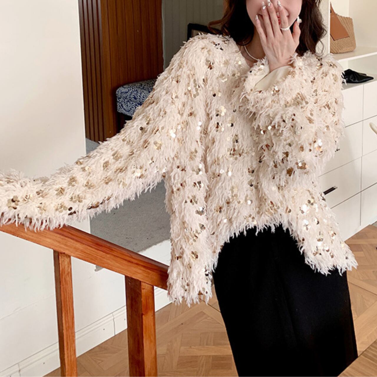 ふわりと立体感のあるフェザー調ニットに、光を受けて煌めくスパンコールをあしらったニットトップス。