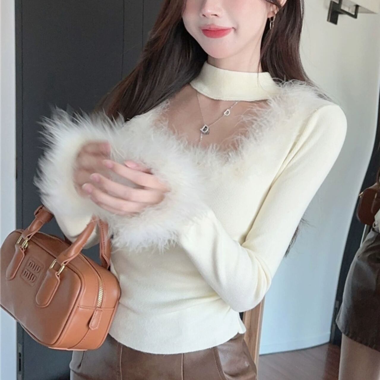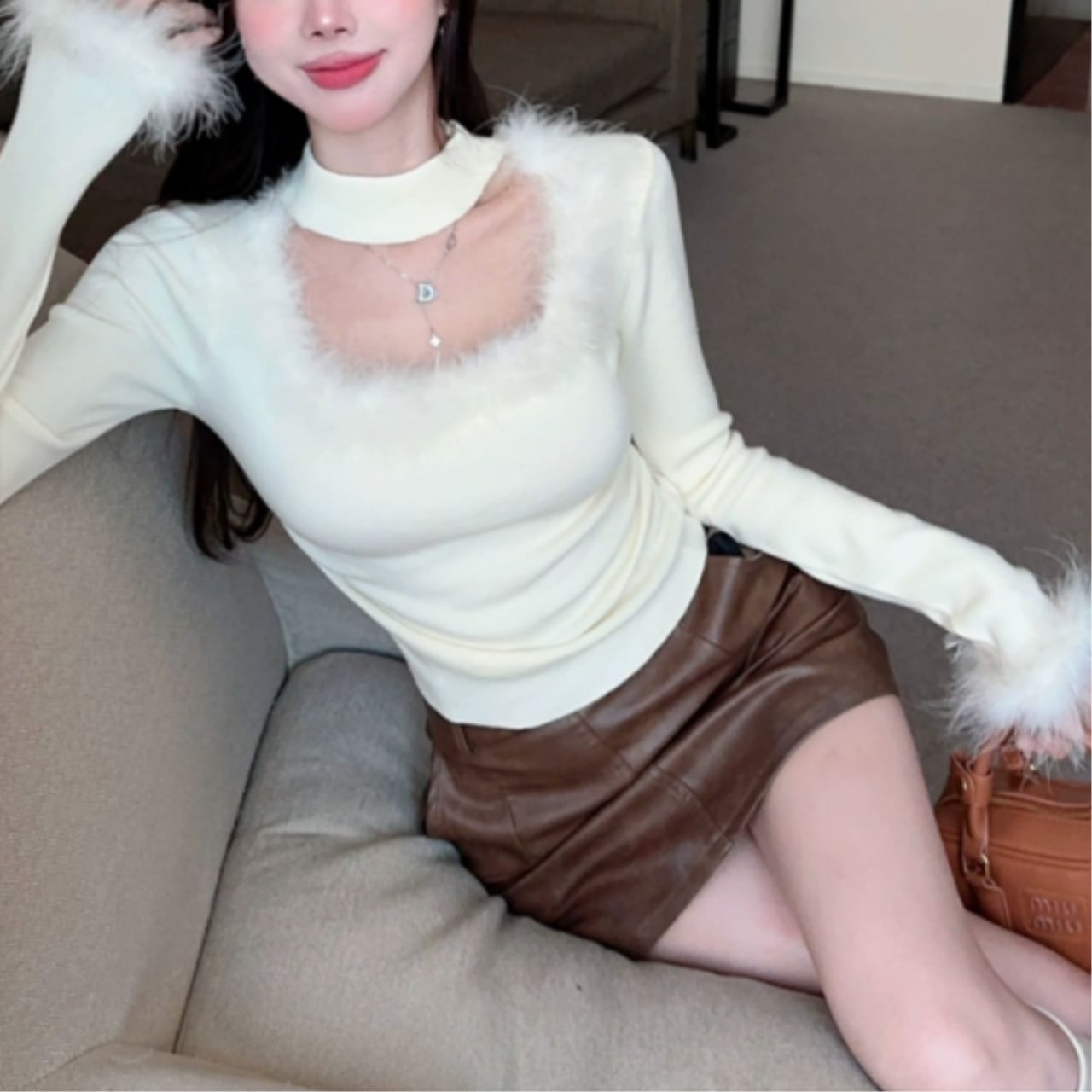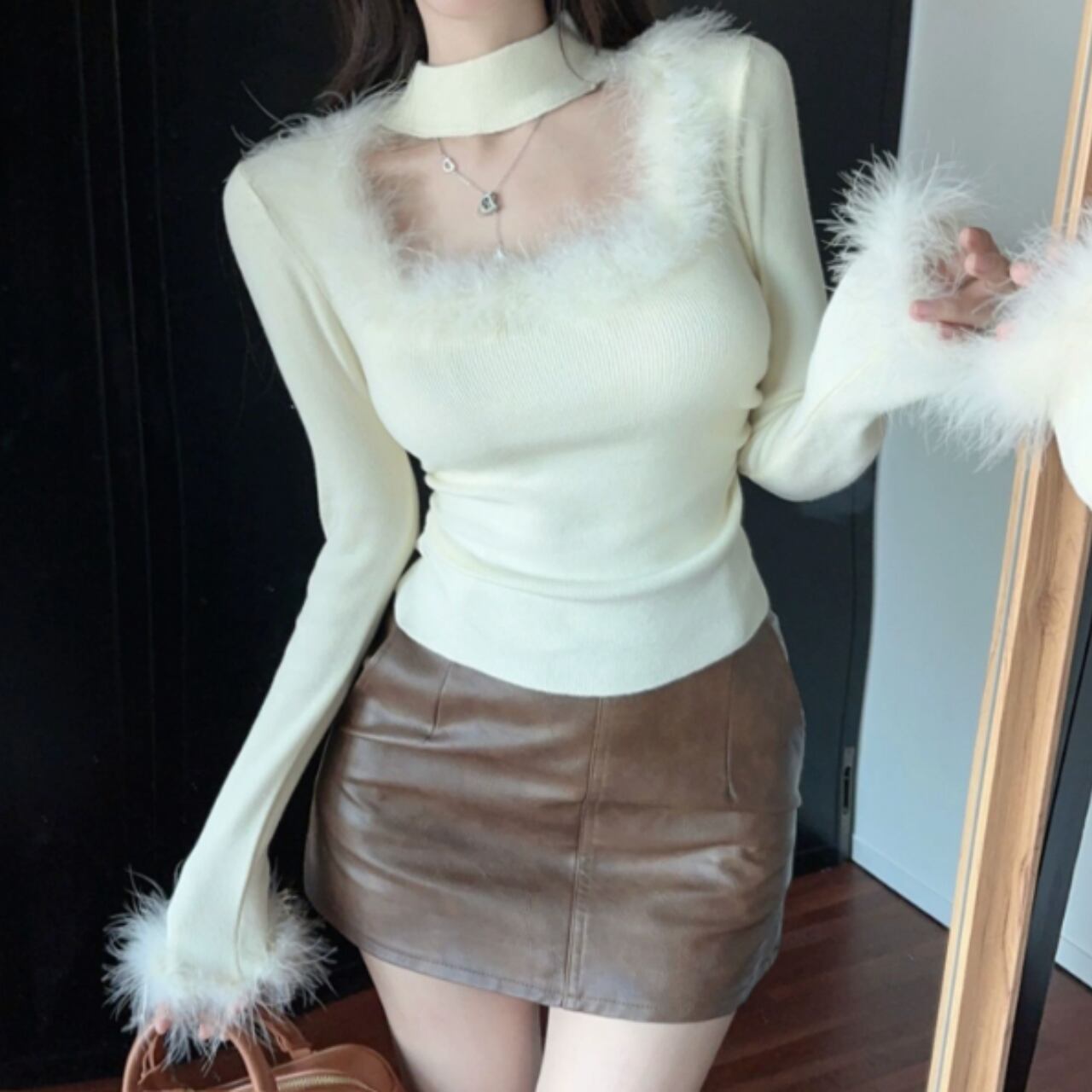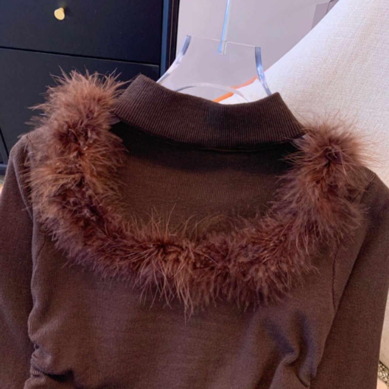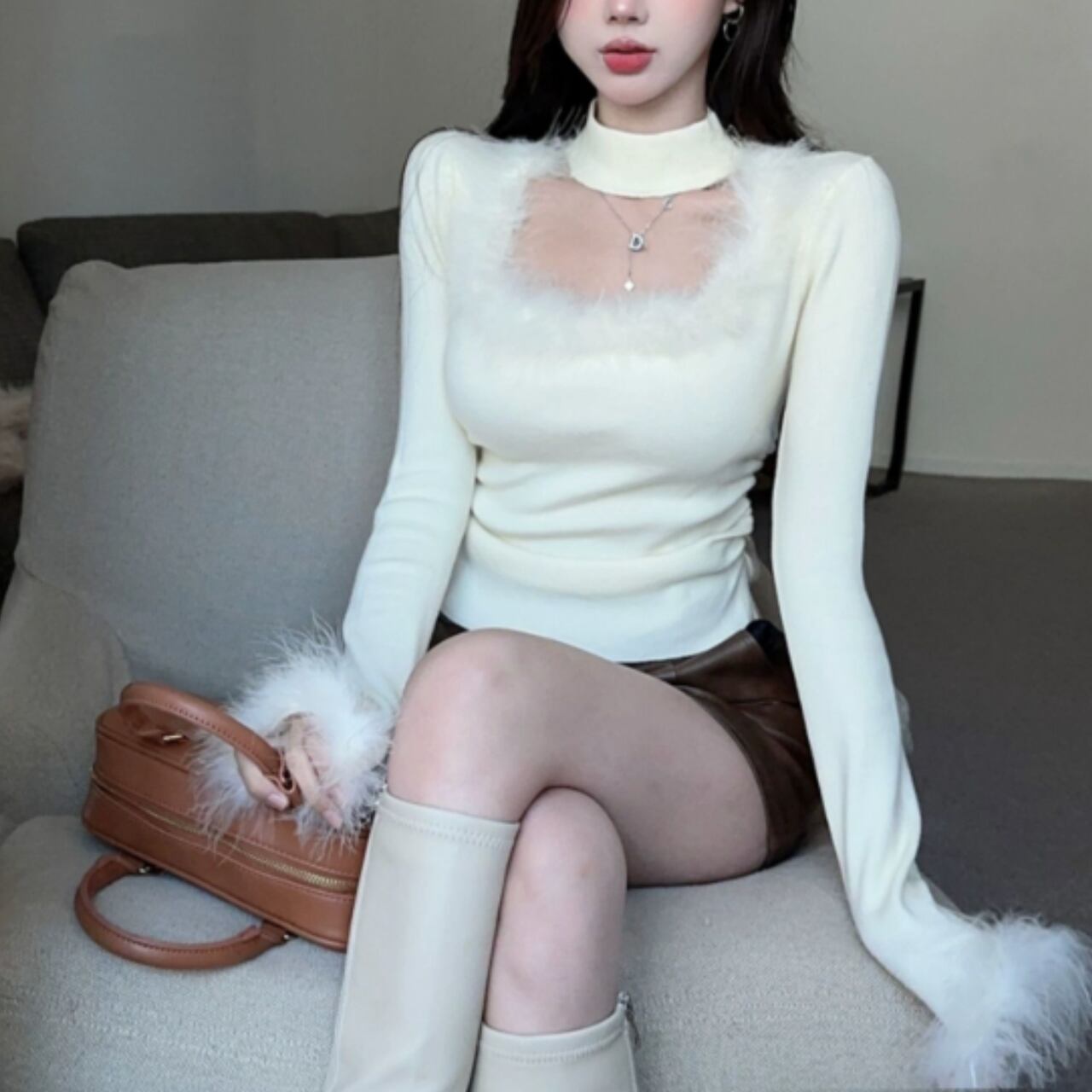 上品なスクエアネックラインにフェザーをあしらった、華やぎのあるニットトップス。