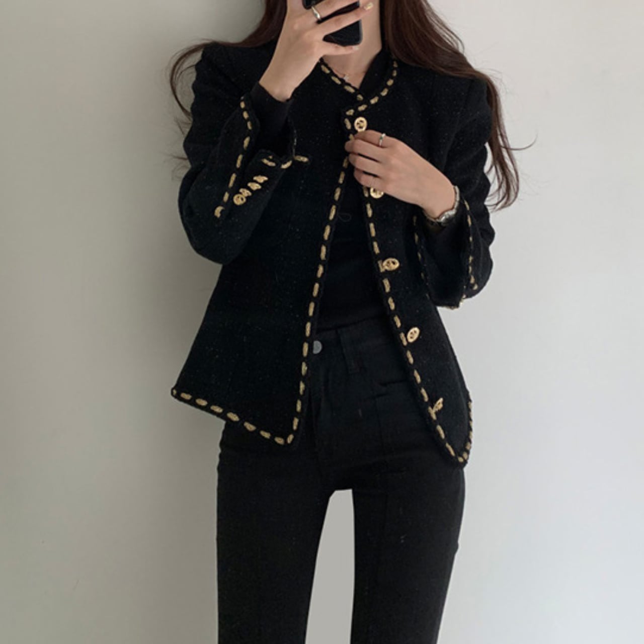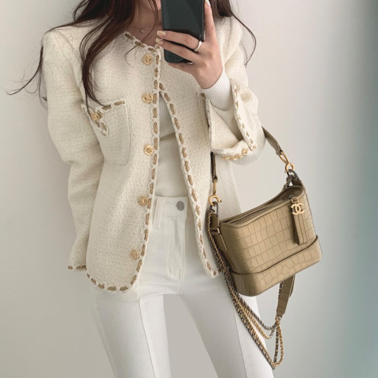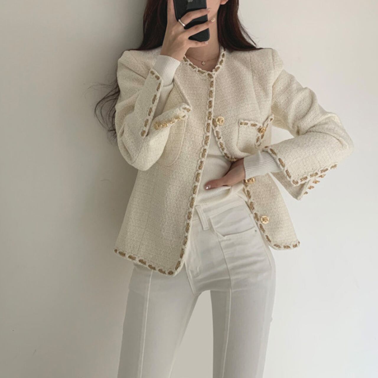 上品なツイード素材にゴールドのトリムとボタンをあしらった、クラシカルで華やかなジャケット。丸みのある上品な襟元と、ゴールドのメタルボタンがラグジュアリーな印象を与えます。